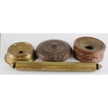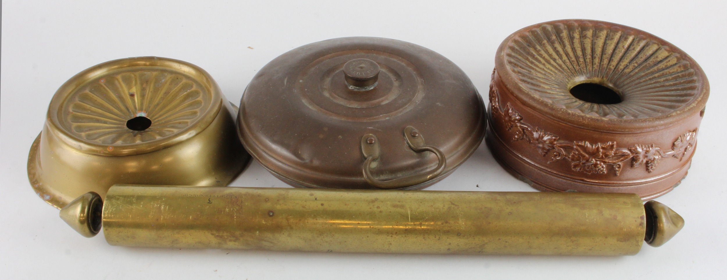 19th c. stone-ware pottery spittoon (some damages), an early brass spittoon, a brass rolling pin and a brass bed warmer