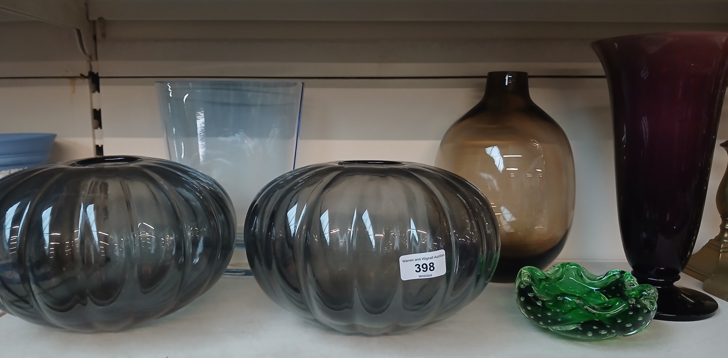 6 pieces of coloured glass ware including controlled bubble ash tray, a pair of smoked glass bowls, and 3 vases