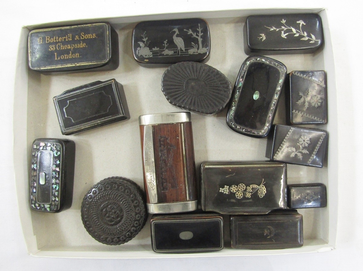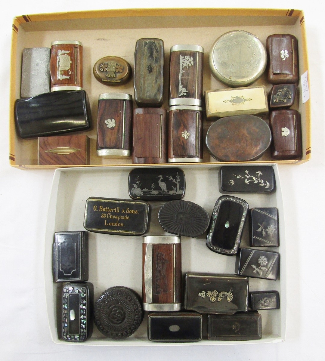 Collection of snuff boxes including papiermache, horn, carved wooden, silver plated and other metals, some with metal or mother-of-pearl inlaid decoration (31)
