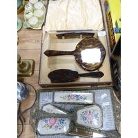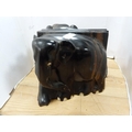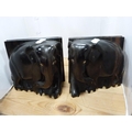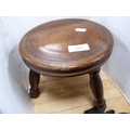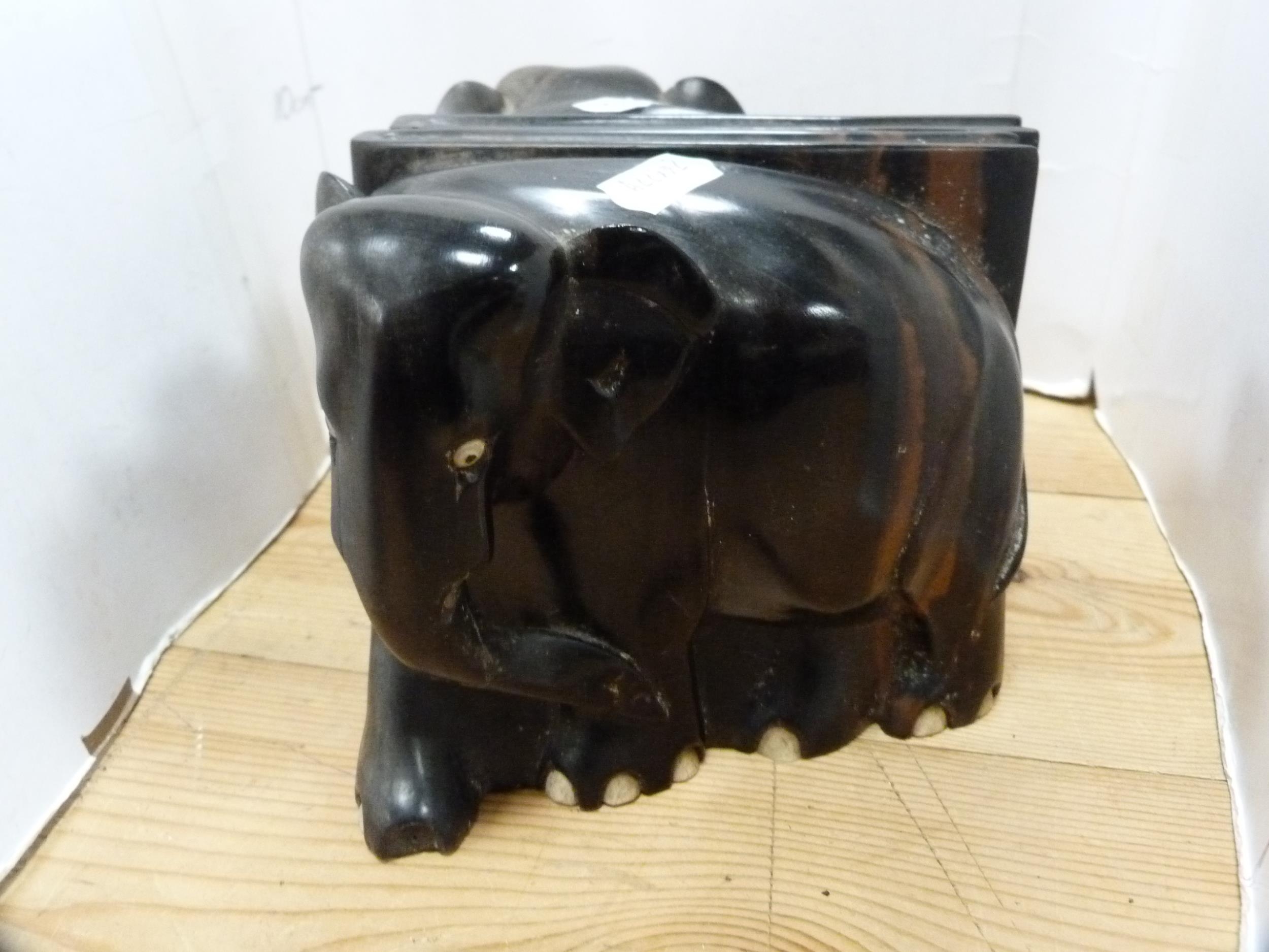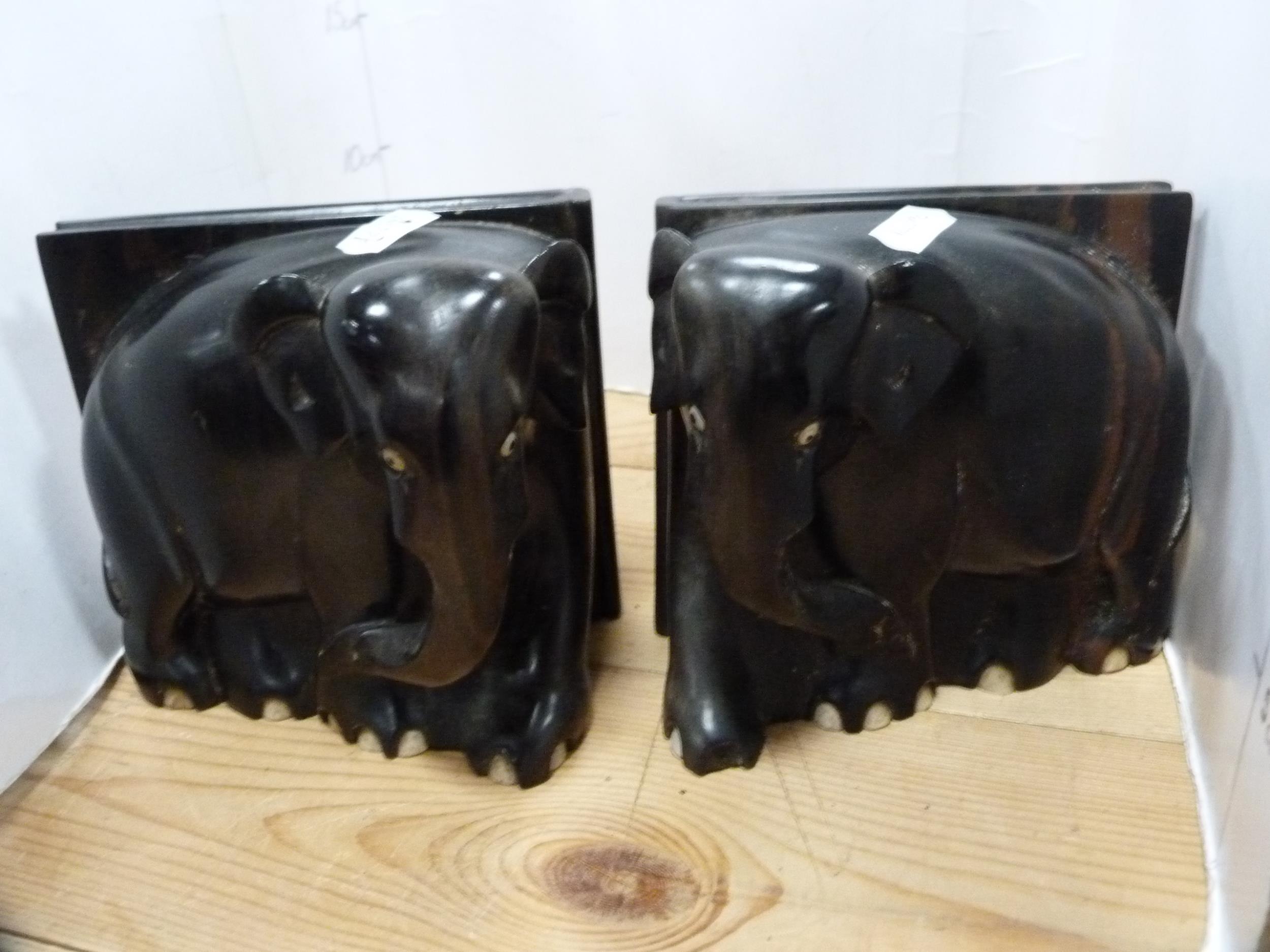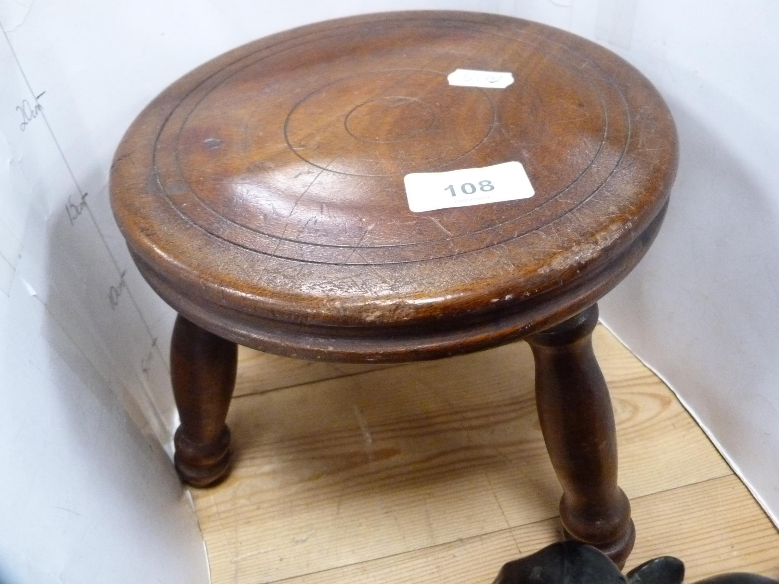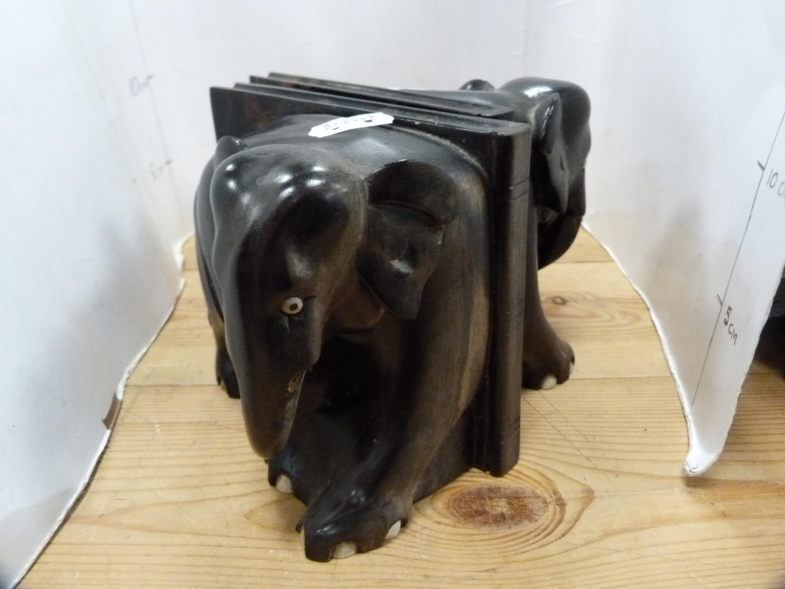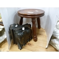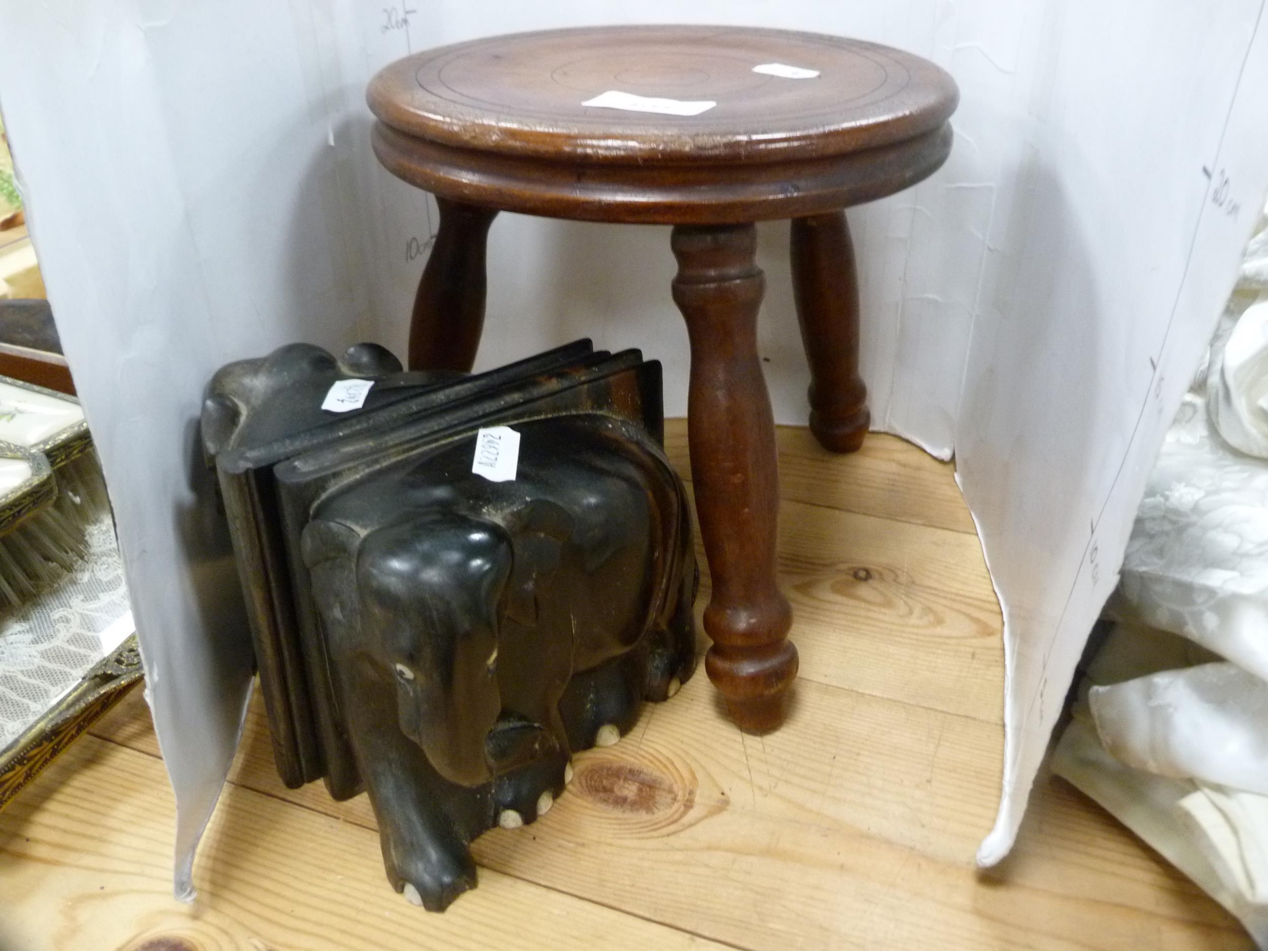 Three-legged milking stool and a pair of ebony elephant bookends.