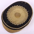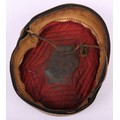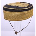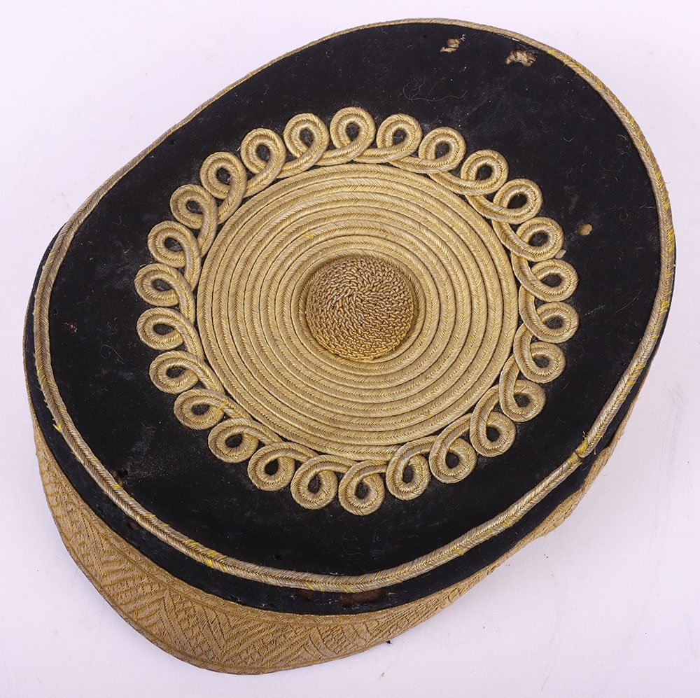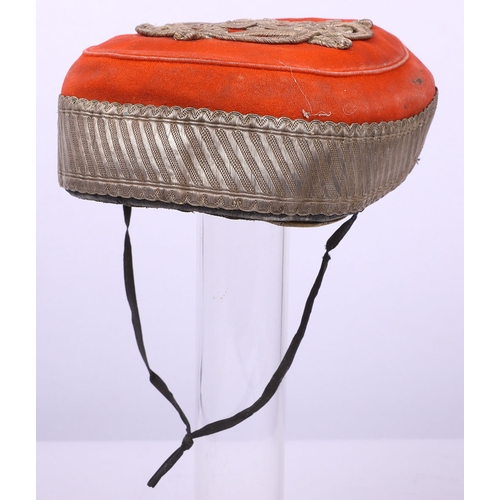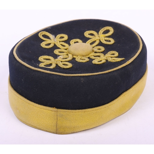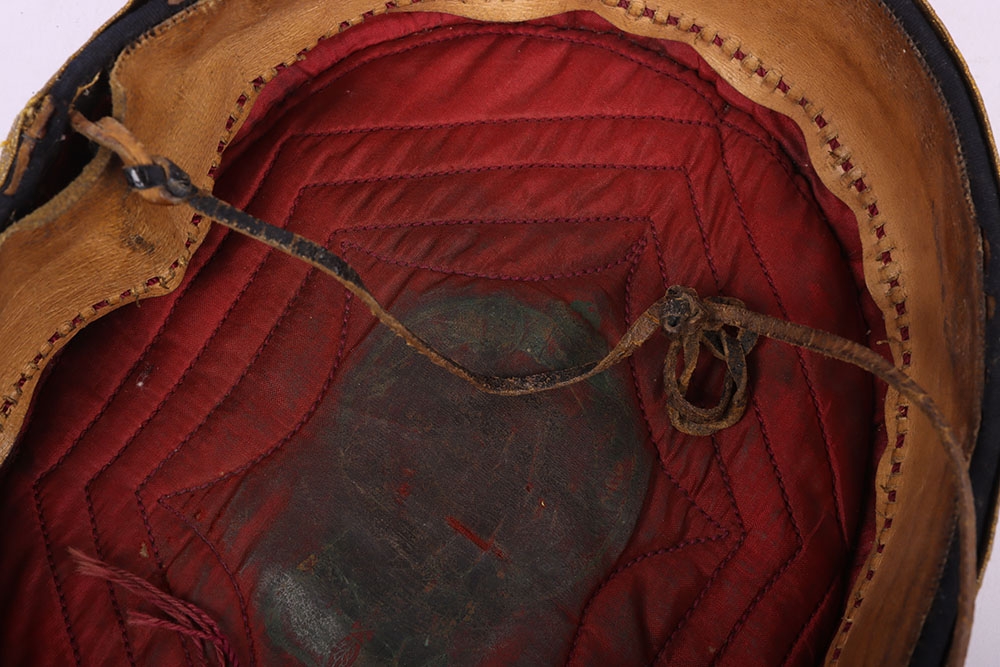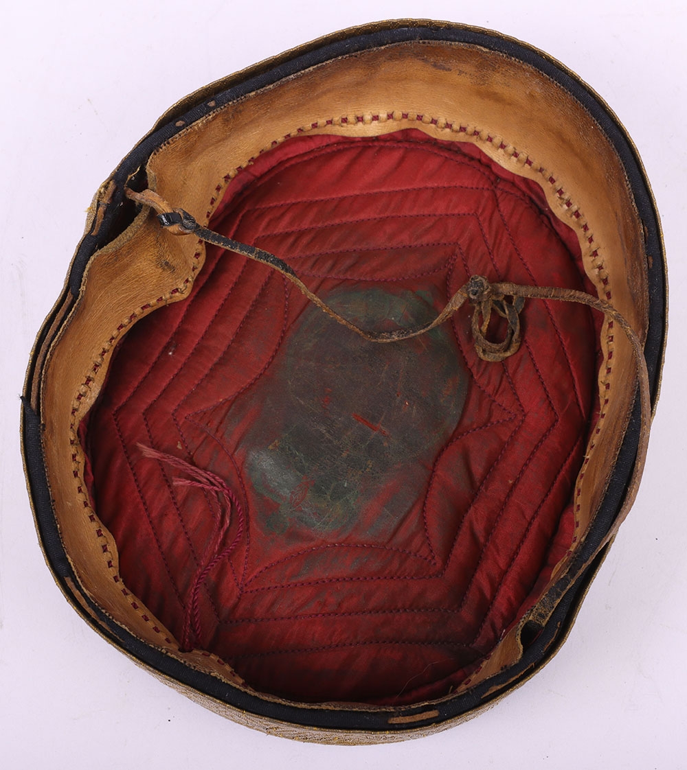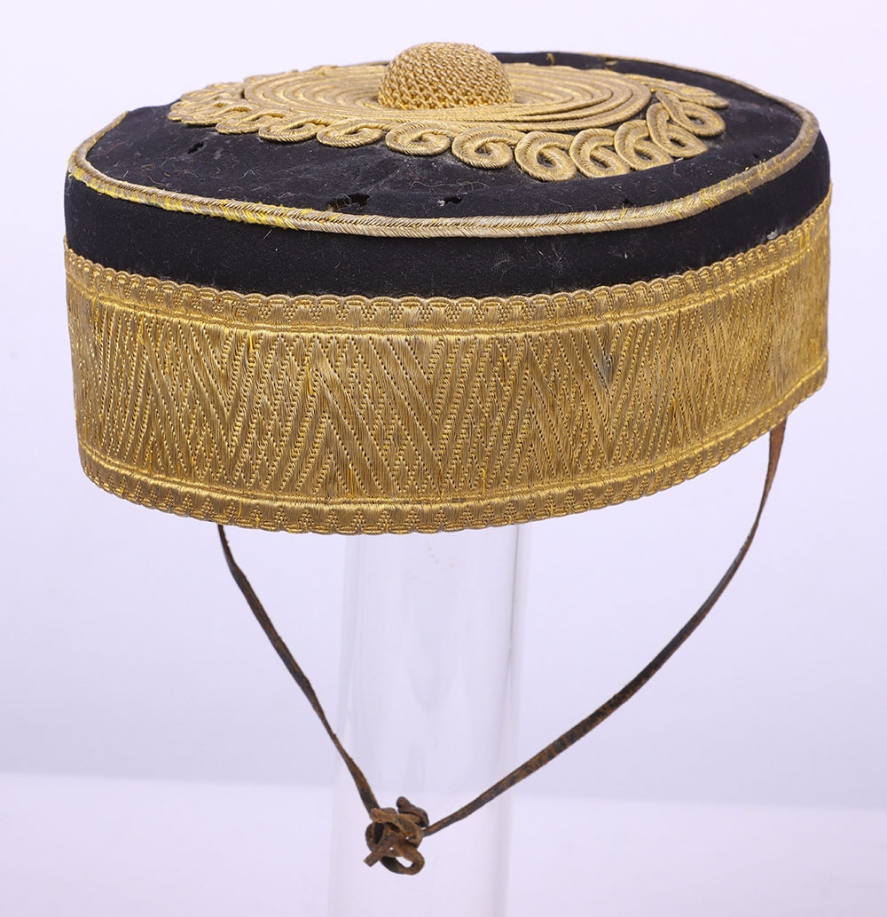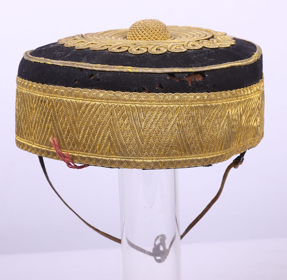 Victorian 20th Hussars Pill Box Cap, blue cloth cap with thick regimental lace band, knotted cord top and bullion cord decoration. Tan leather sweatband and quilted cloth lining to the interior. Leather chinstrap present but damaged. Some moth damage.
