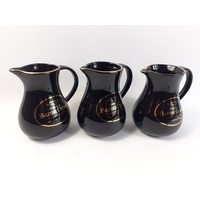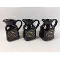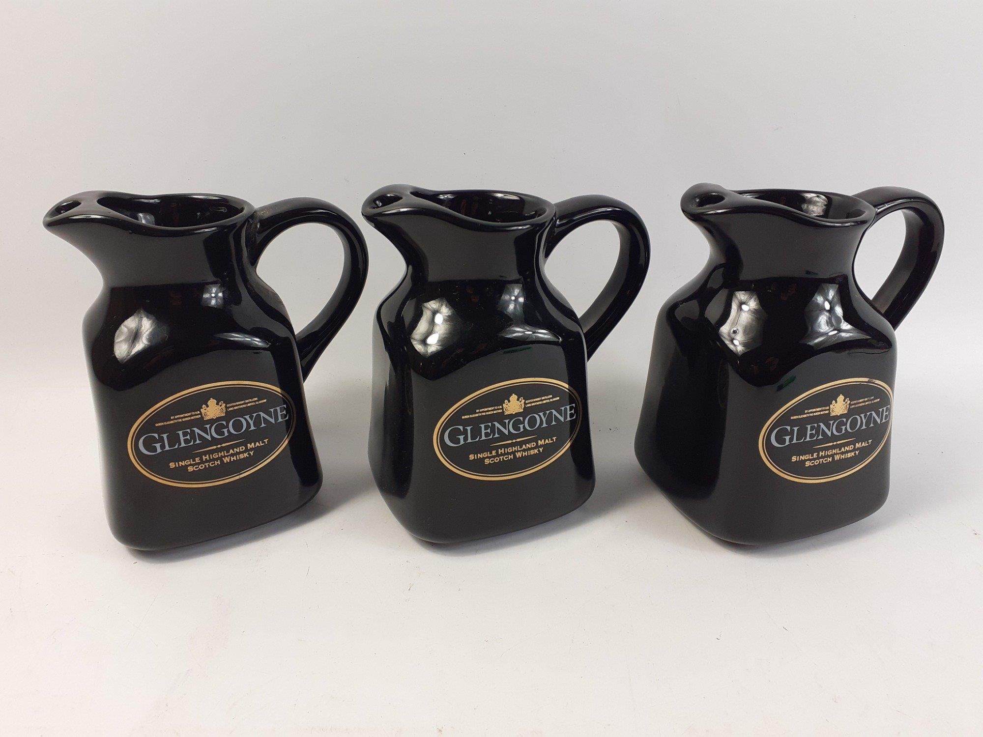 GLENGOYNE single Highland malt whisky medium sized water jugs x 3qty - all with white and gold logo on black background - all three in good condition with no cracks, chips or signs of damage repair