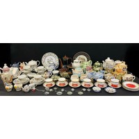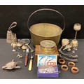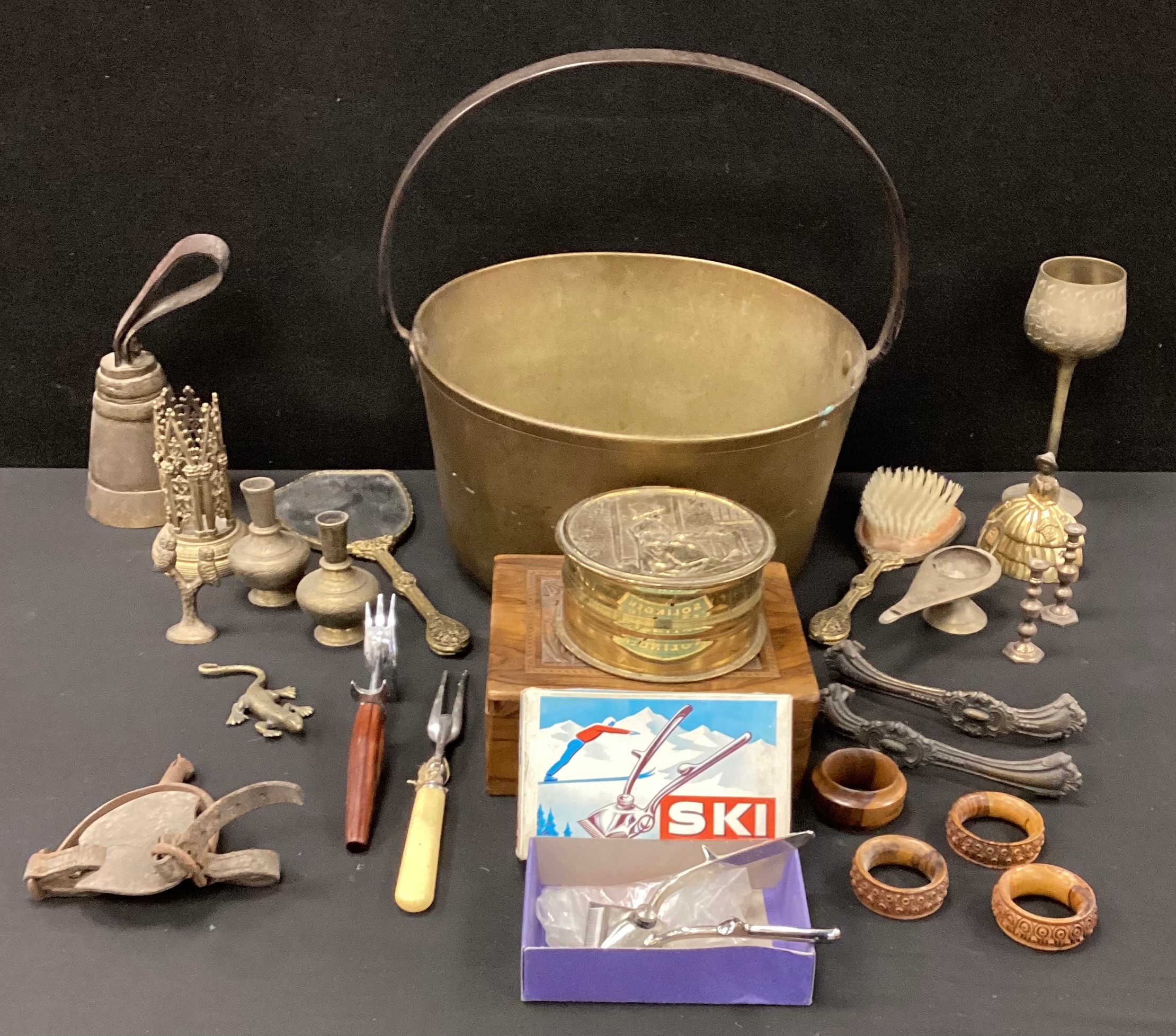 Metalware/treen - a gothic spill holder, preserve pan, conical hand bear, handles, Jerusalem box, napkin rings, metal and bamboo nightwatch mans mace or staff head, 60cm long, etc, qty.