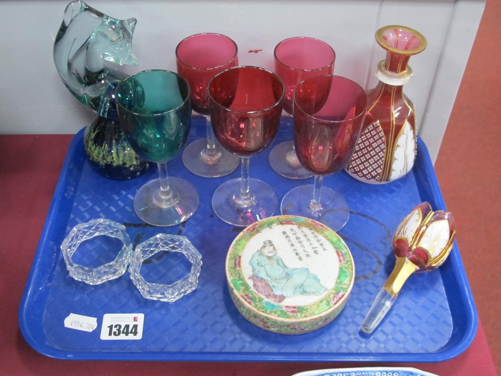 Bohemian Overlaid Glass Scent Bottle and Stopper, (damaged), Mdina seahorse, wine glasses, Cantonese jar cover:- One Tray.