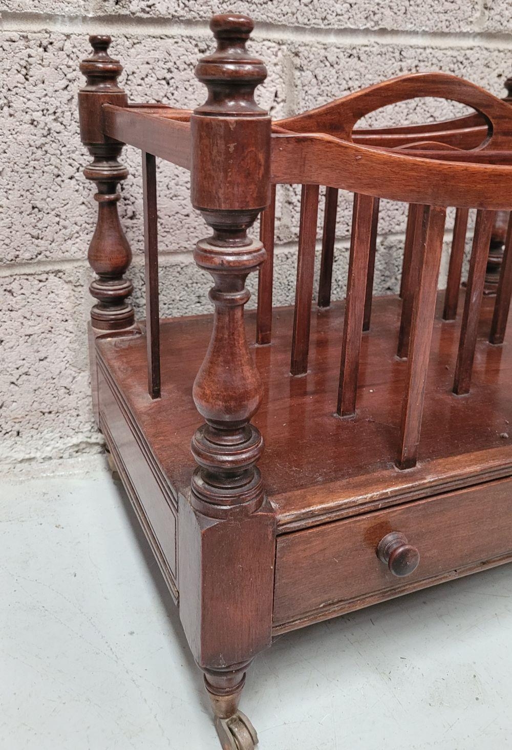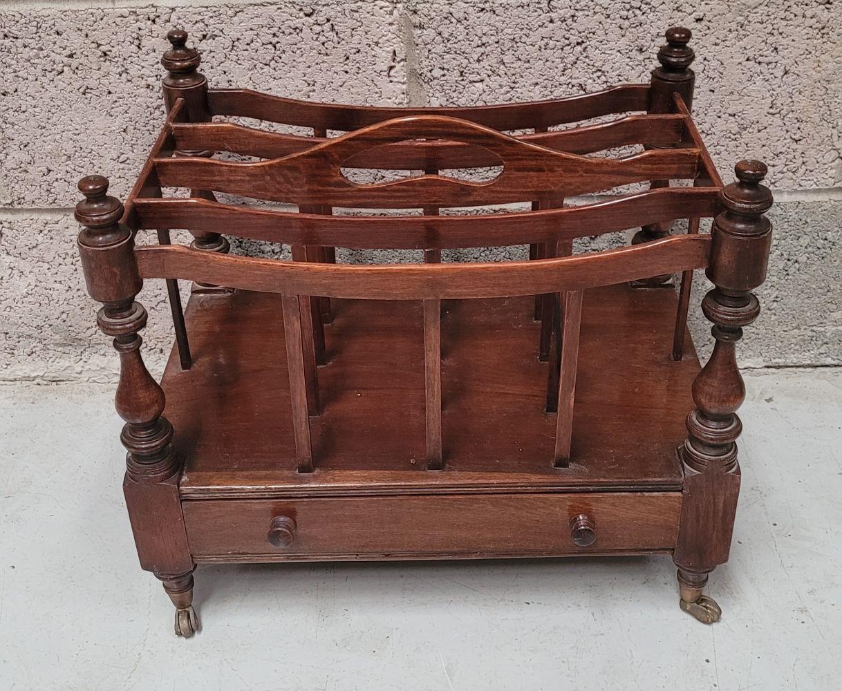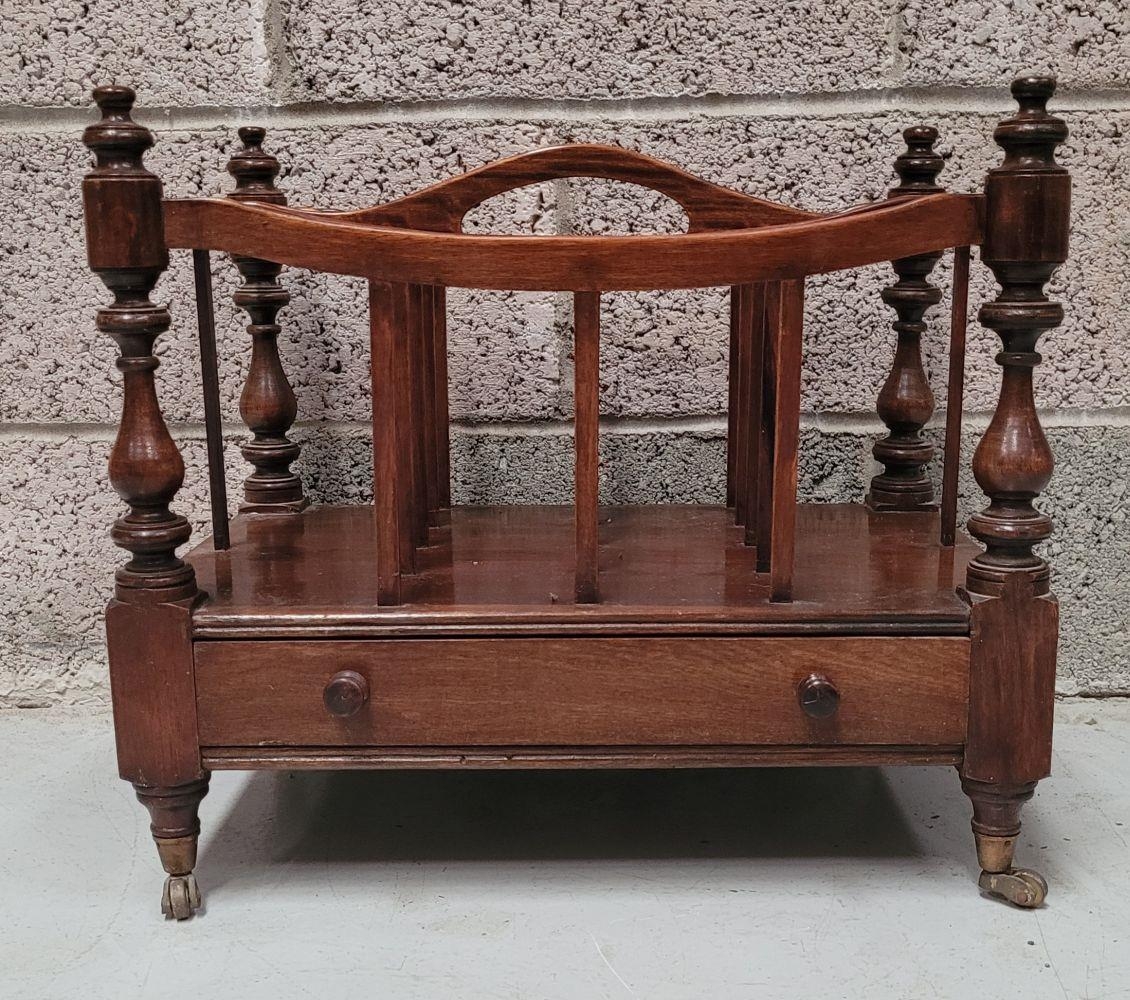 A VERY GOOD QUALITY 19th CENTURY MAHOGANY CANTEBURY BOOK/MAGAZINE RACK, with four turned uprights that support the central four sections for storing your magazines/papers etc. A single drawer beneath for extra storage, which has two turned pull handles – one needs securing. All raised on short turned legs terminating on brass castors. A fine piece of antique functional furniture. Dimensions: 50 x 35 x 44cm (W x D x H).