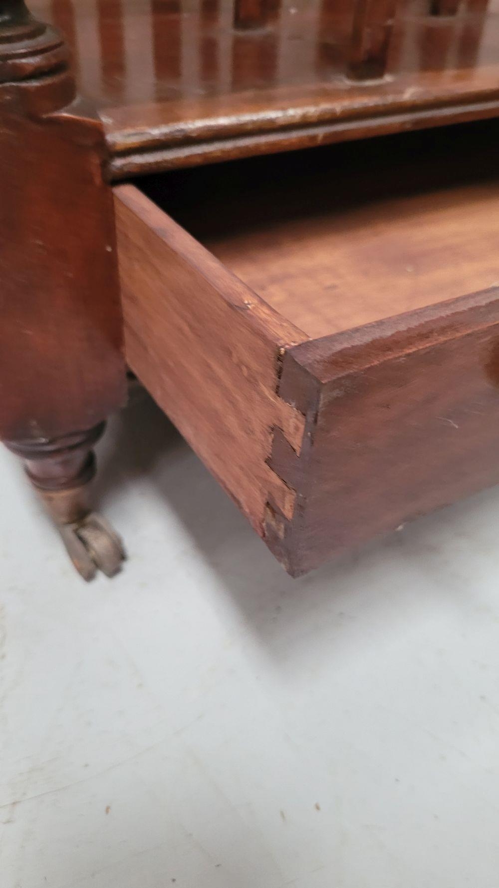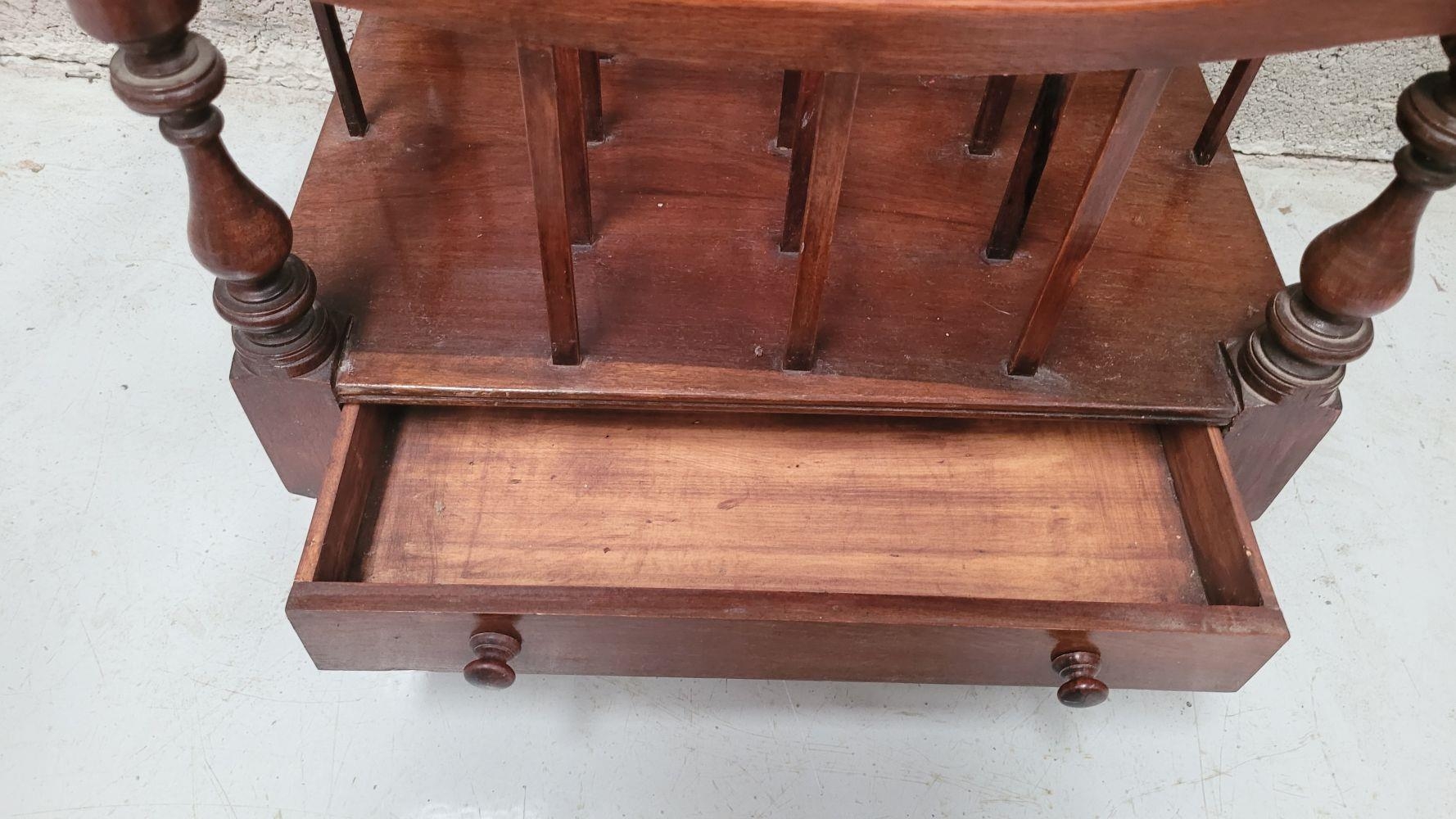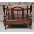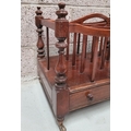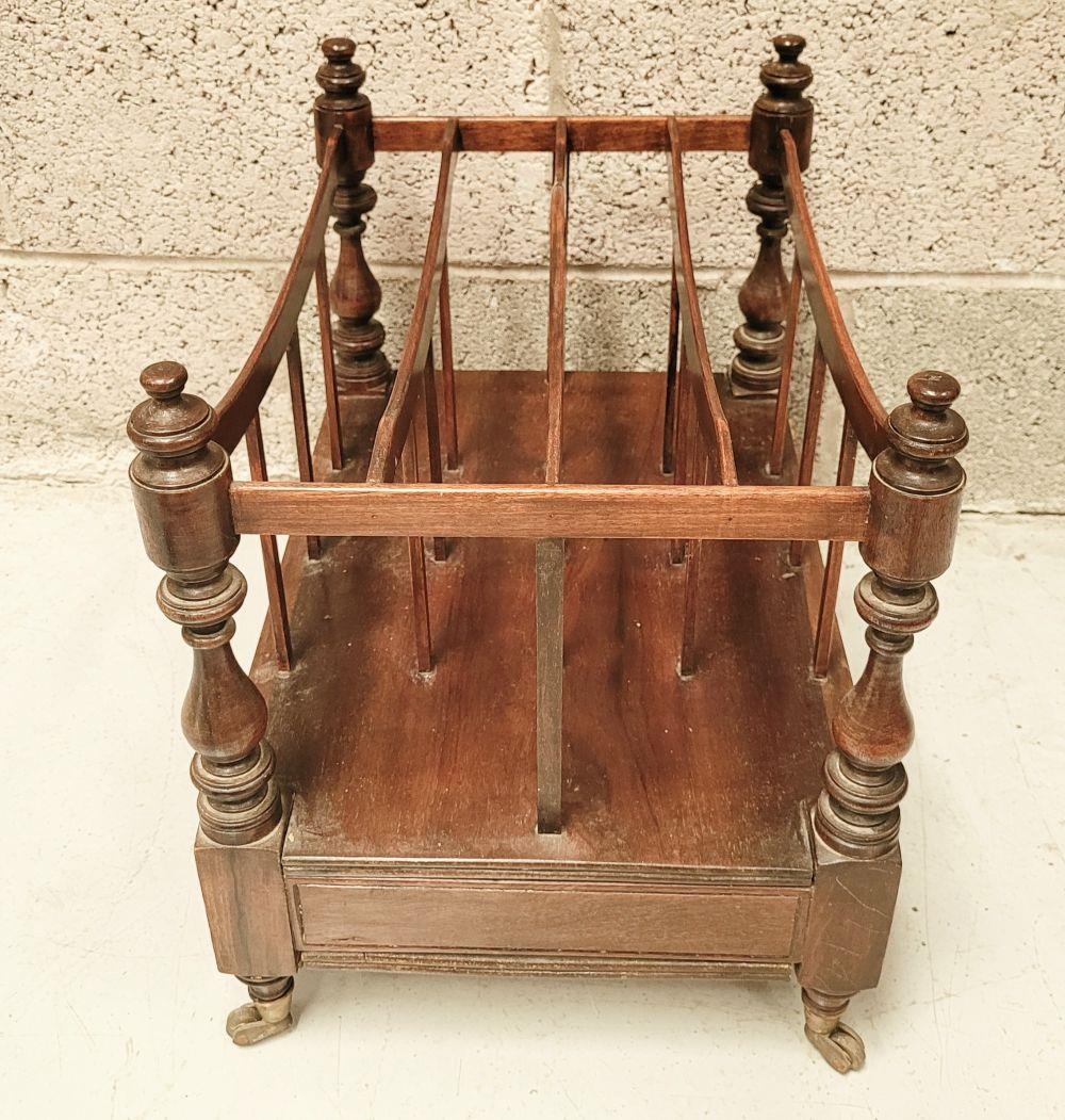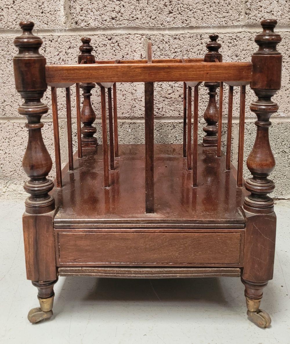 A VERY GOOD QUALITY 19th CENTURY MAHOGANY CANTEBURY BOOK/MAGAZINE RACK, with four turned uprights that support the central four sections for storing your magazines/papers etc. A single drawer beneath for extra storage, which has two turned pull handles – one needs securing. All raised on short turned legs terminating on brass castors. A fine piece of antique functional furniture. Dimensions: 50 x 35 x 44cm (W x D x H).