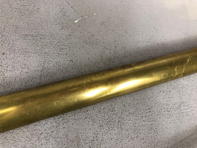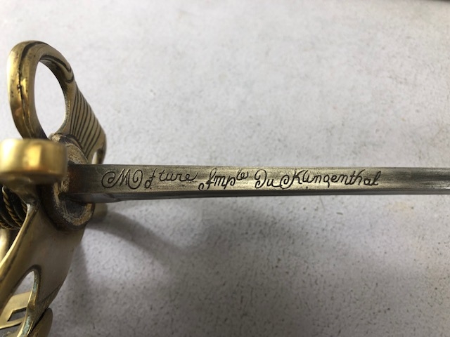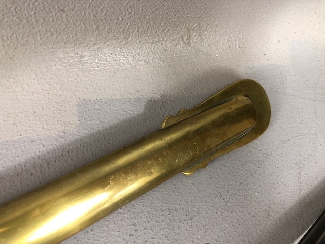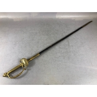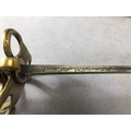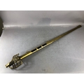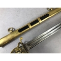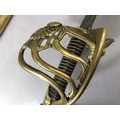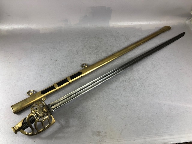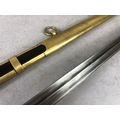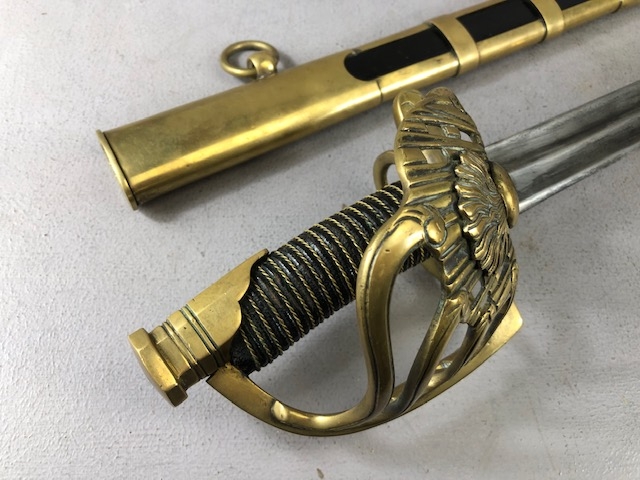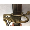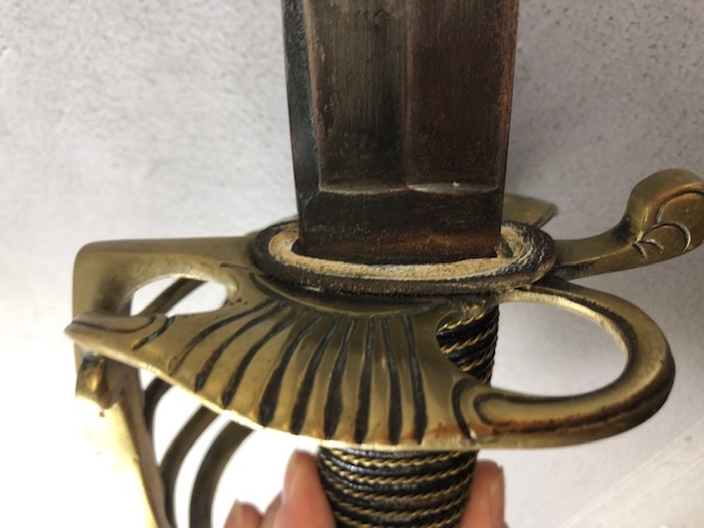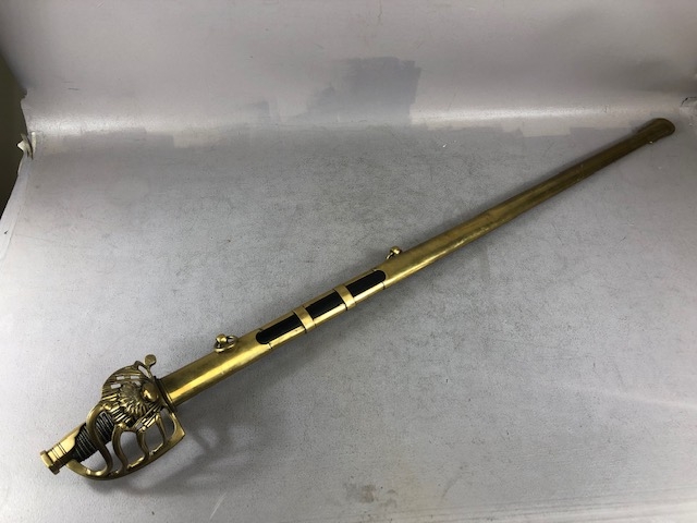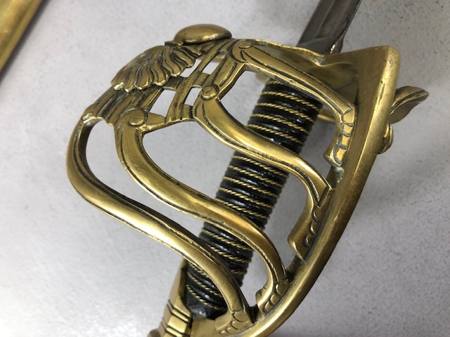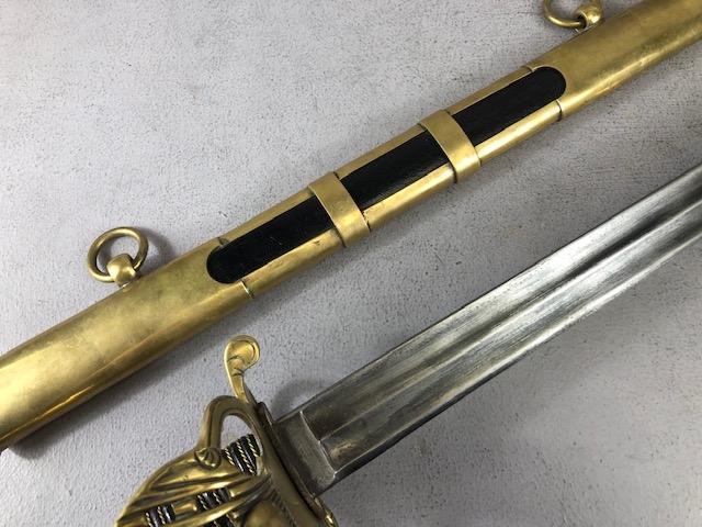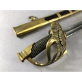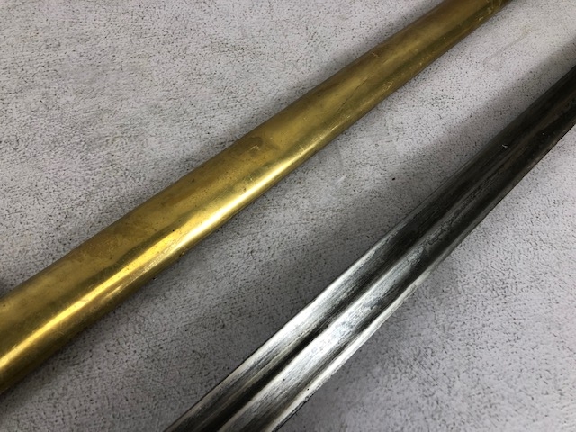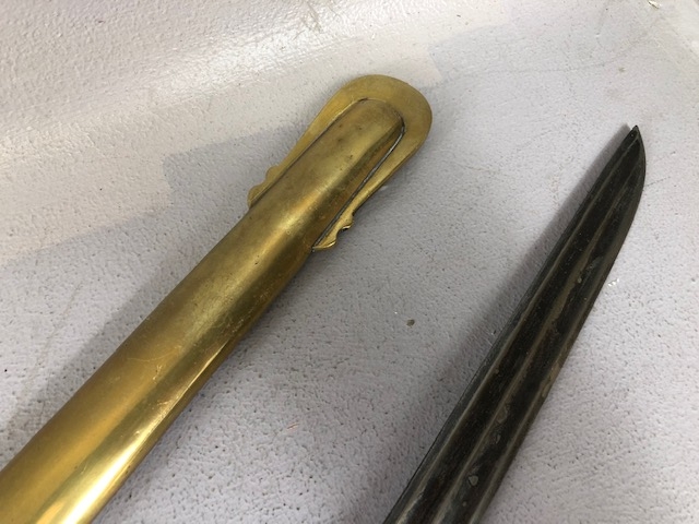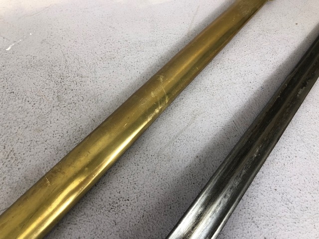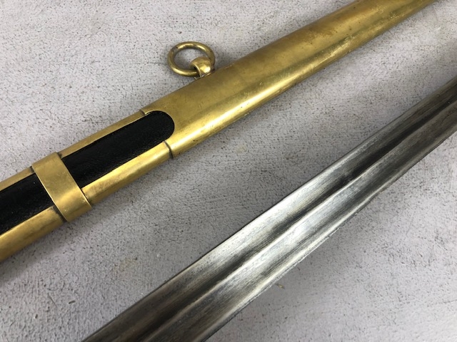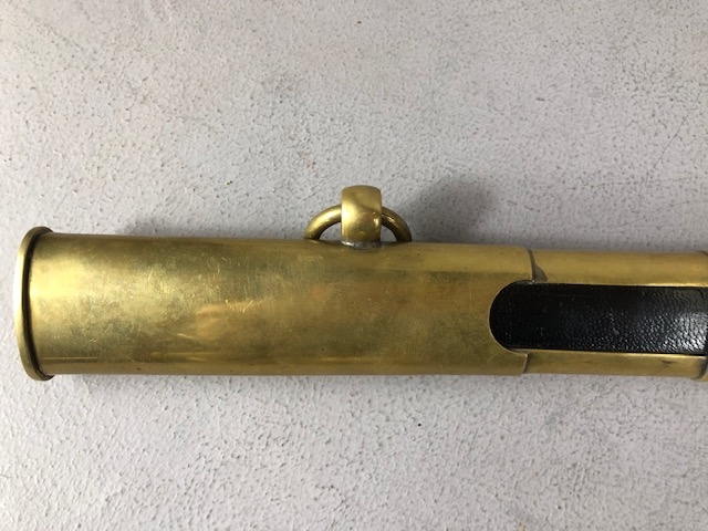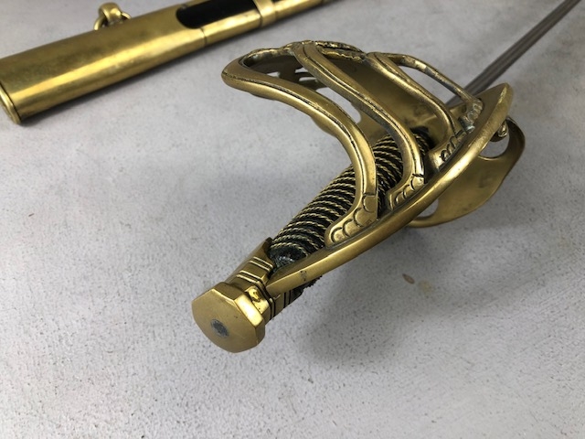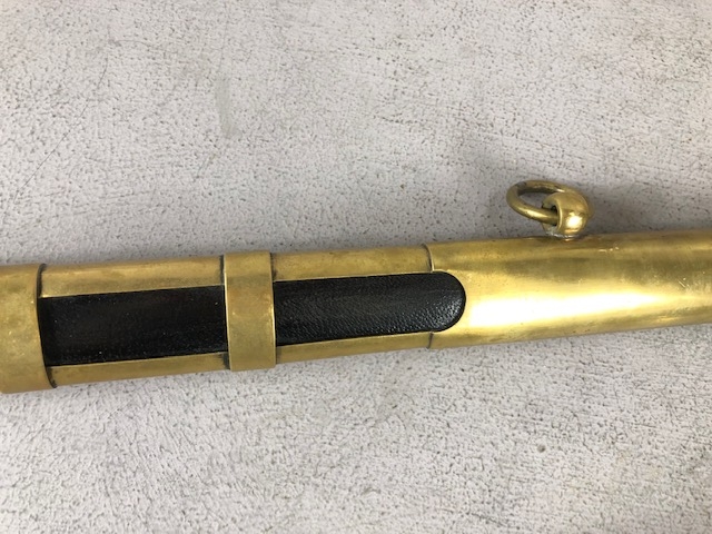Swords, French Napoleonic style sword, double fullered blade with brass half shell hilt, leather wire bound grip, brass scabbard with leather inserts, approximately 113cm overall ,