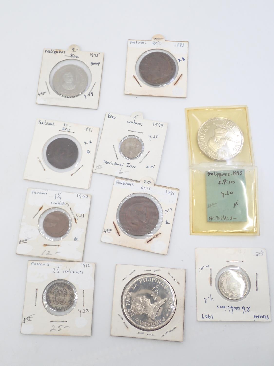 A collection of coin, including coins from Panama, Peru, Philippines and Portugal
