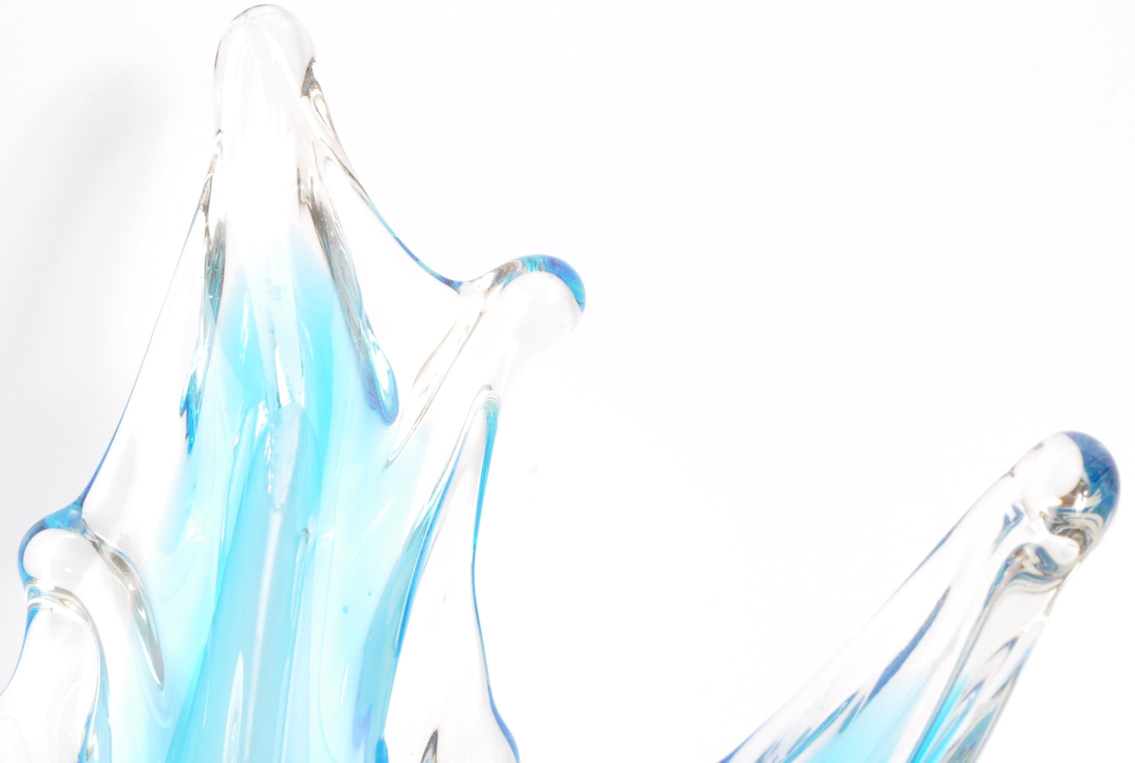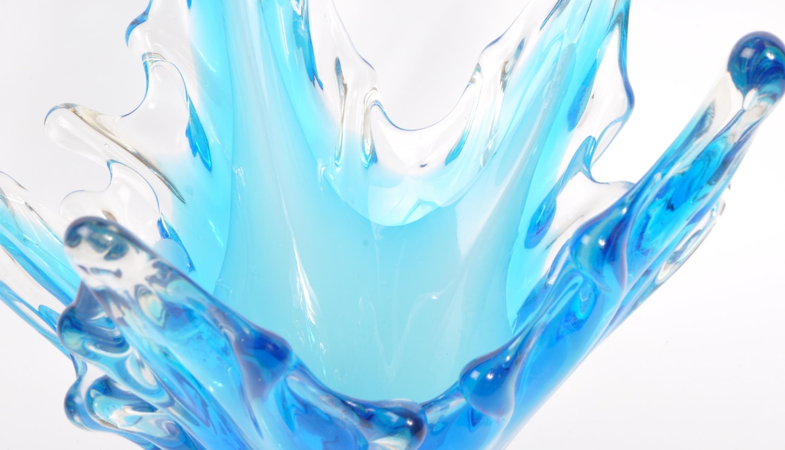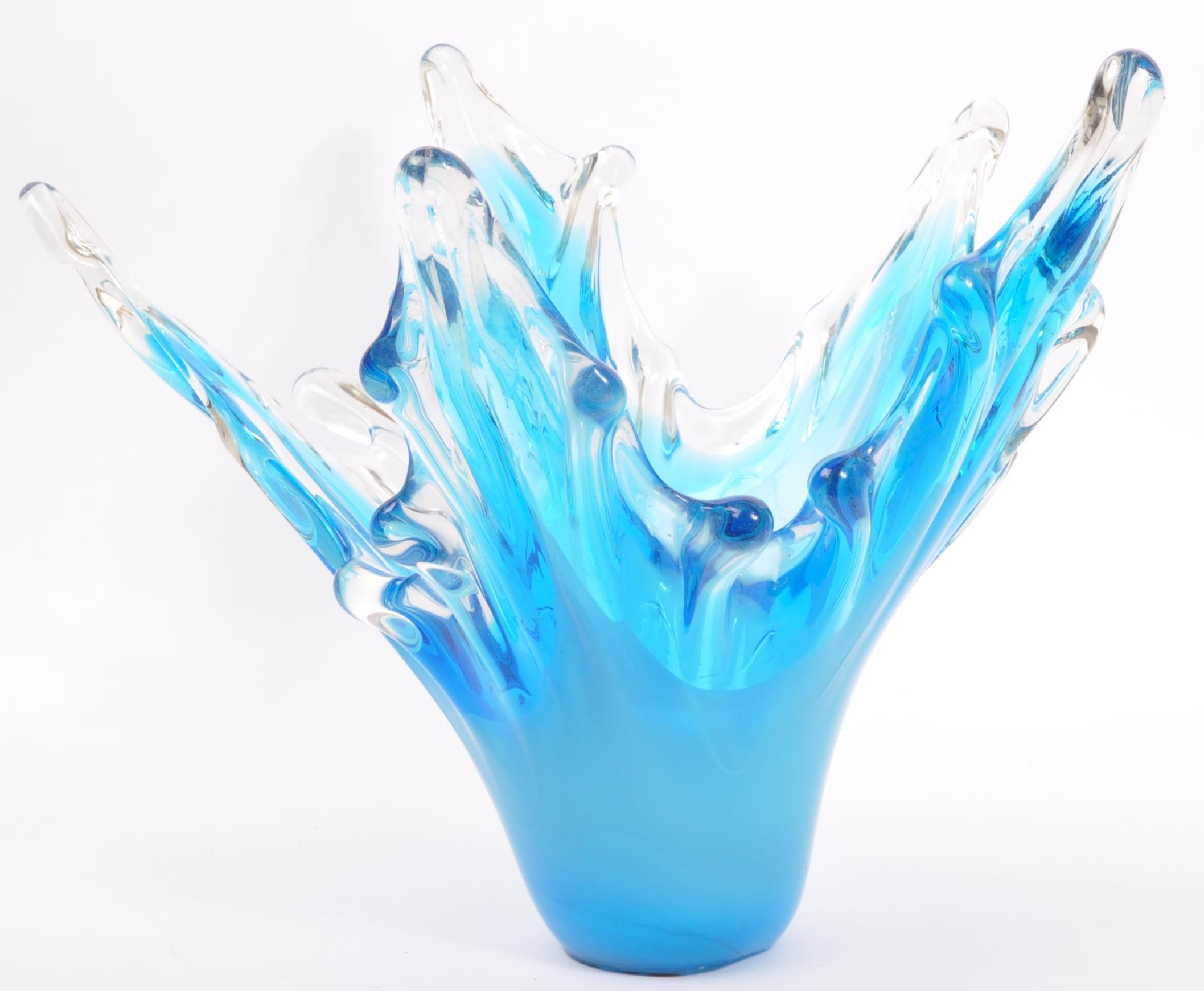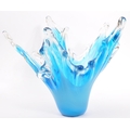 A large 20th century studio glass centrepiece splash vase. The vase having varying tones of blue modelled in the formation of a splash of glass. Measures 28cm tall.
