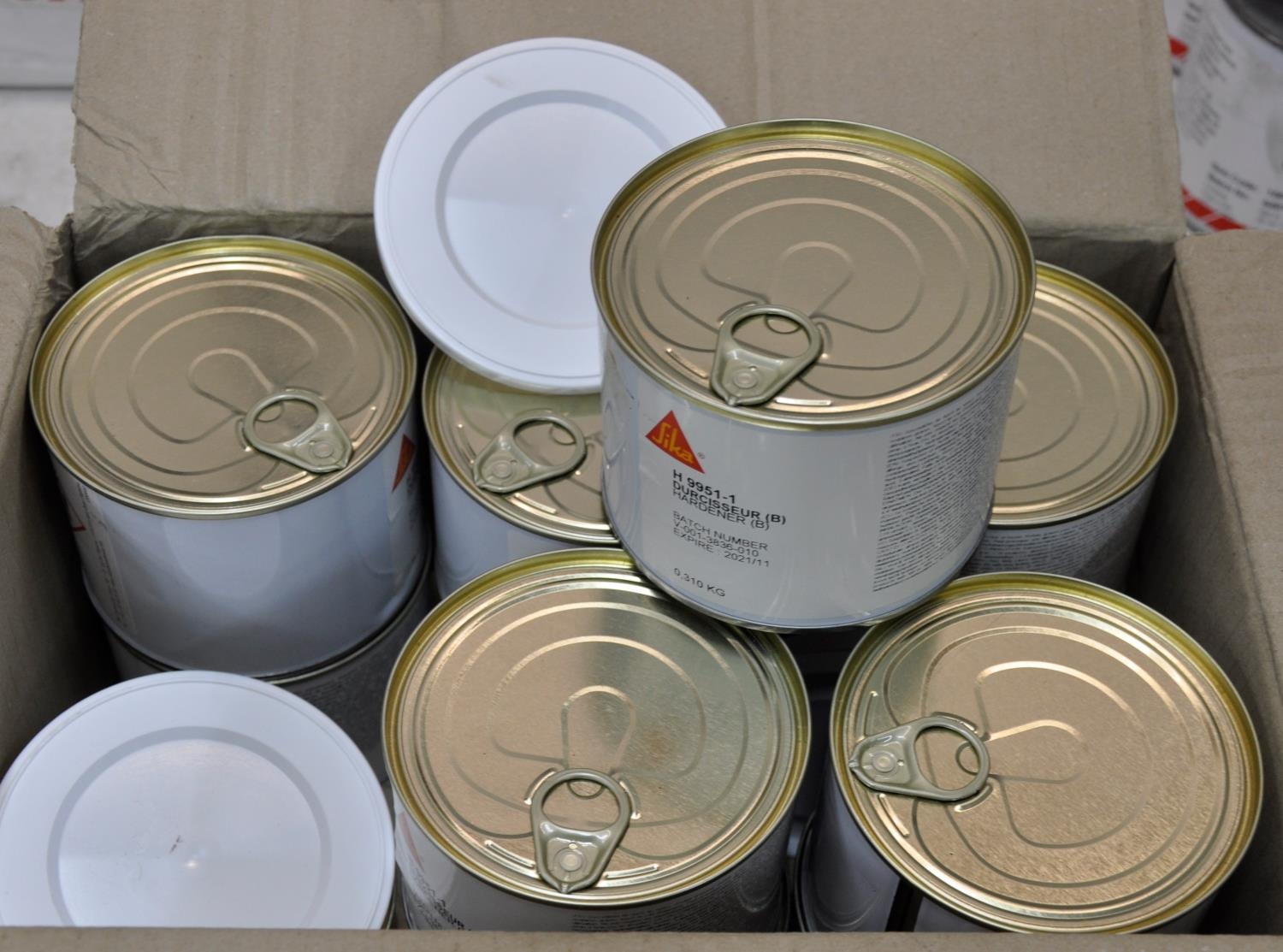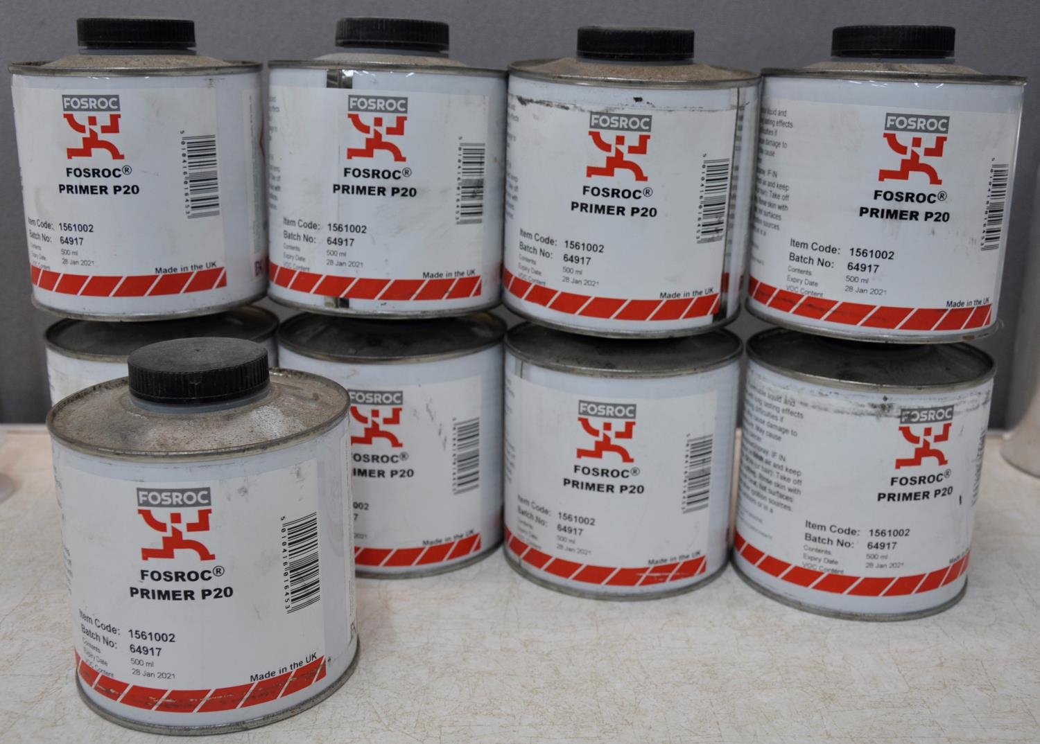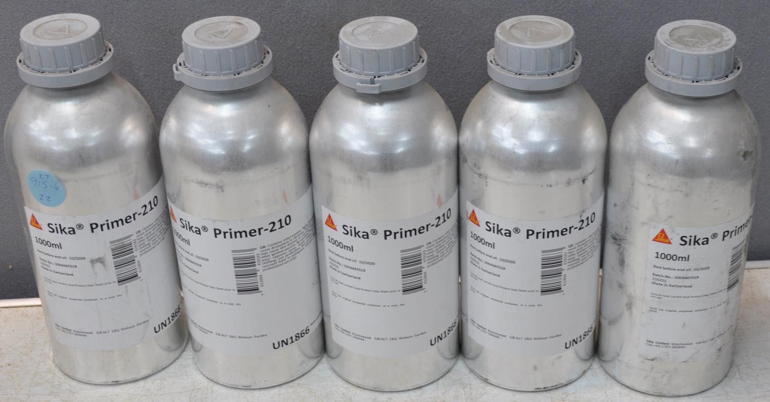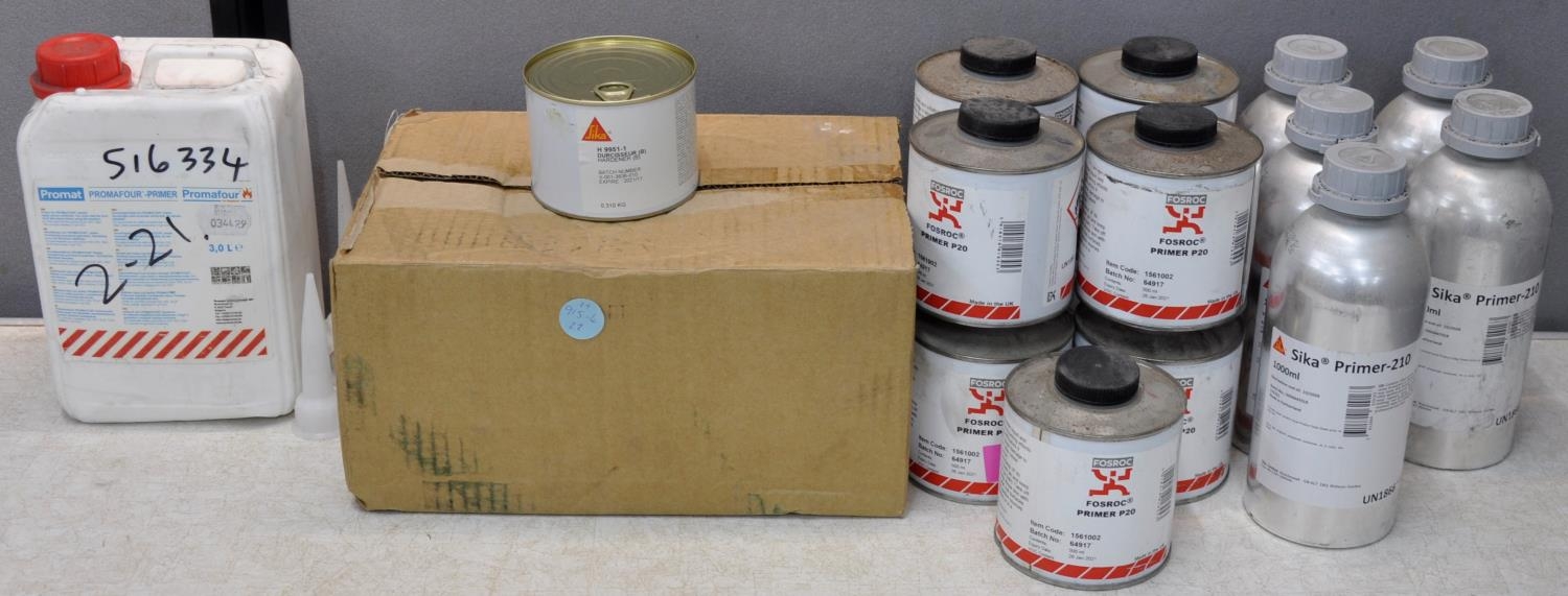PROMAT PRIMER 3L, 9 x FOSROC P20 PRIMER 500ml EXPIRY DATE 28 JAN 21, 5 SIKA PRIMER 210 1000ml BB END 10/09/20, 12 x SIKA H9951-1 HARDENER EXPIRE 11/21