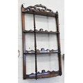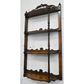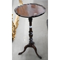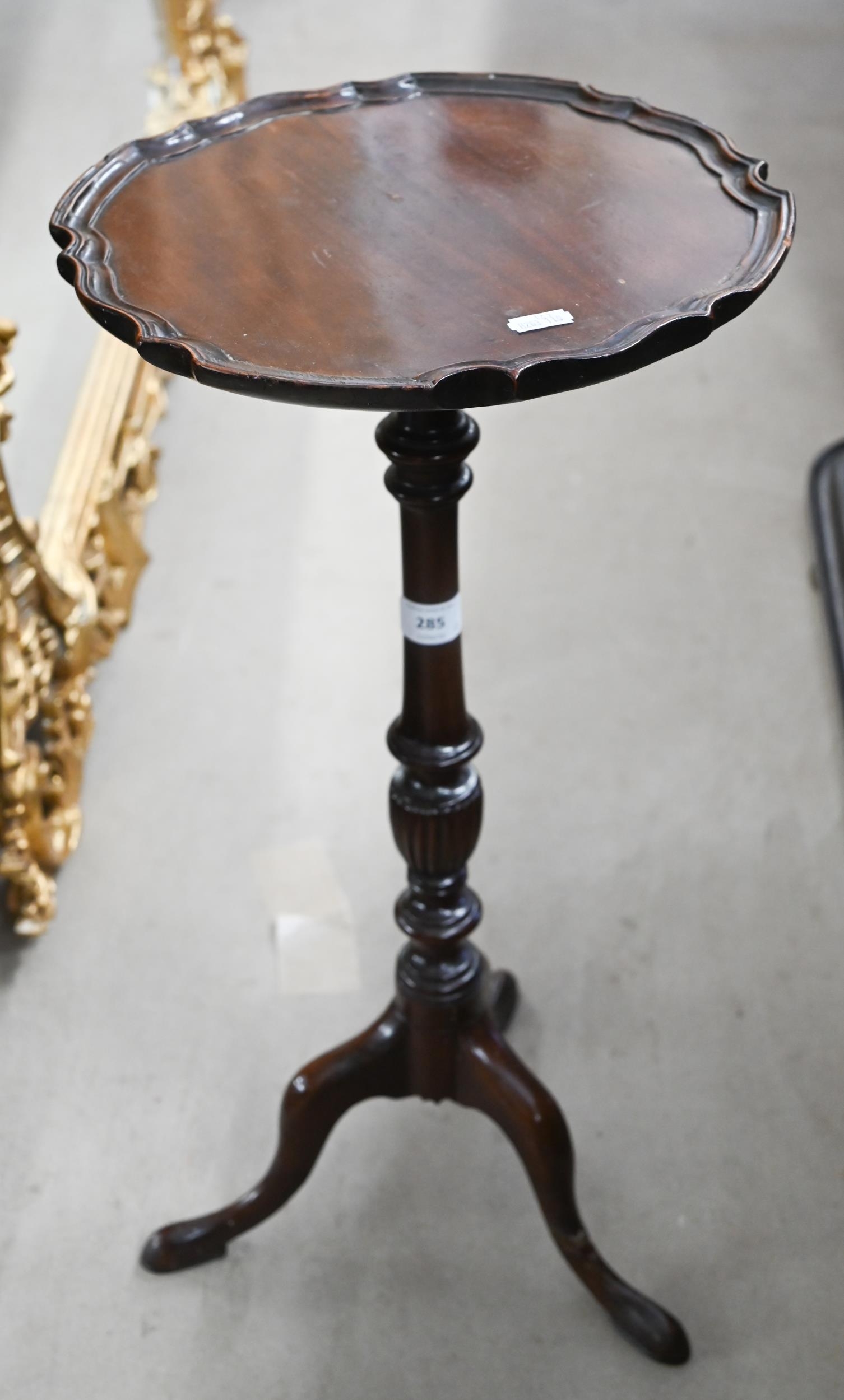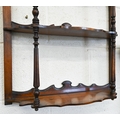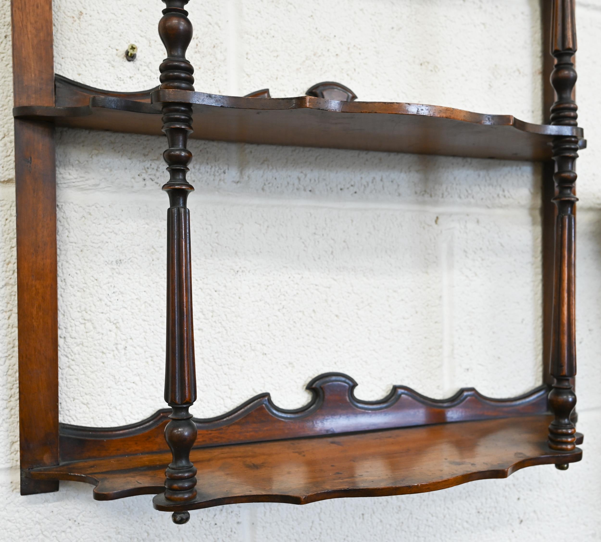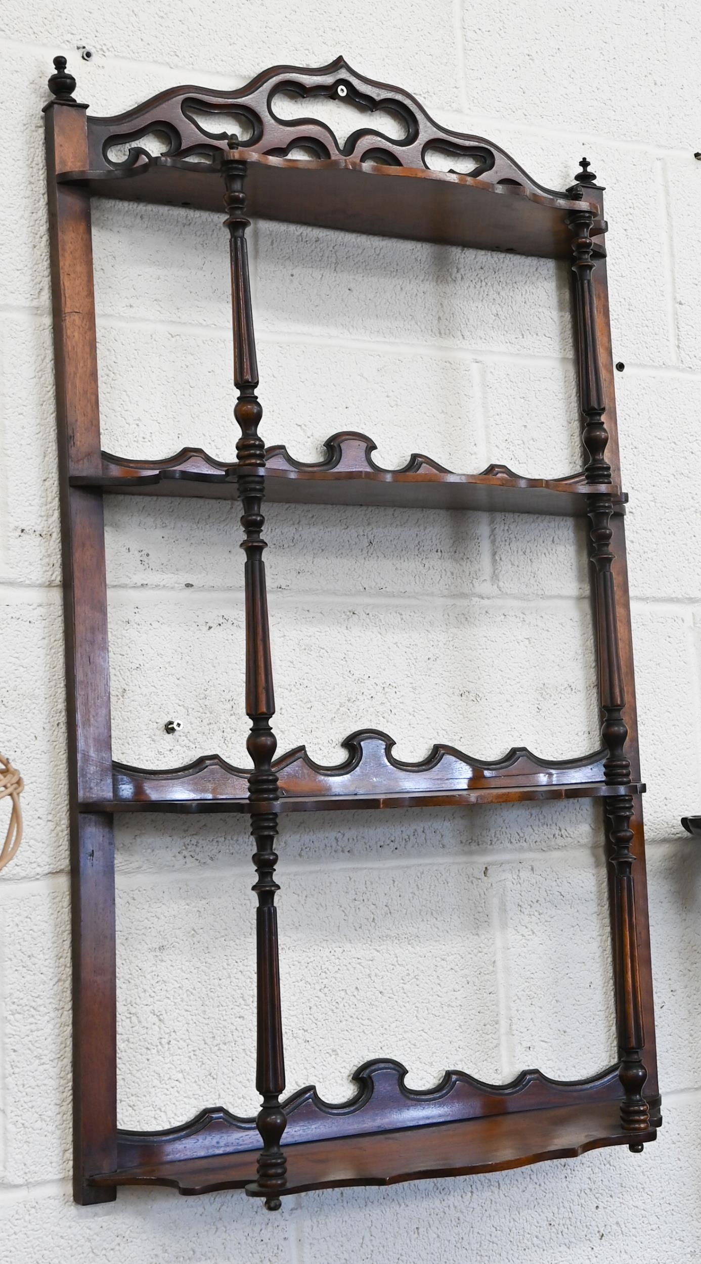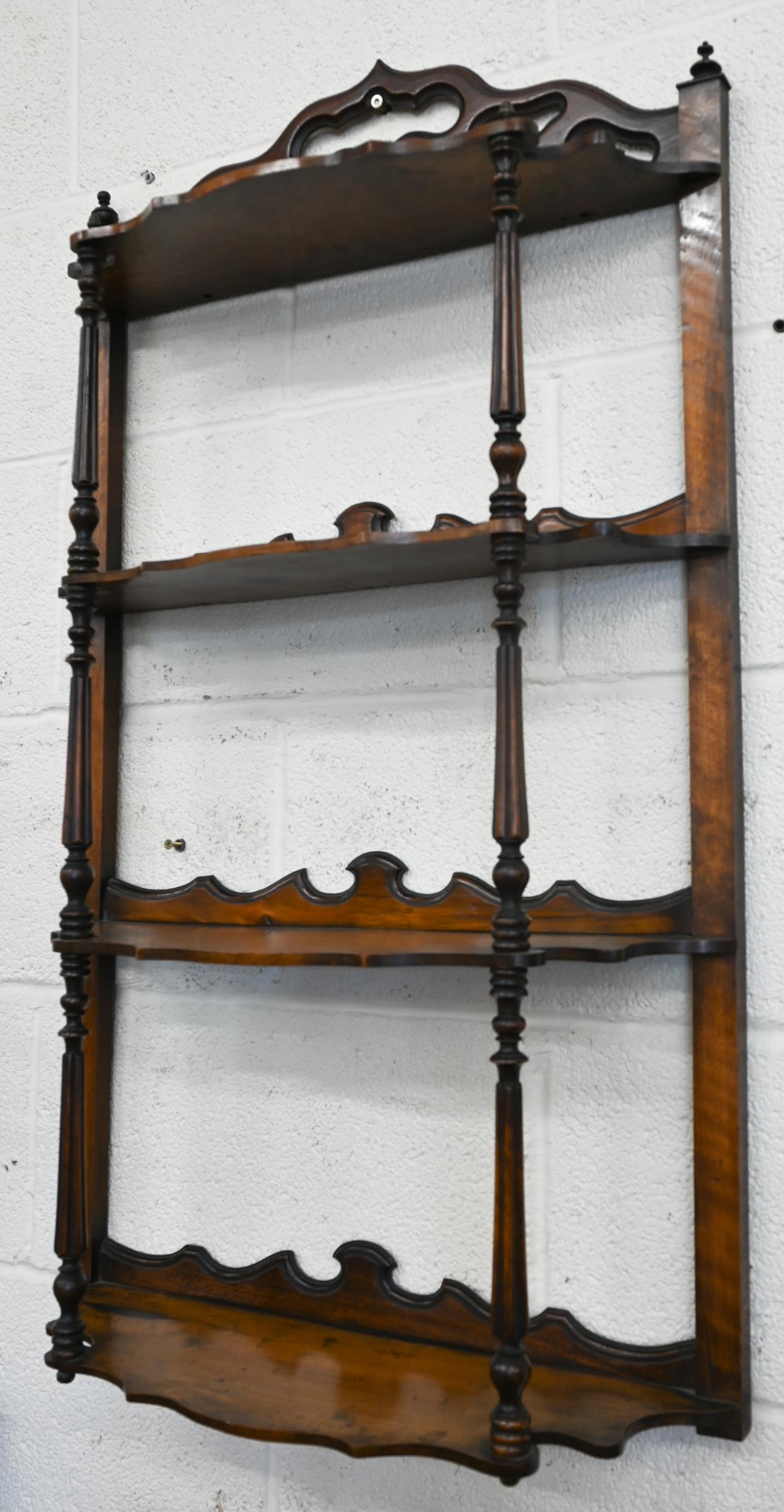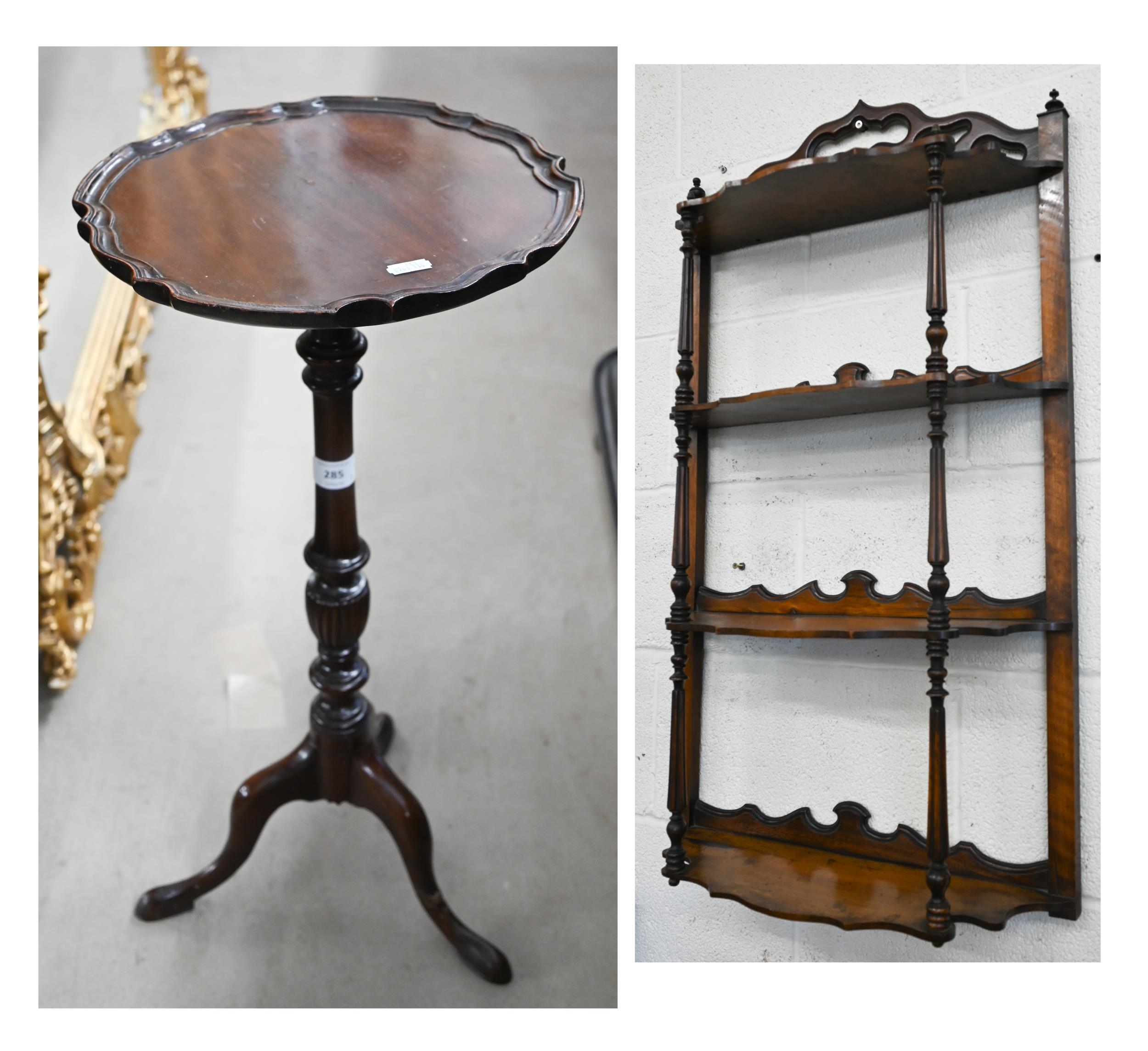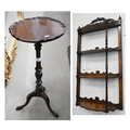 A mahogany four-tier wall shelf with turned and reeded pillars, 85 cm high to/w scalloped mahogany tripod wine table (2)