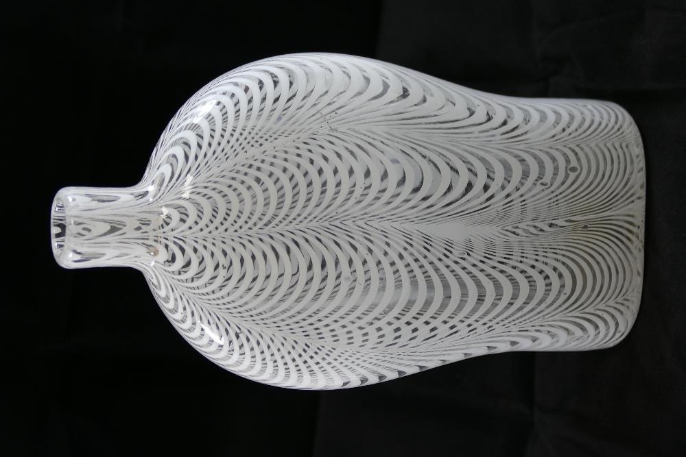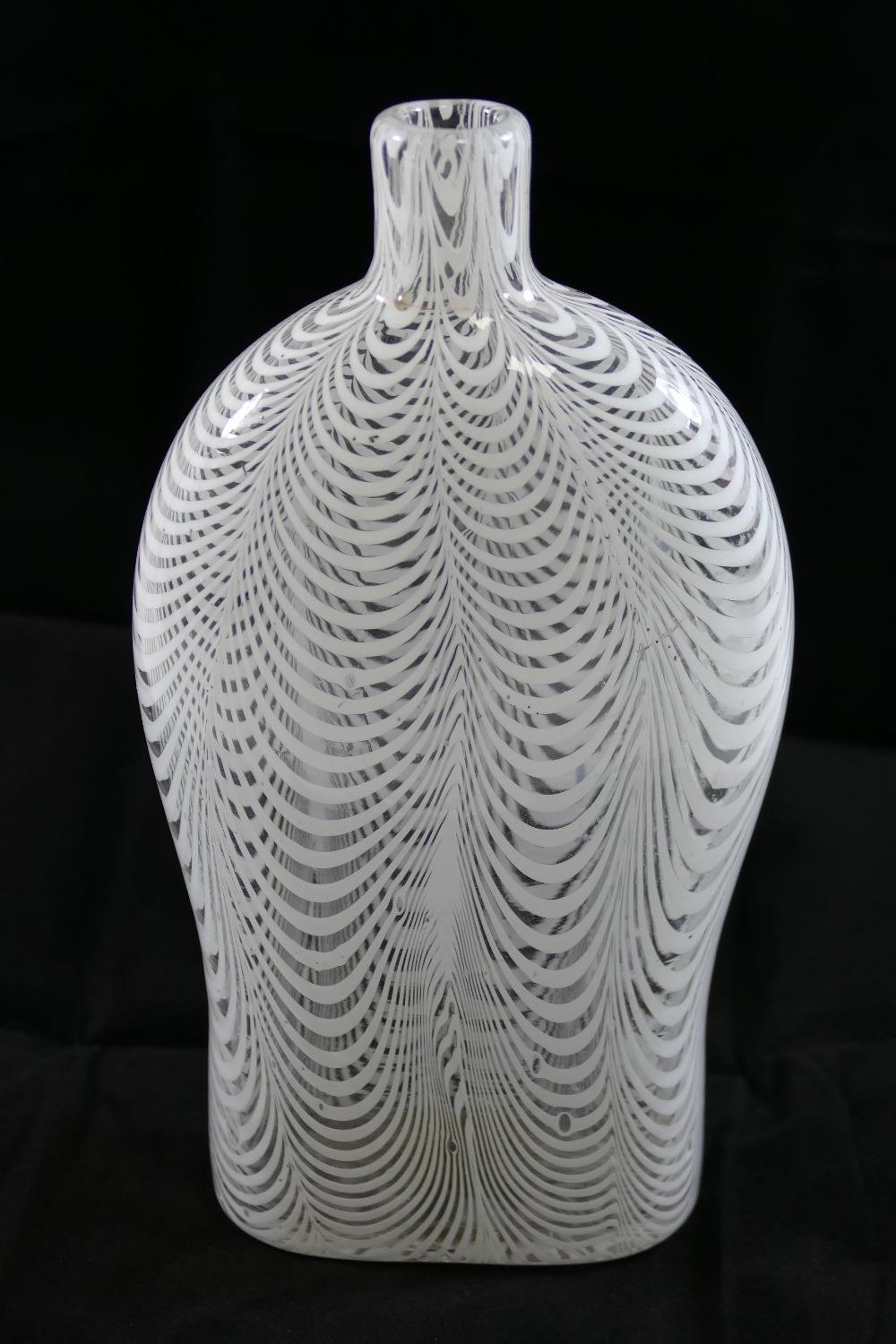 A 19th century Nailsea glass flask or bottle, with typical white latticino decoration, 20cm long