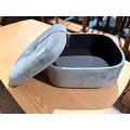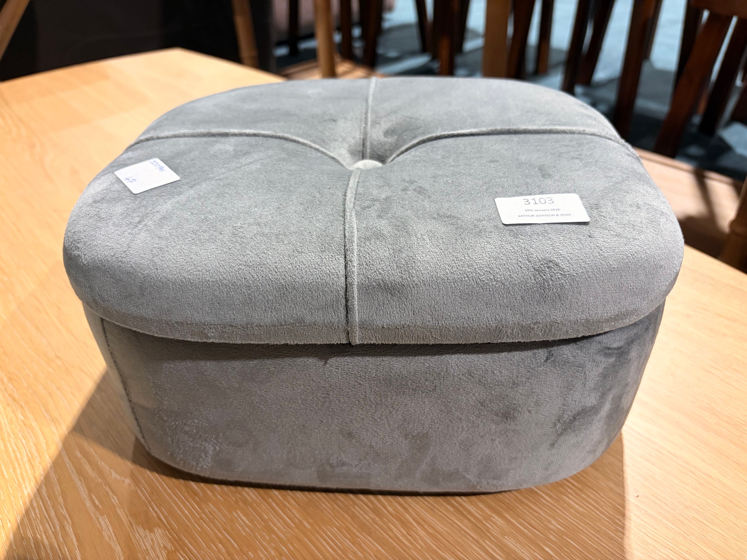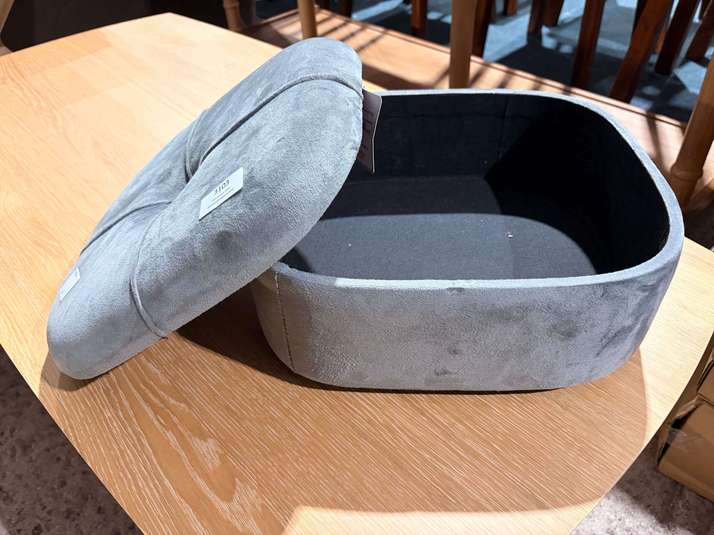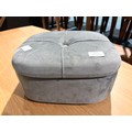 A small grey velvet storage footstool (missing legs)