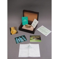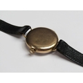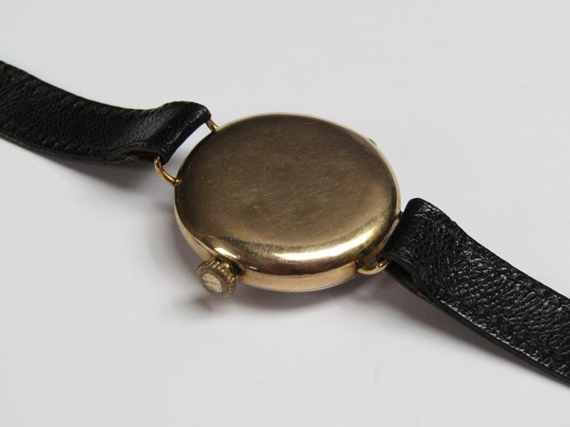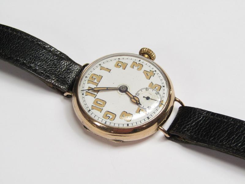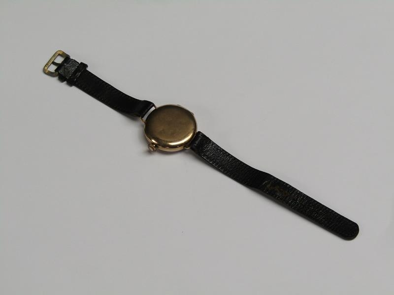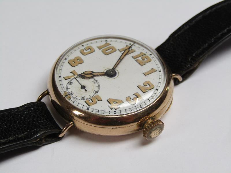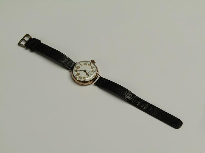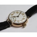 An early Rolex wristwatch, the 9ct gold case hallmarked for 1916. The fifteen jewel movement has a bi-metallic and lever escapement and the white enamel dial has large luminous arabic numerals, luminous hands and inset seconds ring. The plain circular case 3.25cm diam.