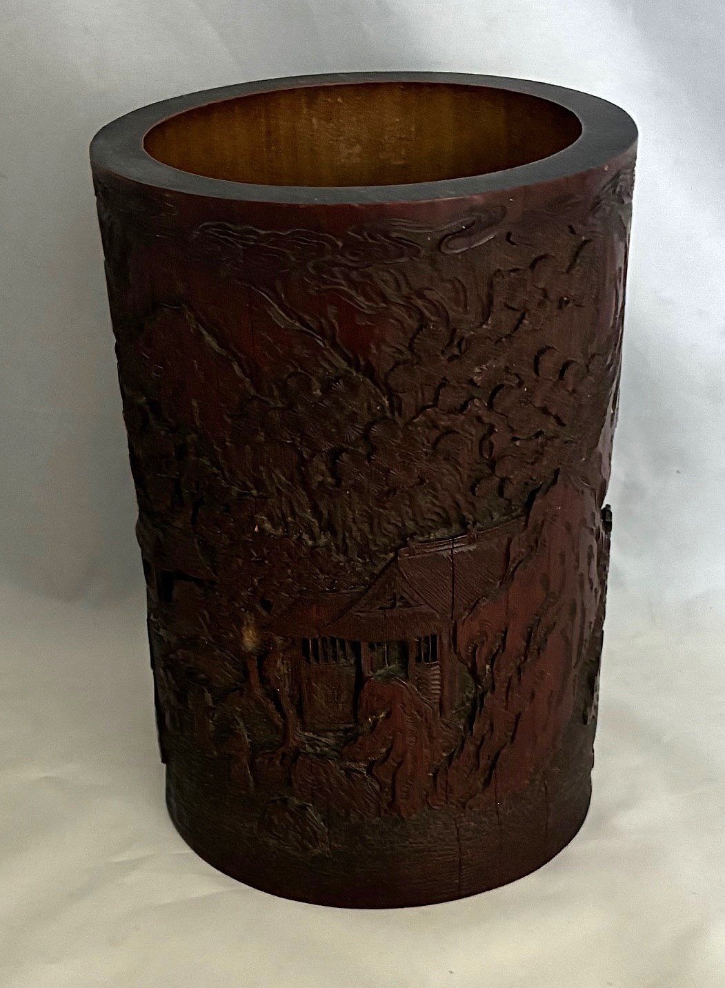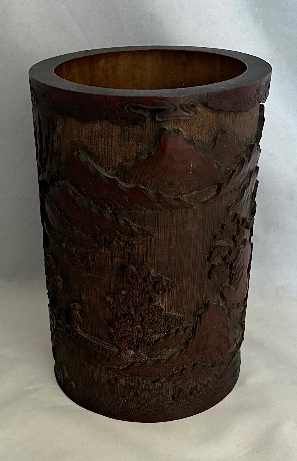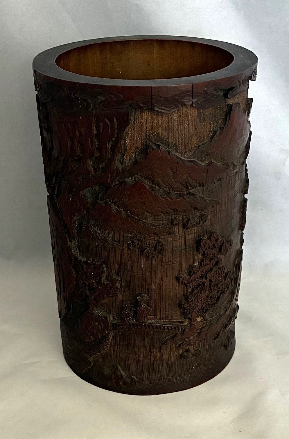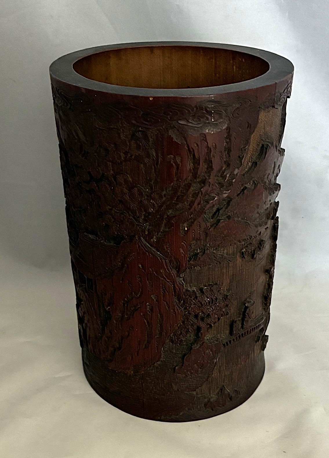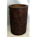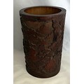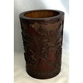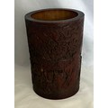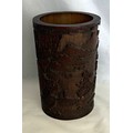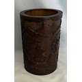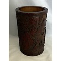 Chinese bamboo brush pot, of cylindrical form with carved decoration 16cm high 10.5cm diameter.
