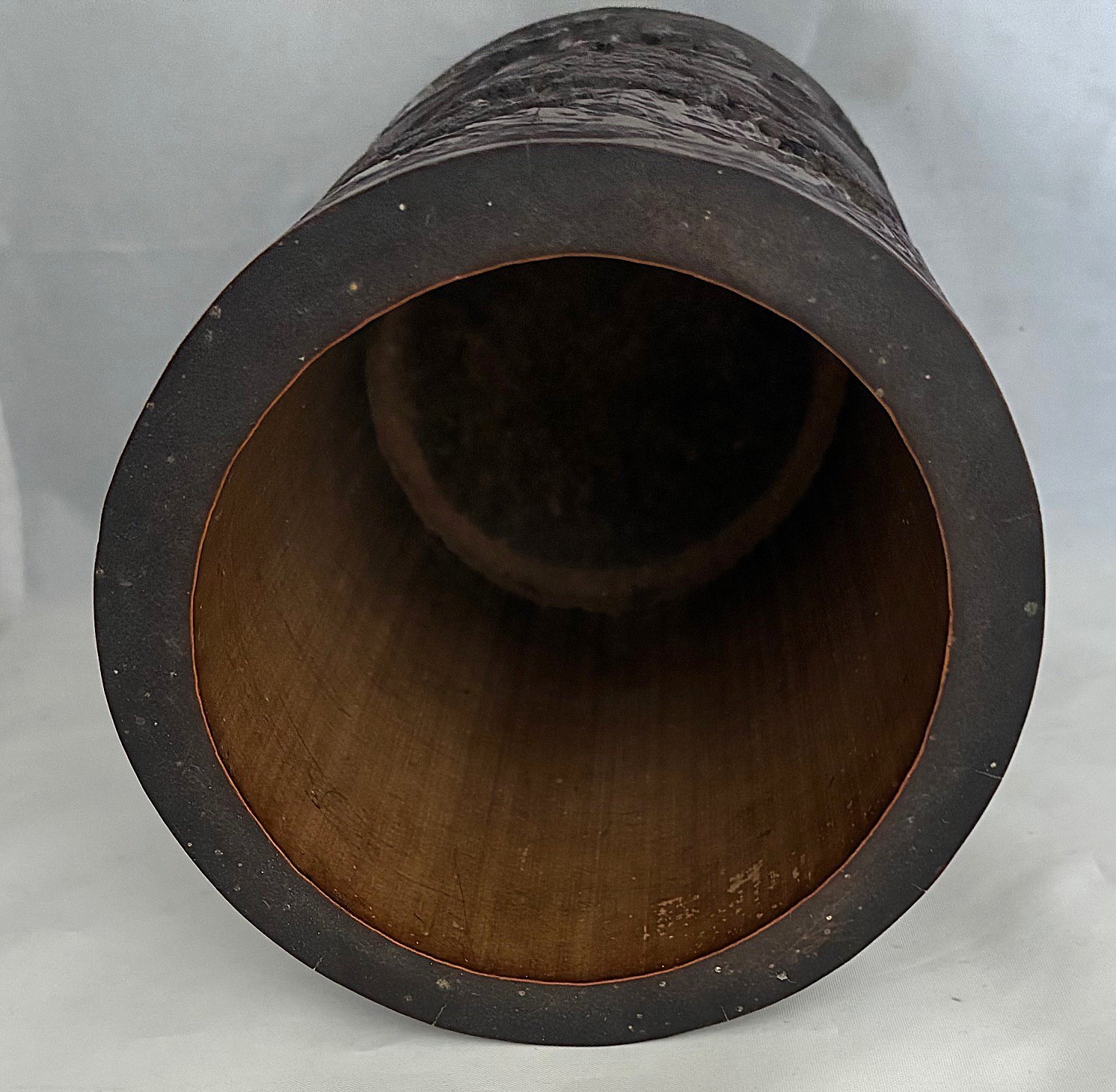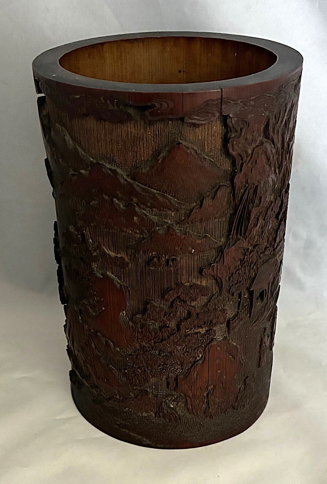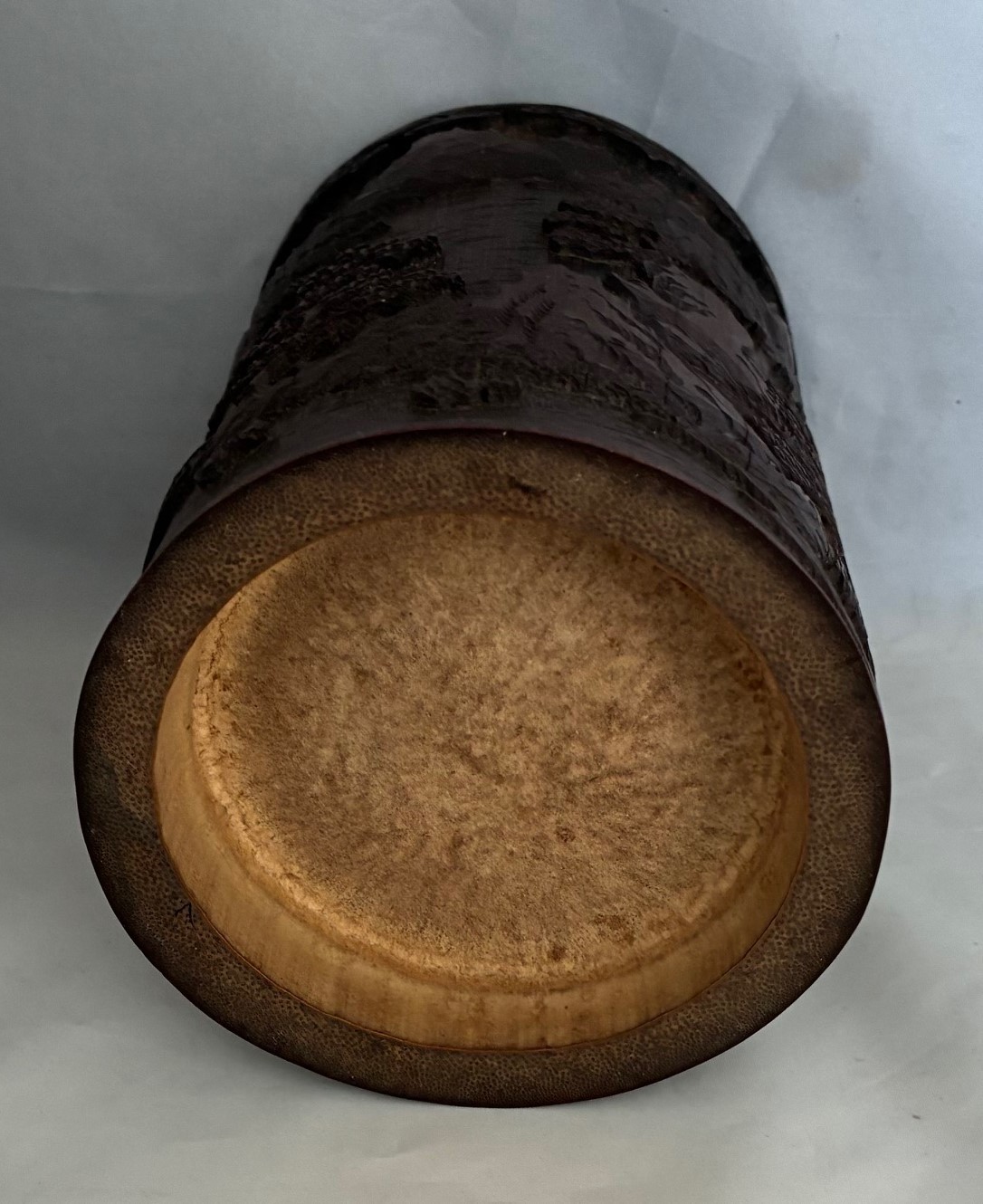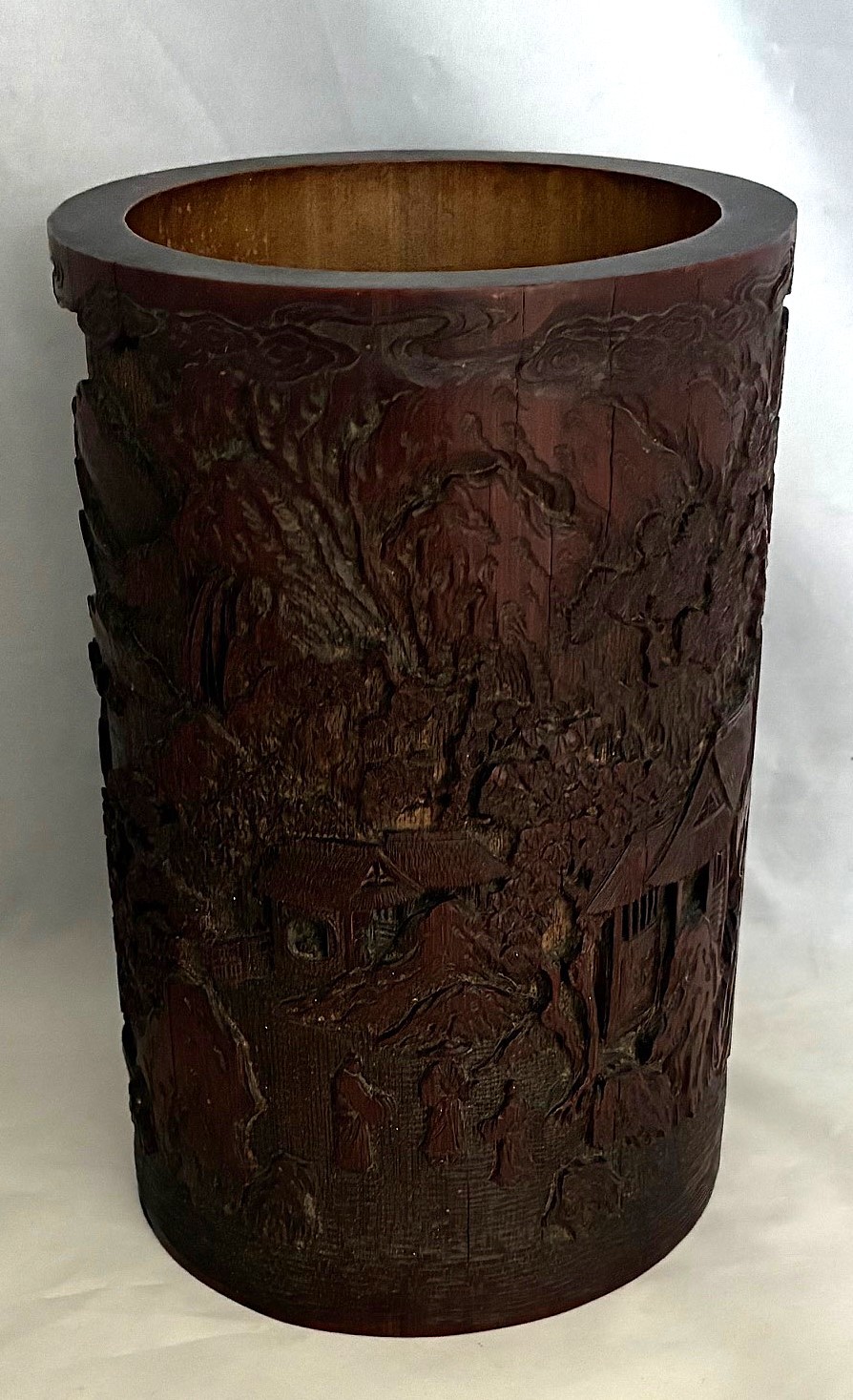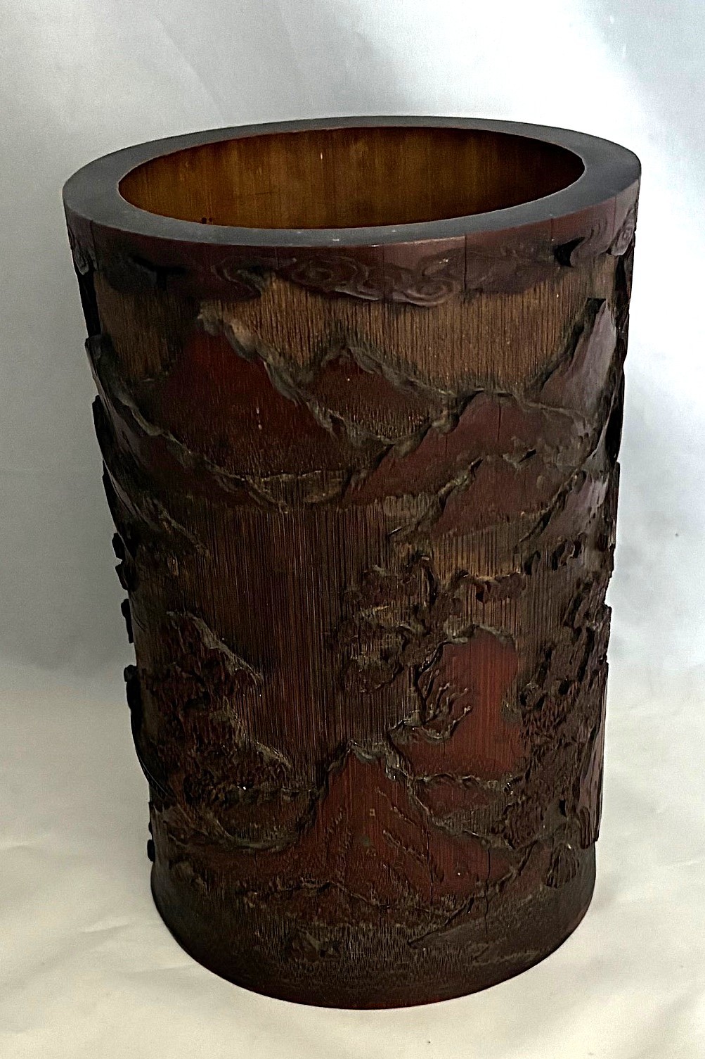Chinese bamboo brush pot, of cylindrical form with carved decoration 16cm high 10.5cm diameter.