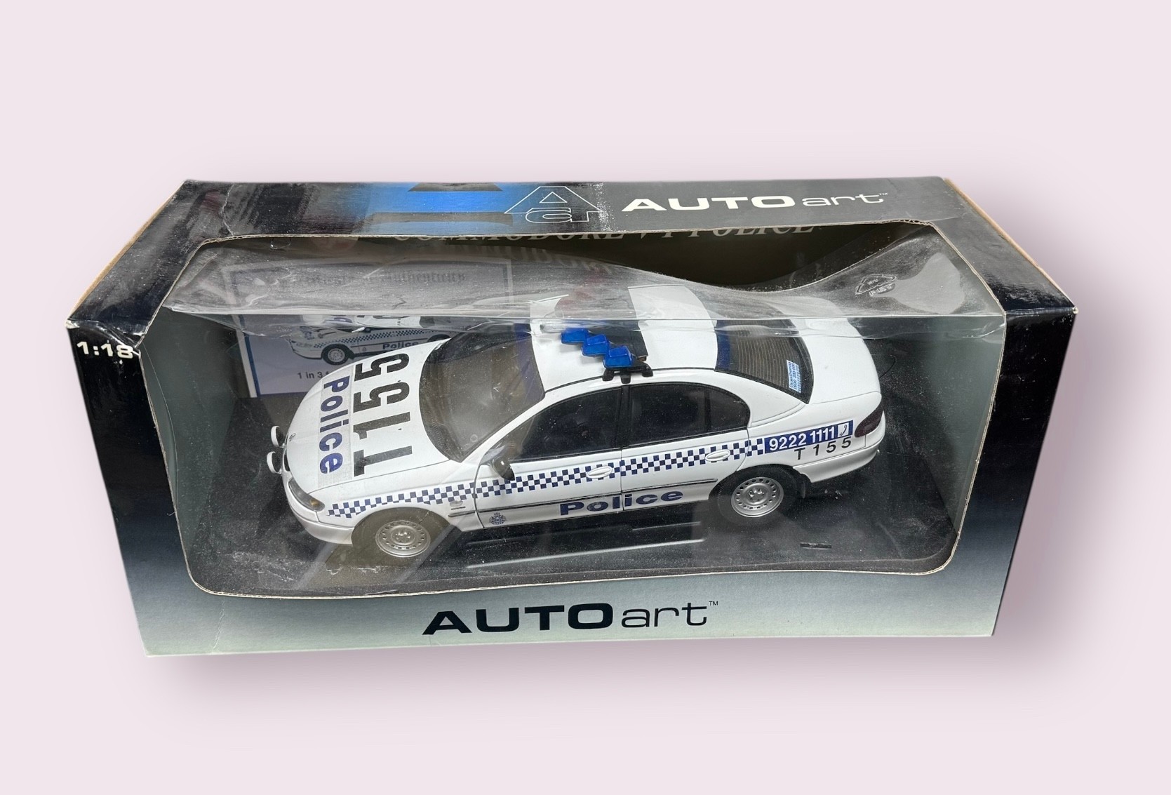 Autoart 1/18th scale Holden Commodore Western Australia Police No. 73391, generally excellent in good window box (cellophane unattached to top). Contents appear complete but unchecked. Viewing recommended.