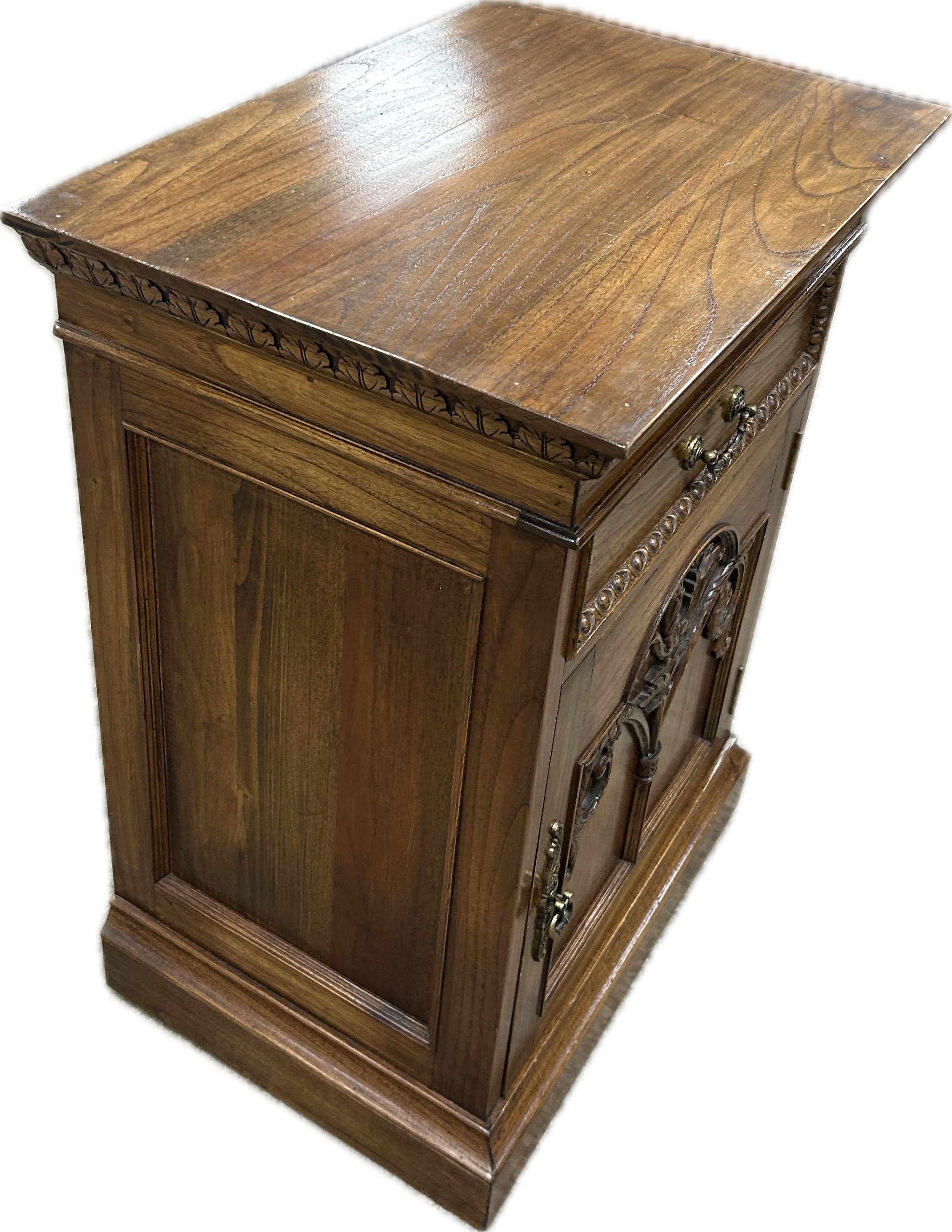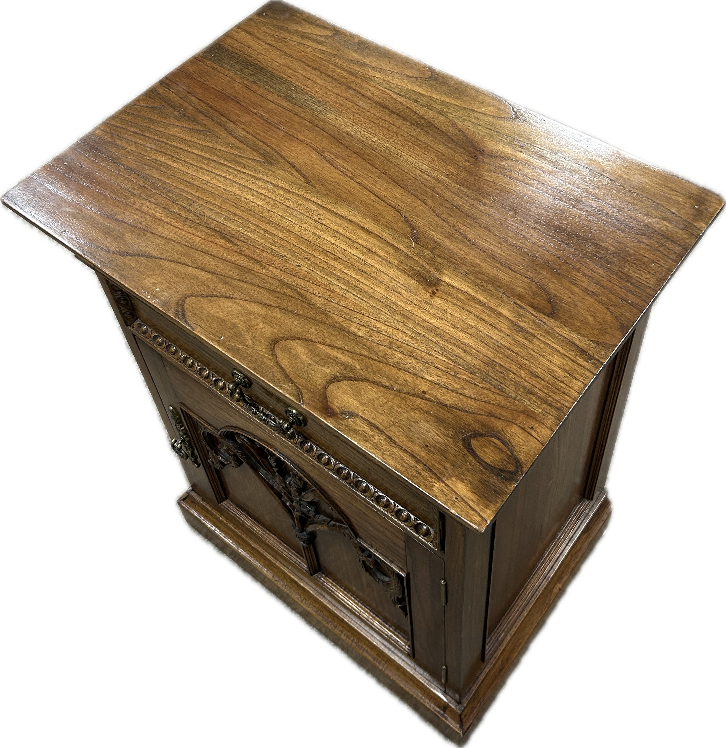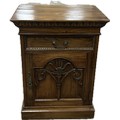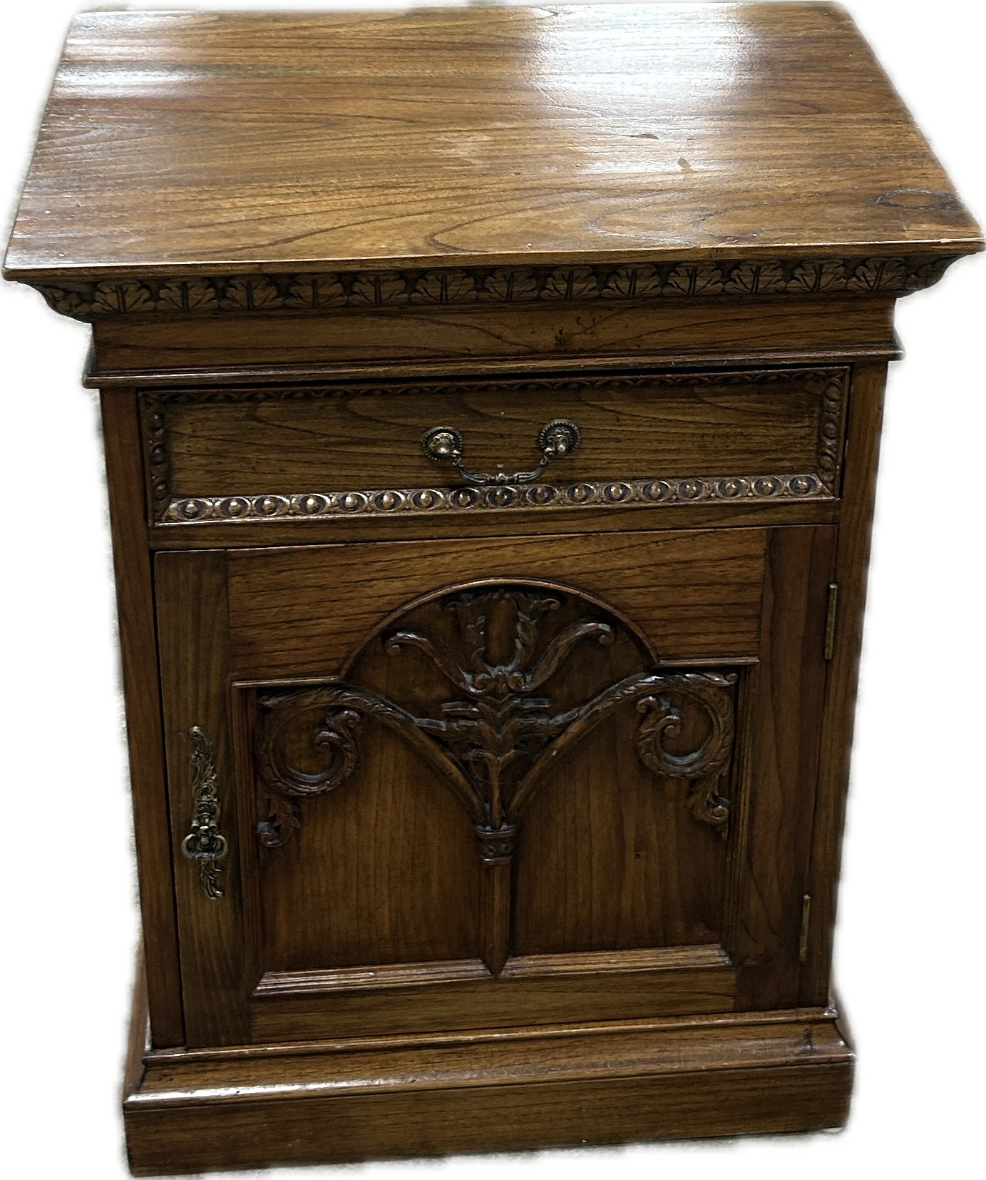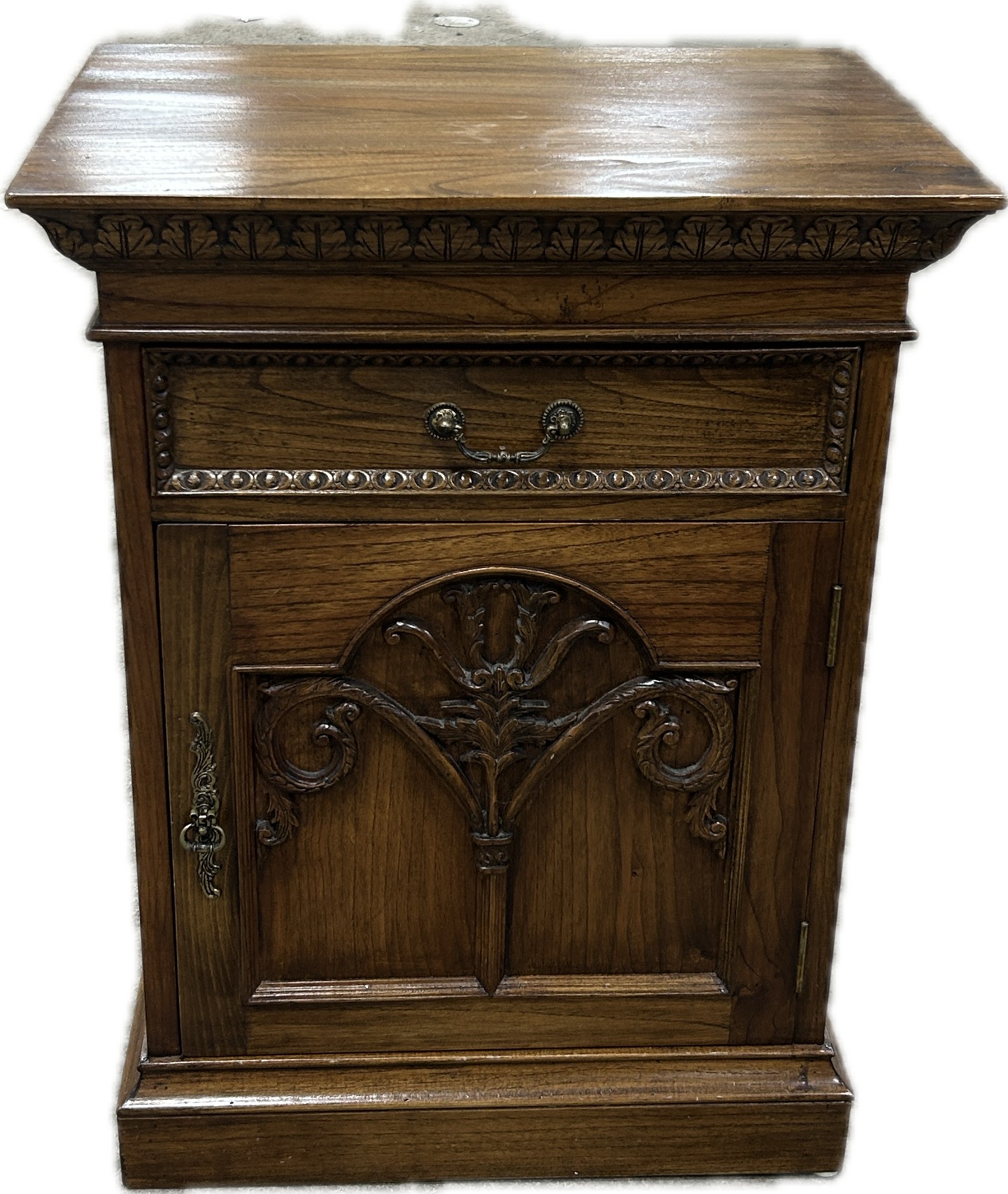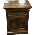 Oak one drawer one door carved front small cupboard measures approximately: 32 inches tall x 24 wide and 17 deep