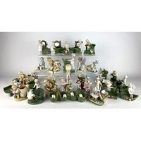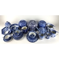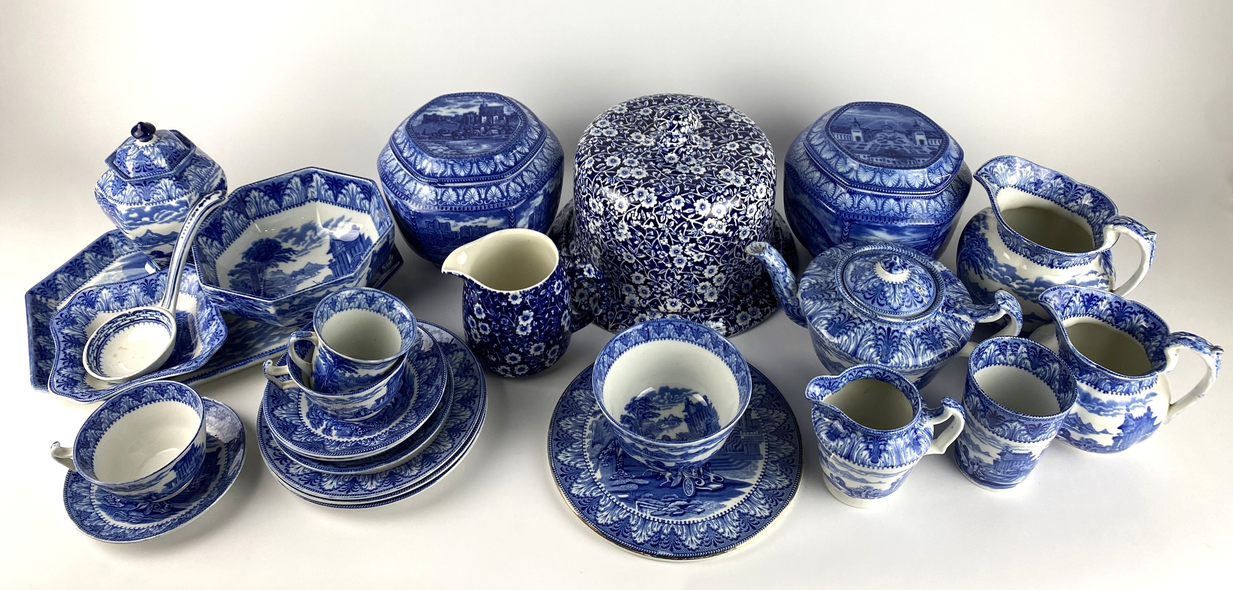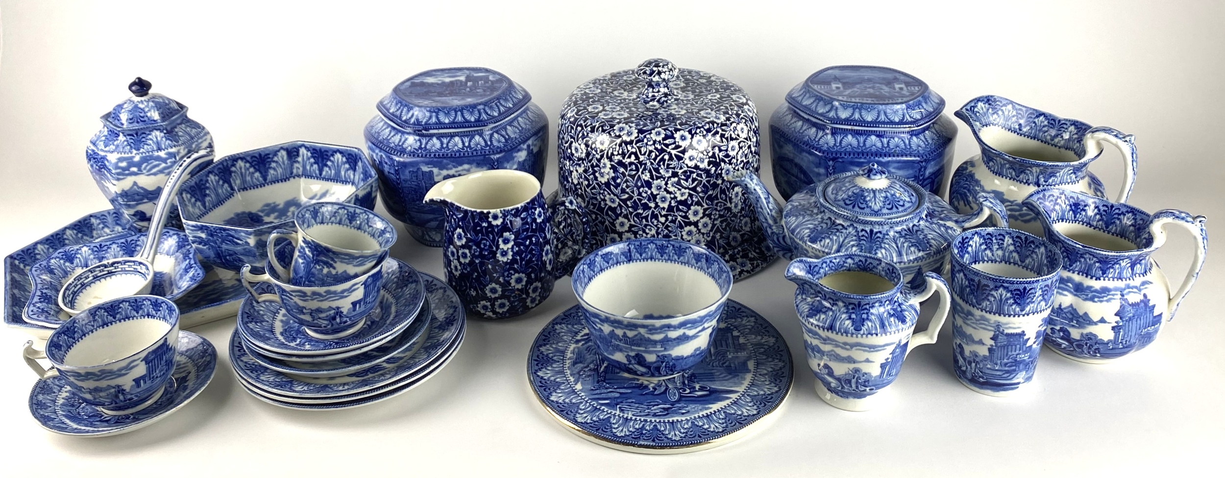 A collection of Cauldon blue and white transfer printed wares, in Arcadian Chariot pattern, including hexagonal plate, hexagonal bowl, teapot, sugar basin, cream jug, beaker, dish, graduated pair of jugs, ginger jar, two tea cups, coffee can and four saucers, together with a Cauldon ladle, two Ringtons Maling tea caddys, a Warwick ware stand, a blue and white Calico Burleigh Staffordshire floral pattern cheese dome and cover, with a matching jug, cheese dome height overall 17cm (qty)