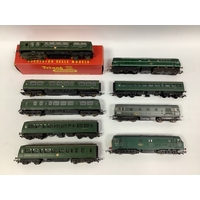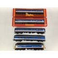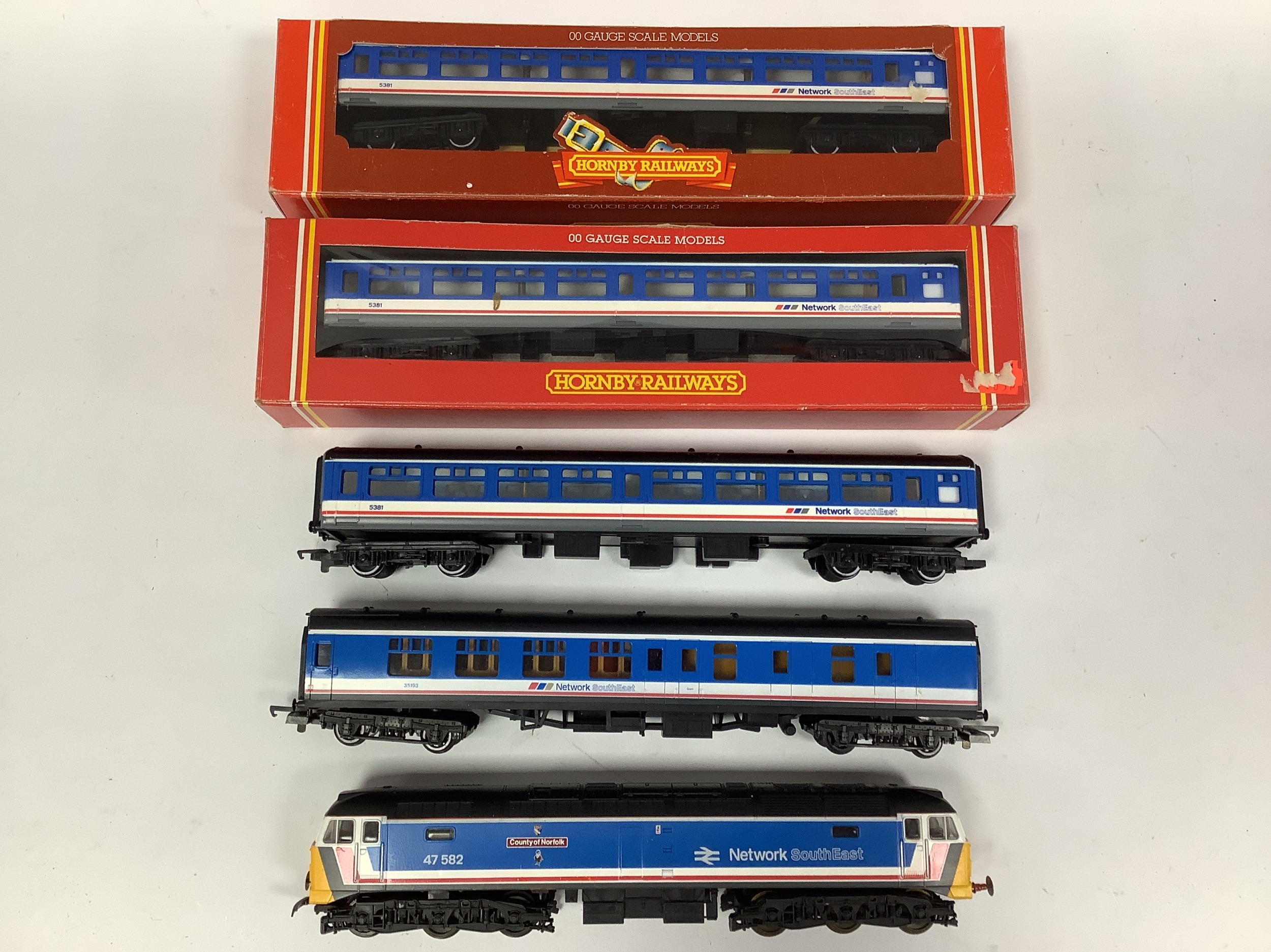 A Lima 00 gauge Class 47diesel in Network South-East livery (untested) with four coaches (two boxed) in matching NSE livery by Hornby and Lima.