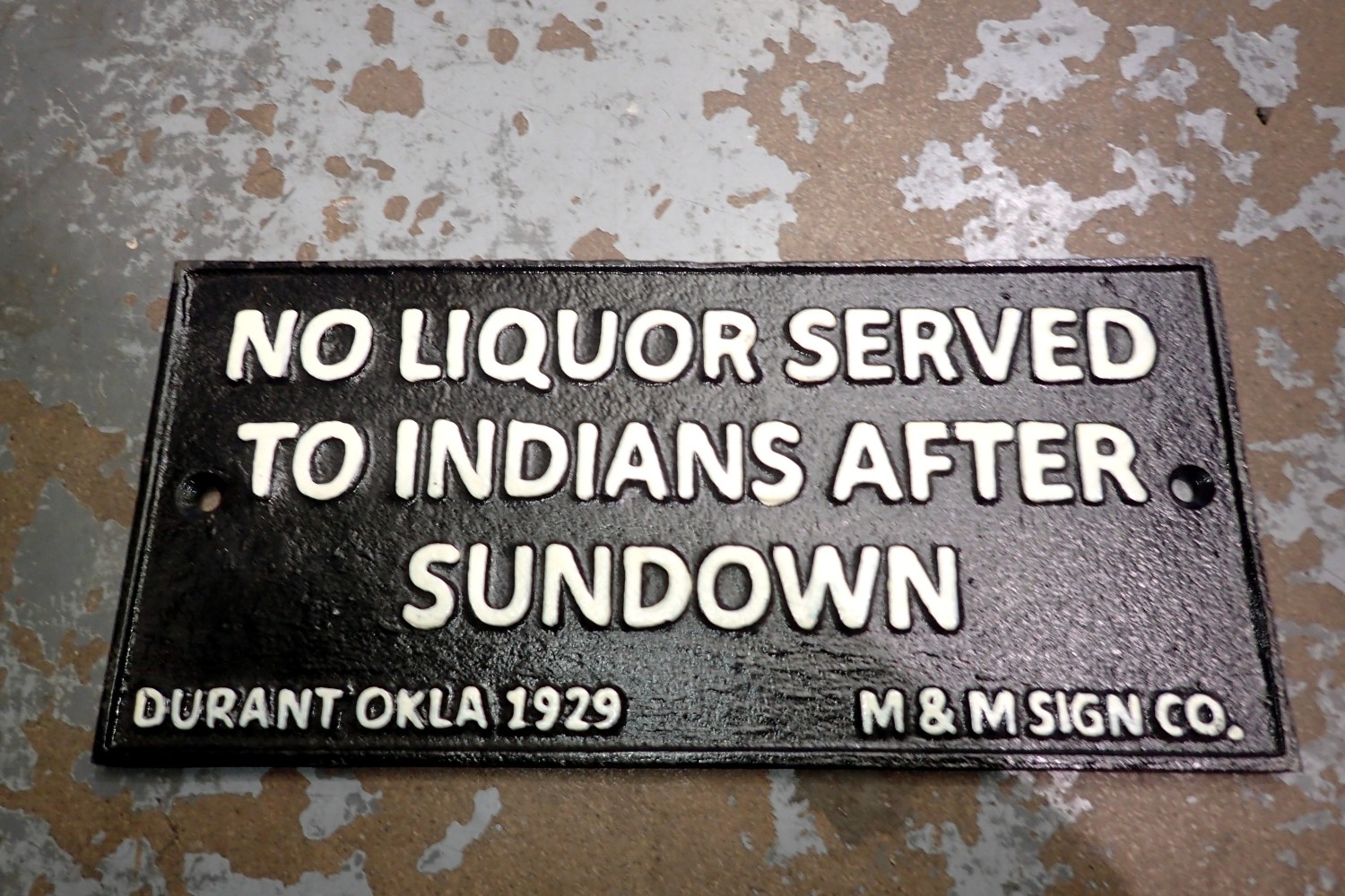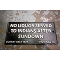 Cast iron No liquor served to Indians after sundown wall sign, W: 24 cm. UK P&P Group 1 (£18+VAT for the first lot and £2+VAT for subsequent lots)