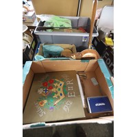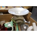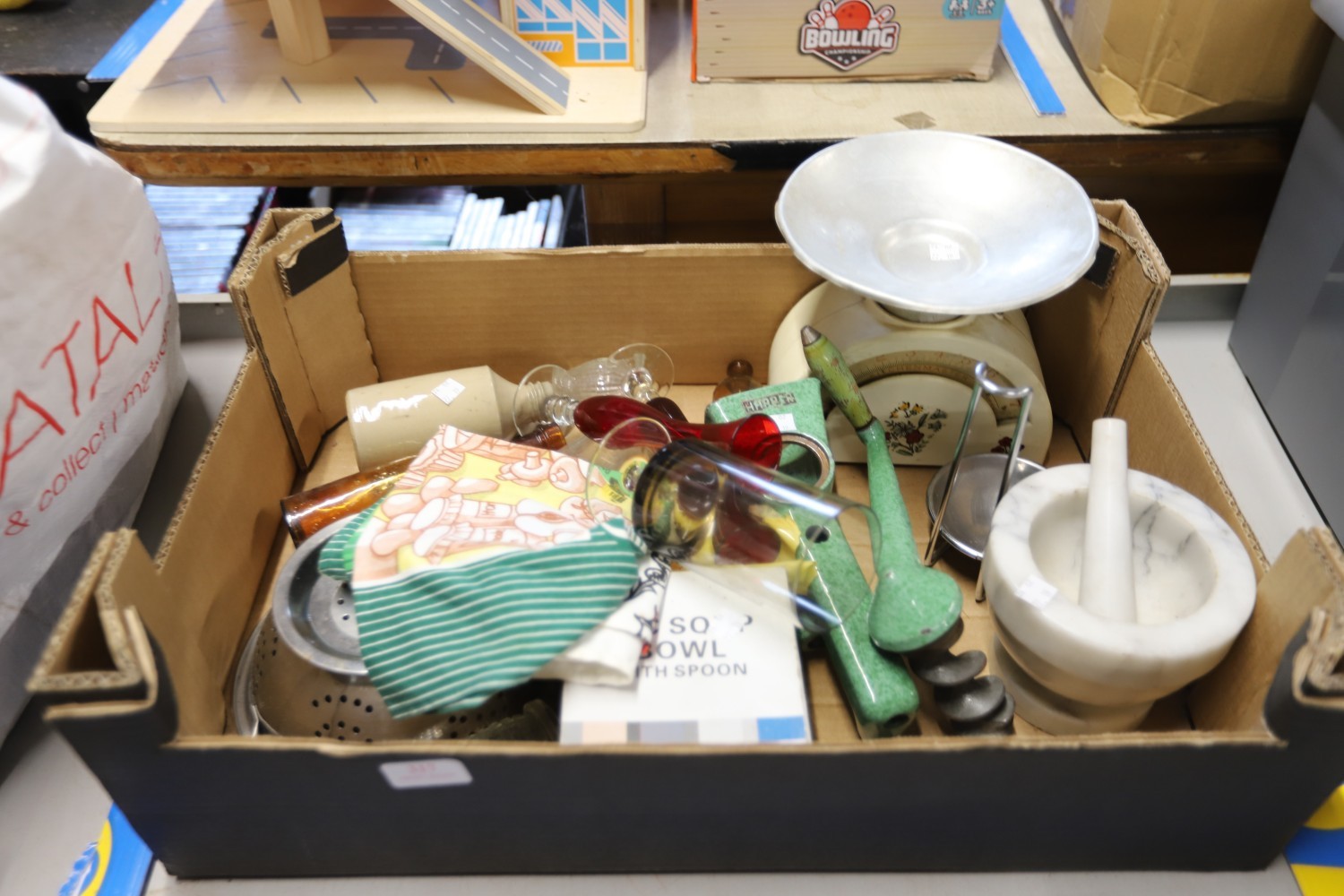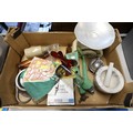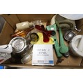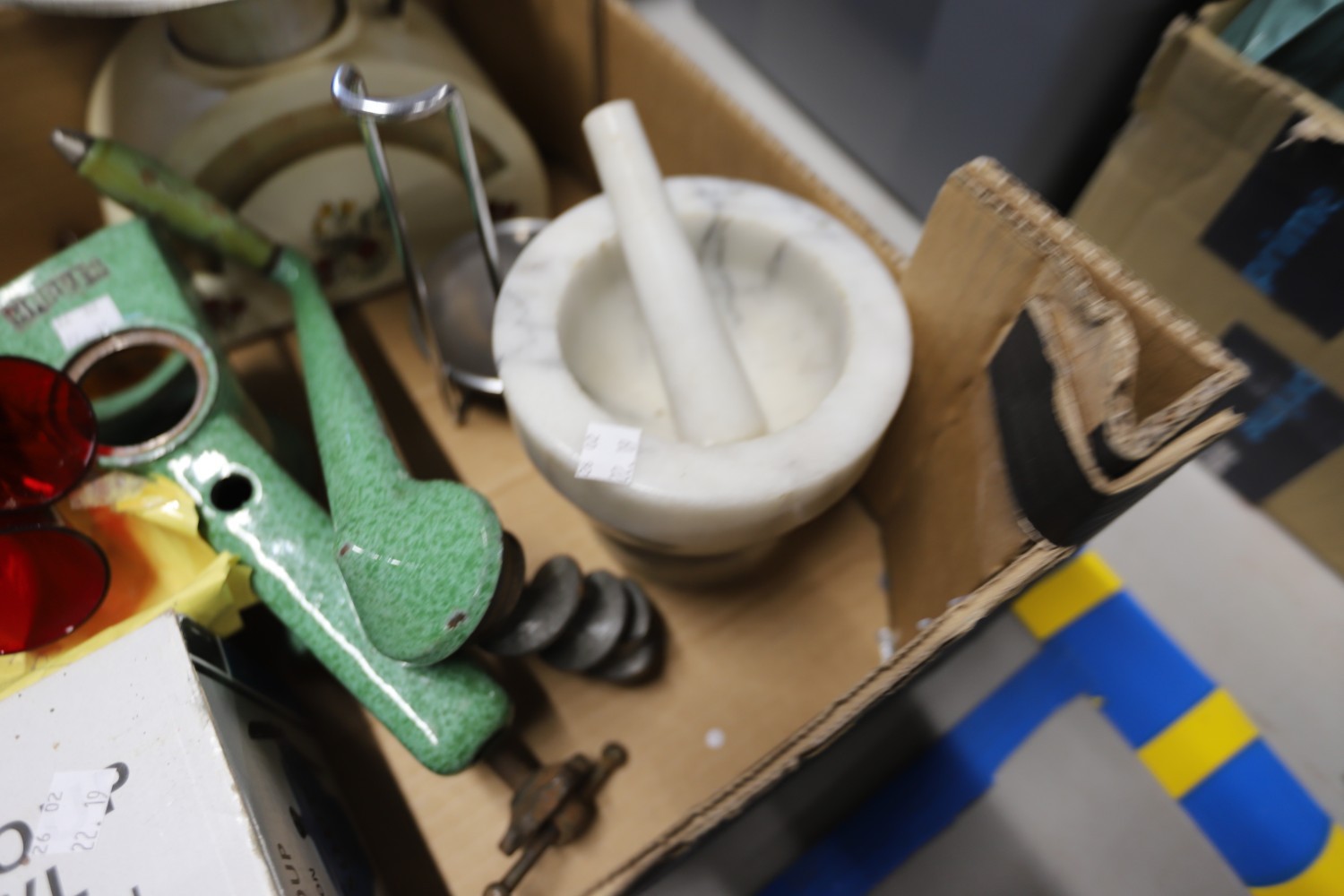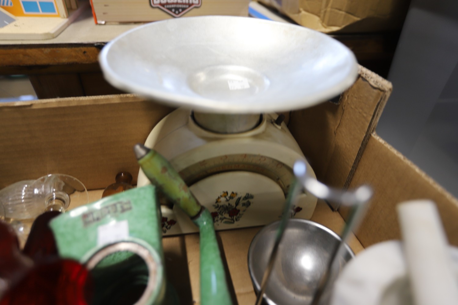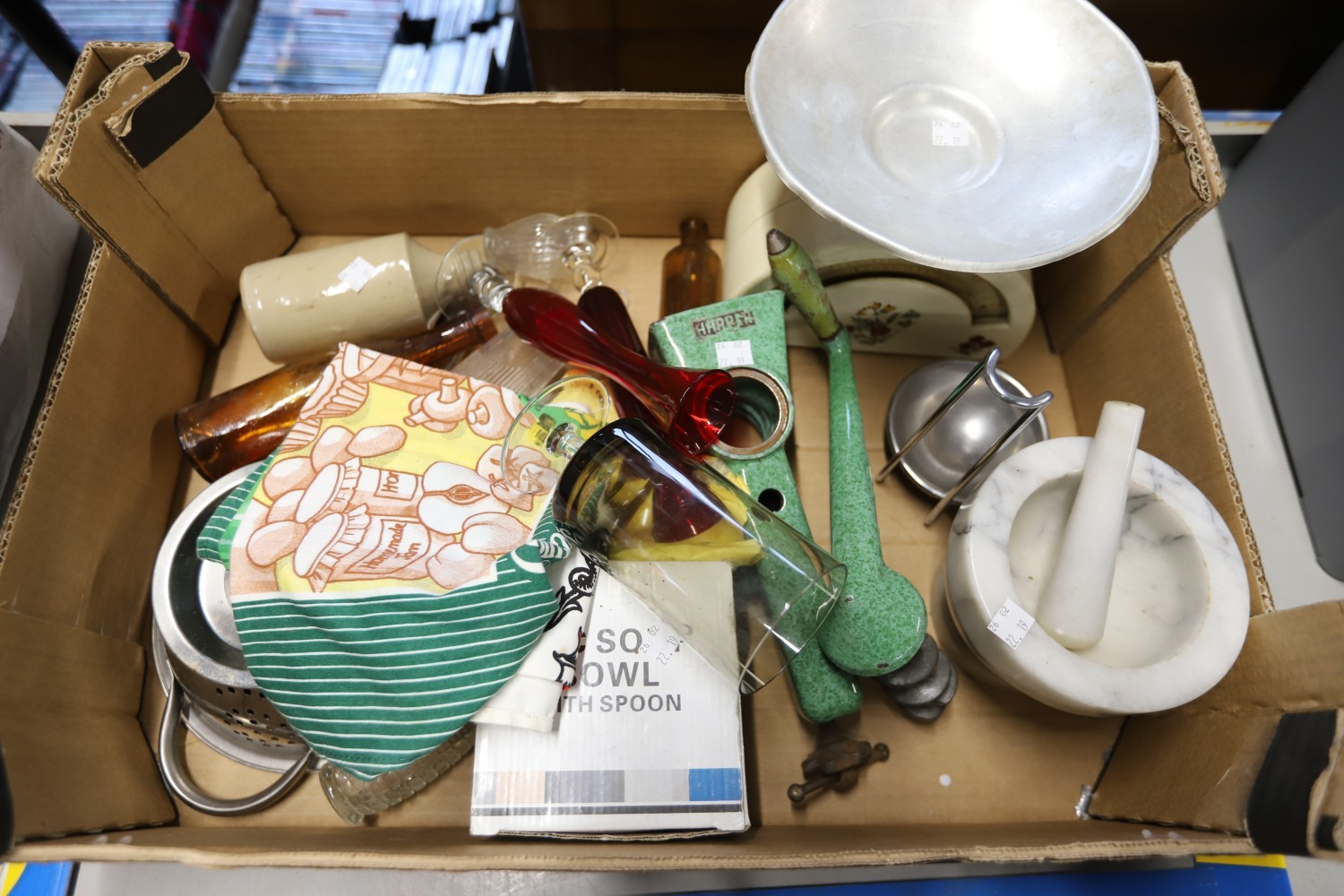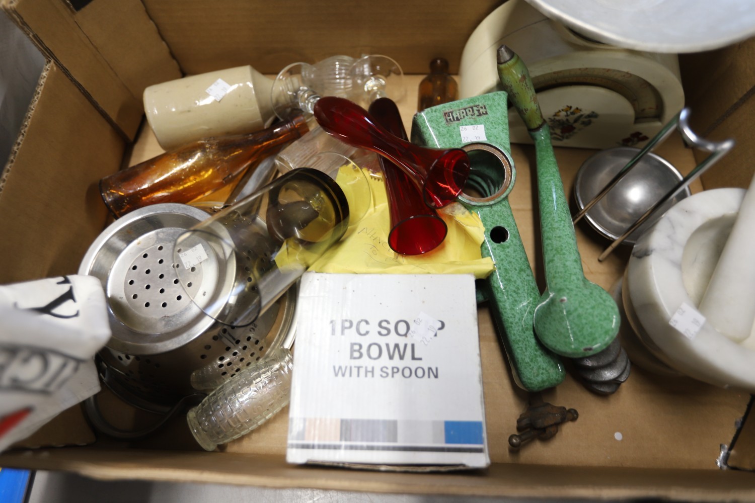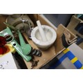 Vintage kitchenalia - pestle & mortar, tin plate scales, carpet heater, stone jars, etc