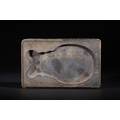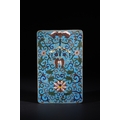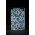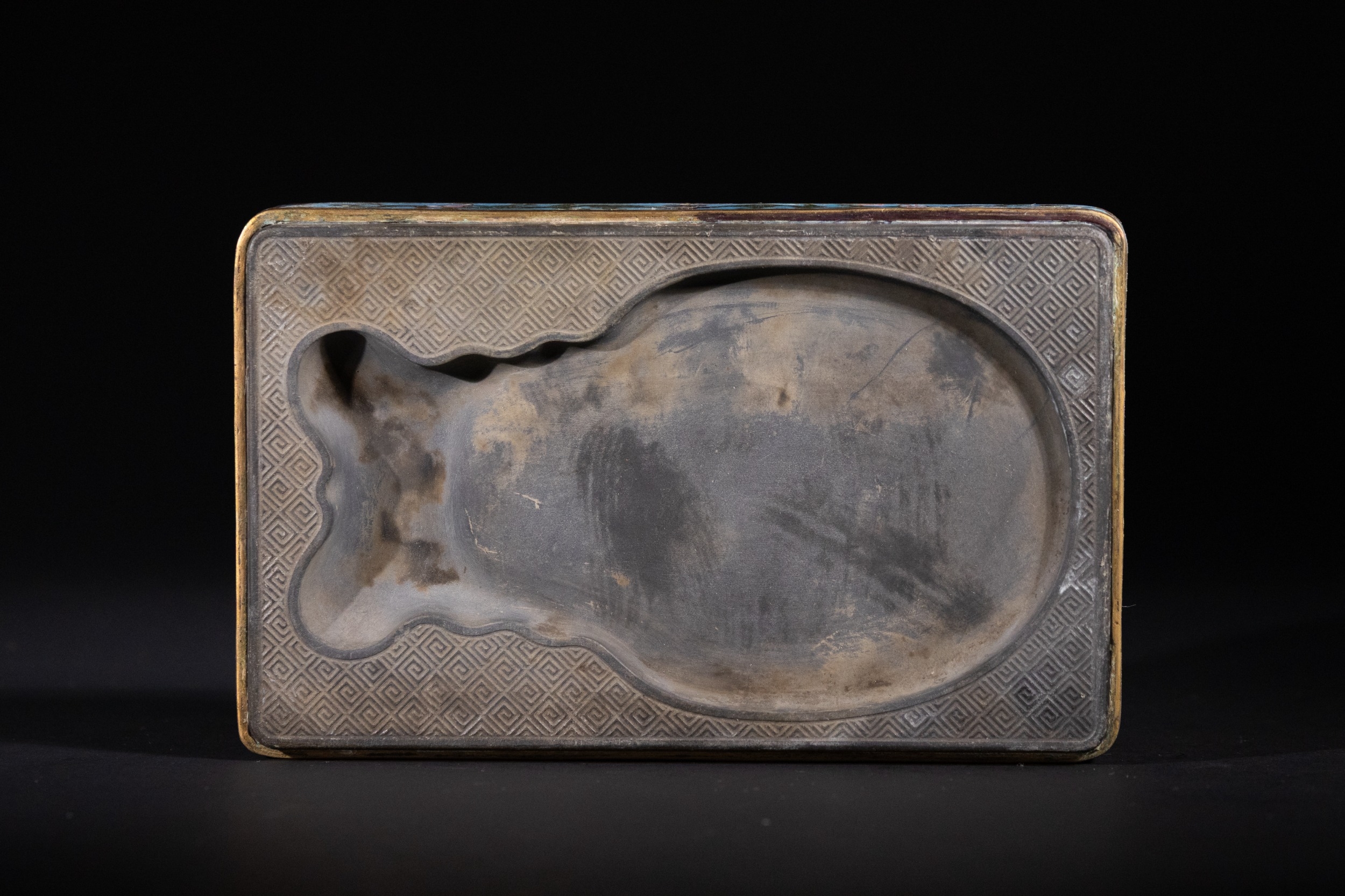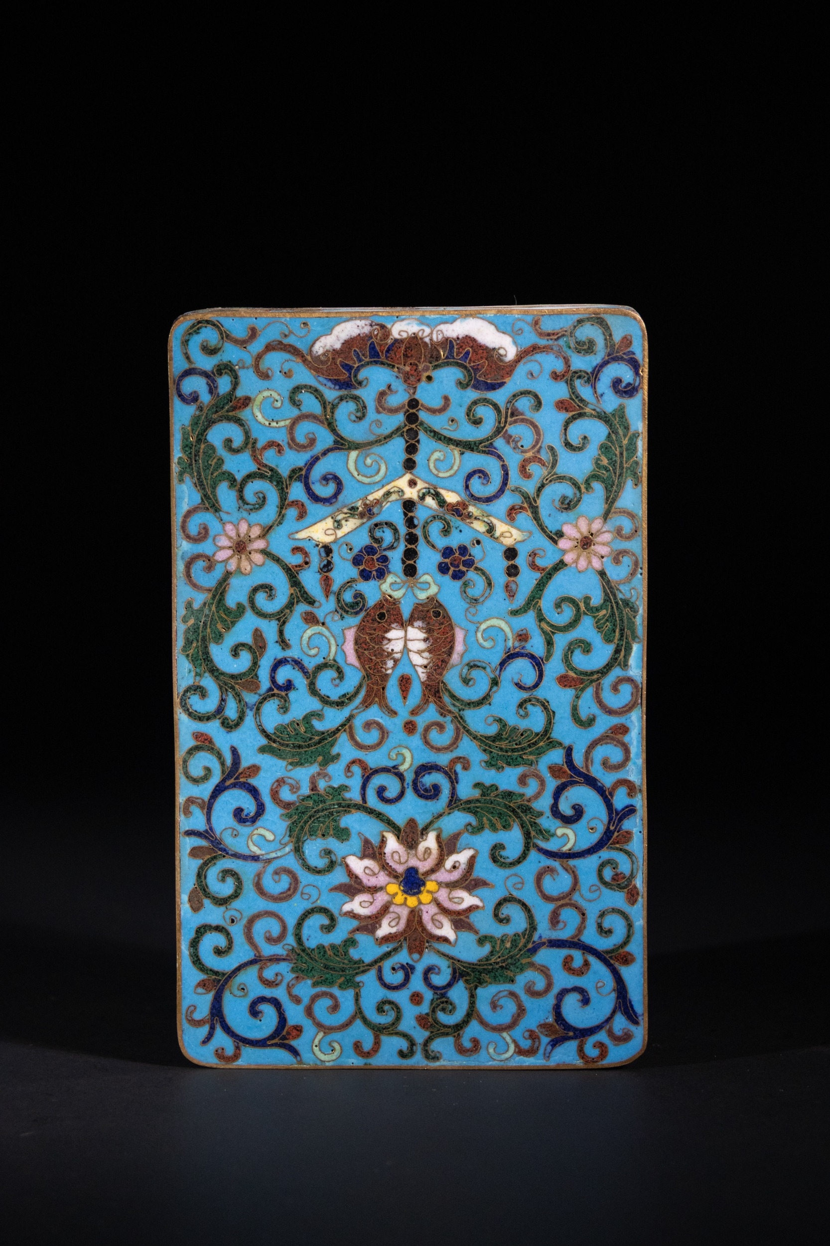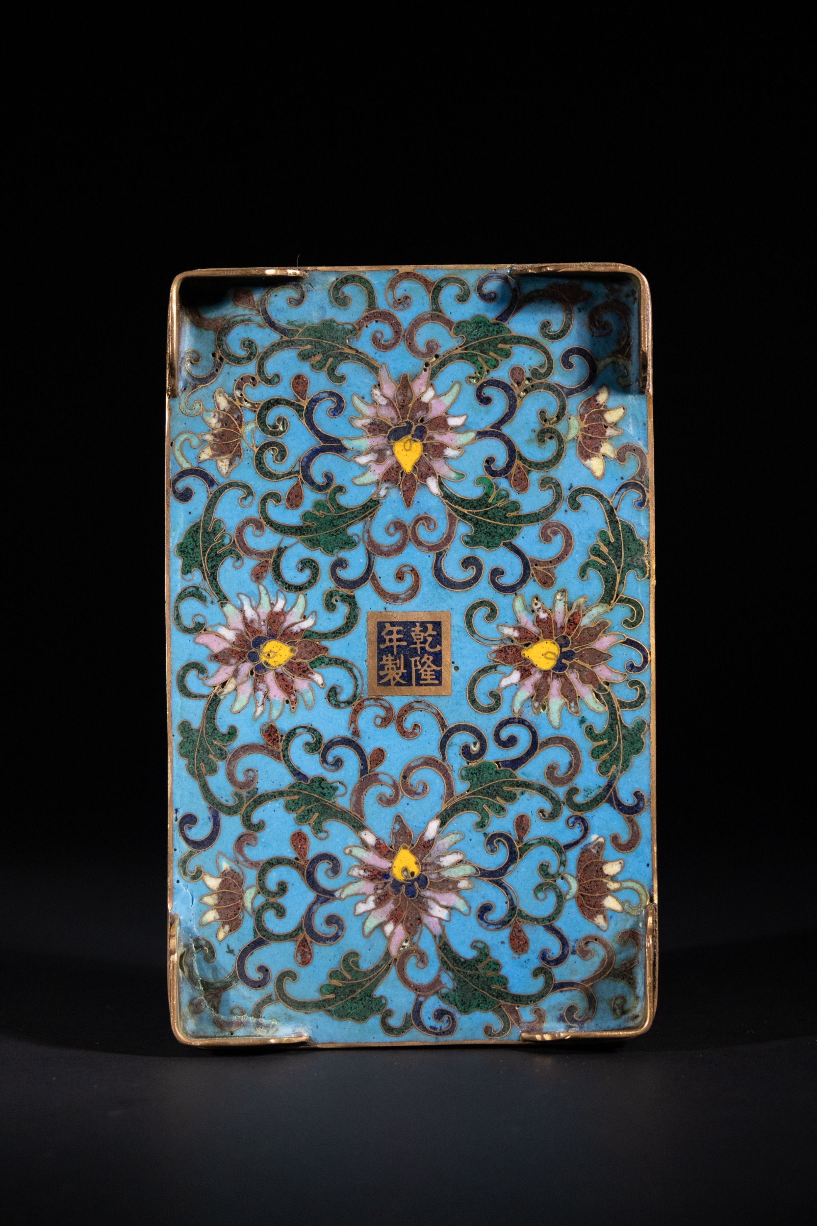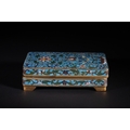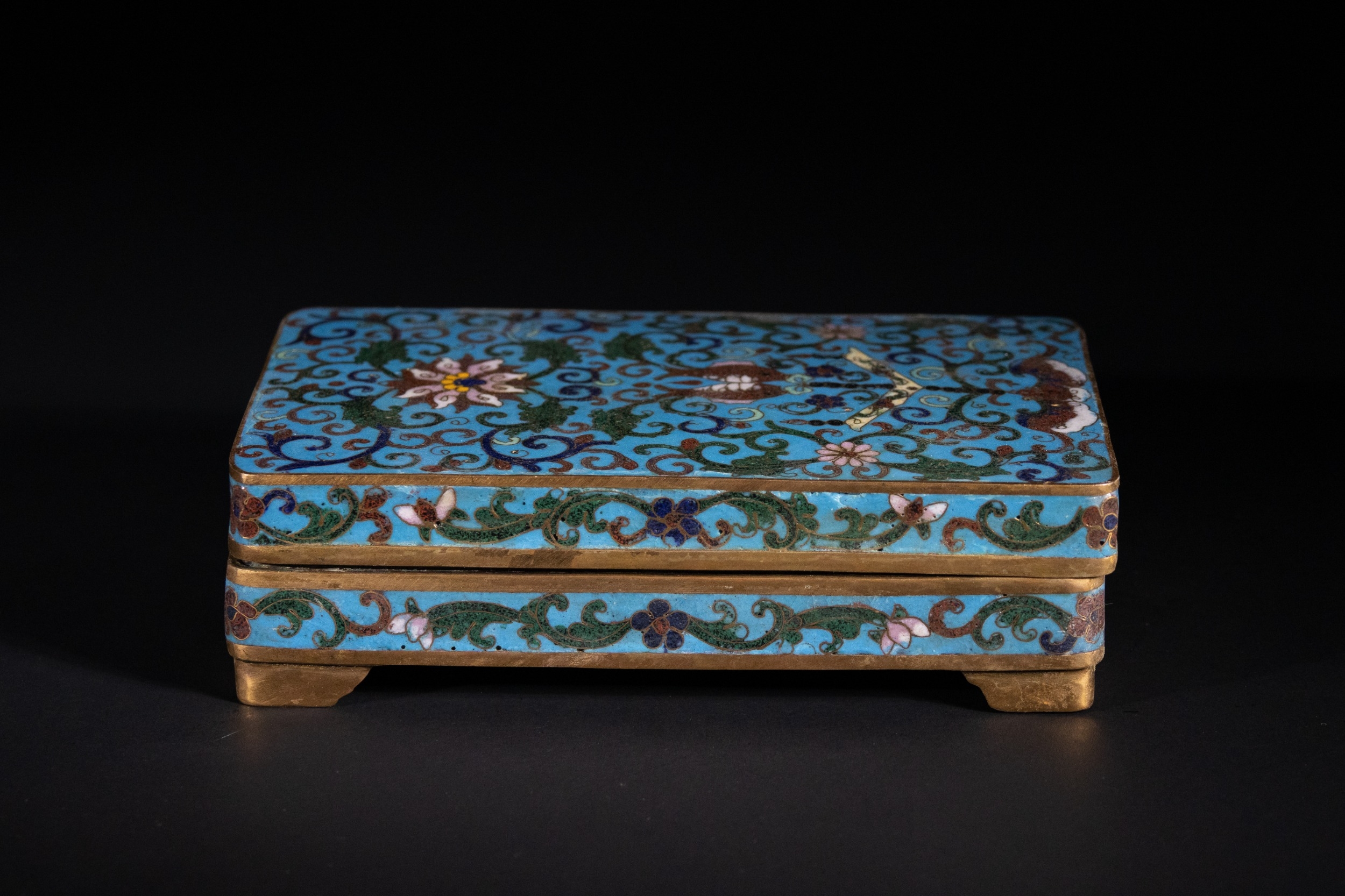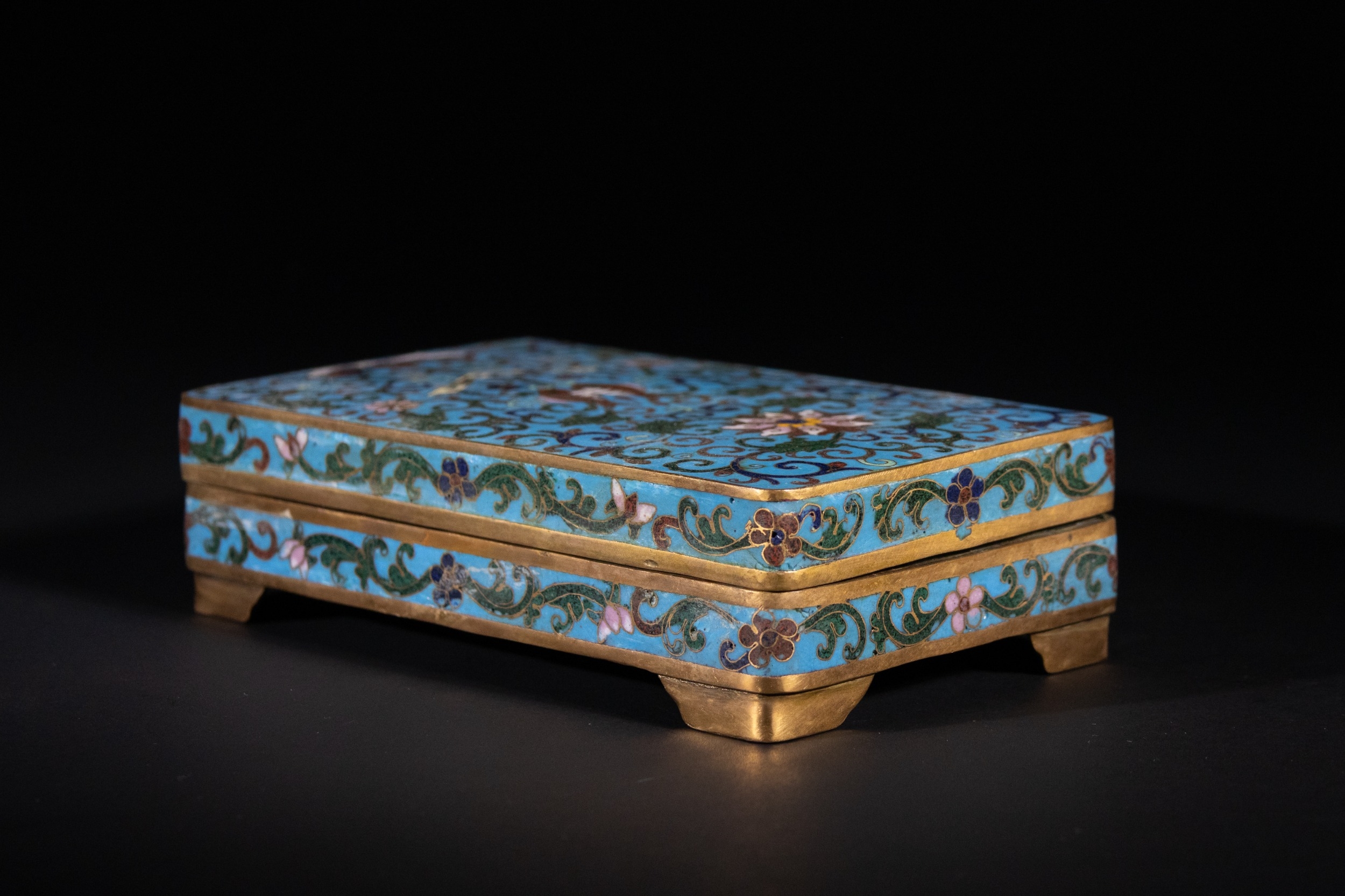 A Chinese Cloisonné Enamel Rectangular Box and Cover, Qianlong Mark, 19h-20th Century - A Chinese cloisonné enamel rectangular box and cover, bearing a Qianlong mark. This rectangular metal box, likely bronze or copper, is profusely decorated with polychrome cloisonné enamel. The exterior features a vibrant light blue ground with intricate scrolling vines and various floral motifs, including a central design on the lid incorporating stylized fish or carp beneath a tassel-like element. The box stands on four small gilt or brass-toned feet, and its edges are similarly finished. The interior of the box reveals a fitted recess, possibly for an inkstone, surrounded by a geometric key-fret pattern, while the underside of the lid bears a four-character mark, 乾隆年製 (Qiánlóng Nián Zhì), meaning "Made in the Qianlong reign, " within a gilt cartouche.