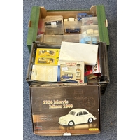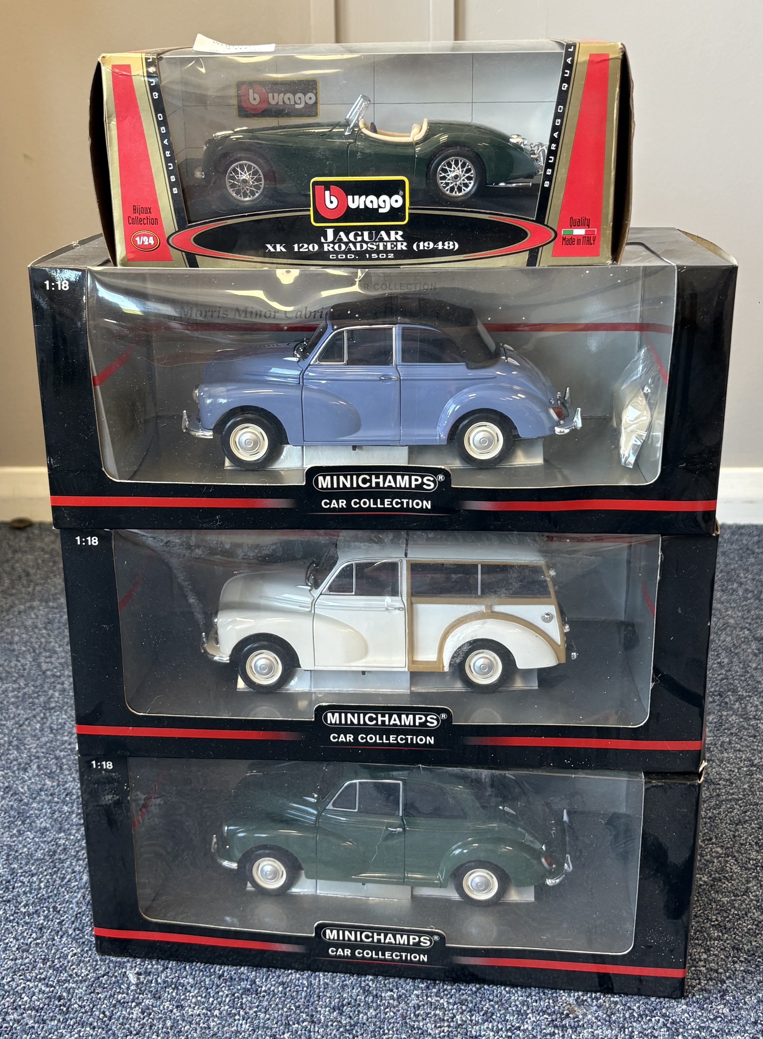 Three boxed 1:18 'Minichamps' Morris Minor diecast model vehicles together with a 'Bburago' 1:24 Jaguar XK120 diecast model vehicle. Est. £20 - £30.