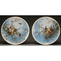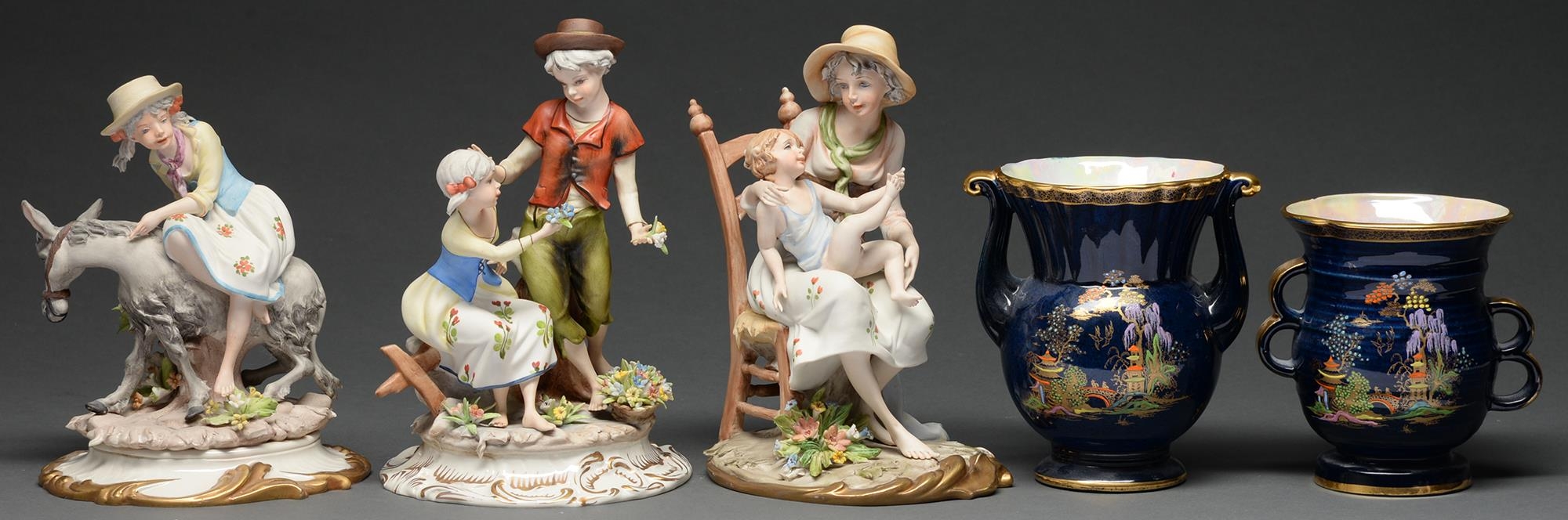 Two Crown Devon blue ground vases and one and a pair of Italian pottery figures, mid 20th c and later, various sizes