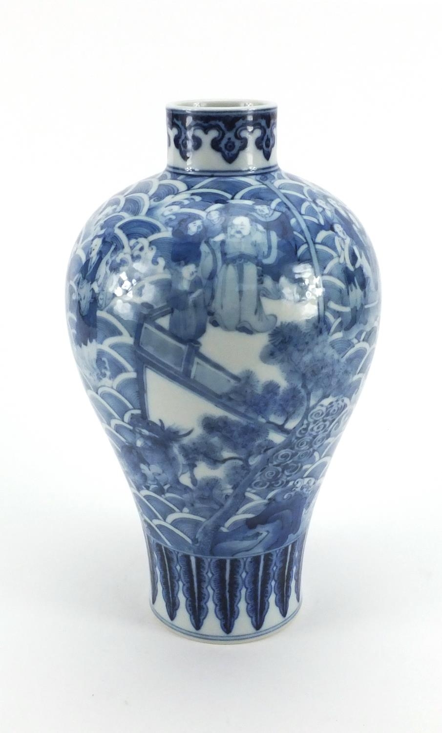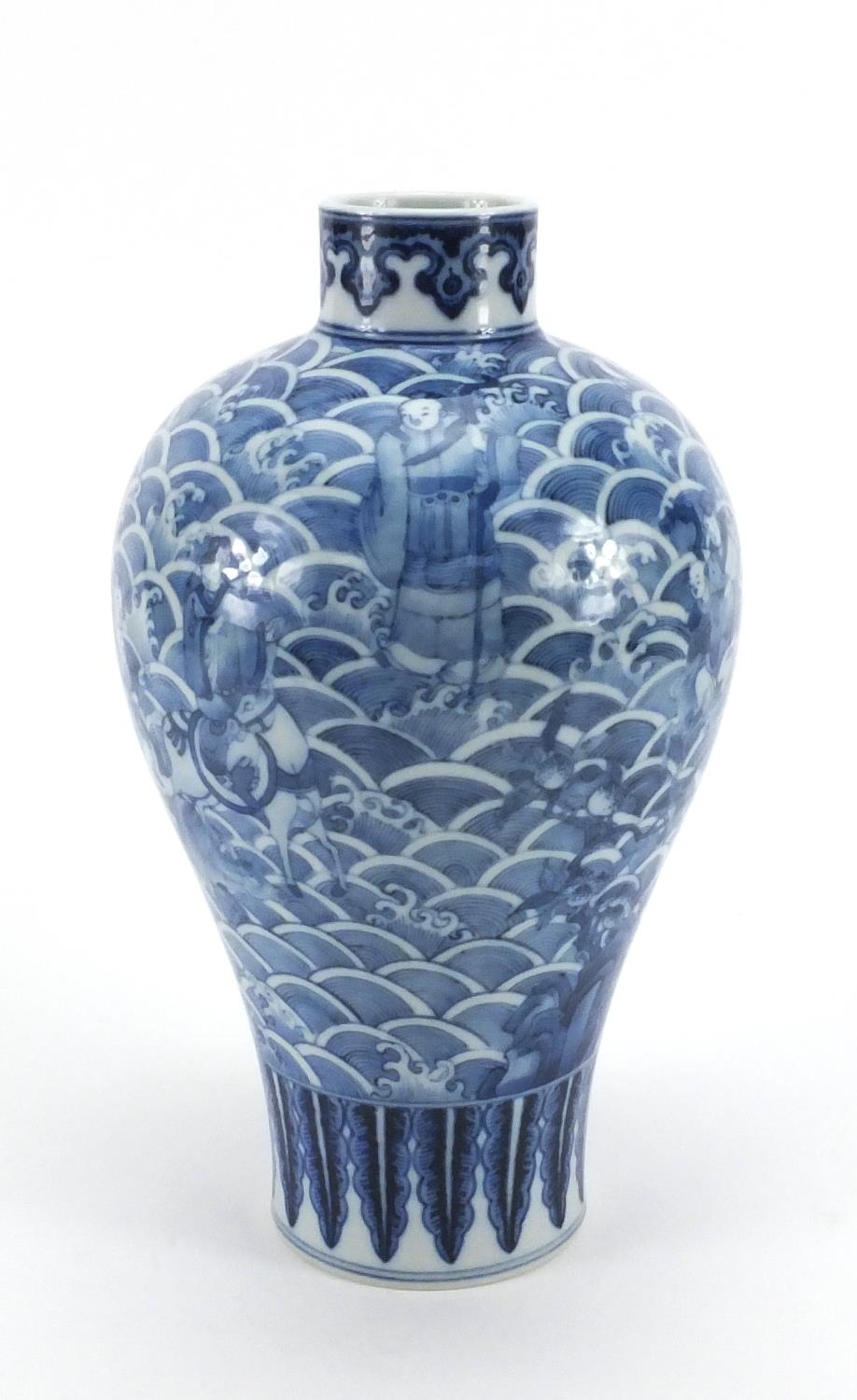 Chinese blue and white porcelain Meipeng vase hand painted with the eight immortals crossing the sea, six figure character marks to the base, 28cm high
