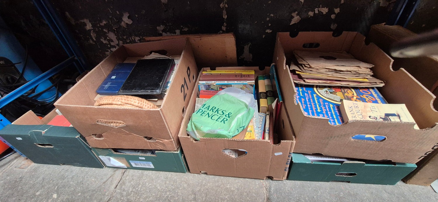 9 boxes of books and 5 boxes of mixed items including ceramics, glass perfumes, LED magnifier, etc