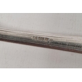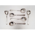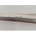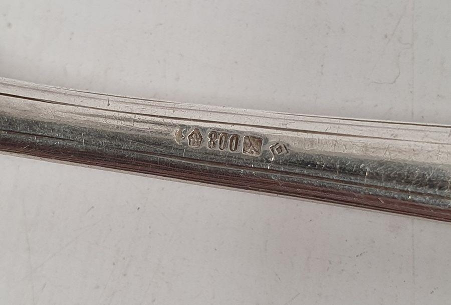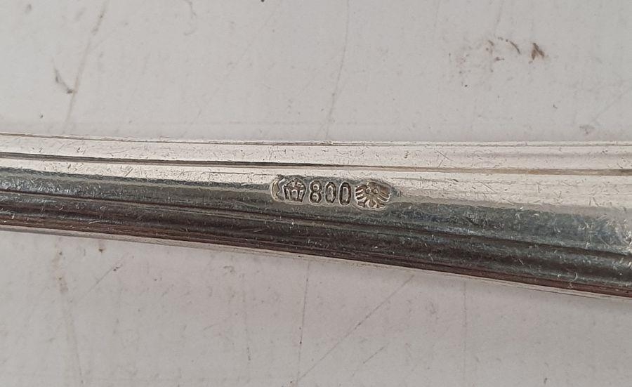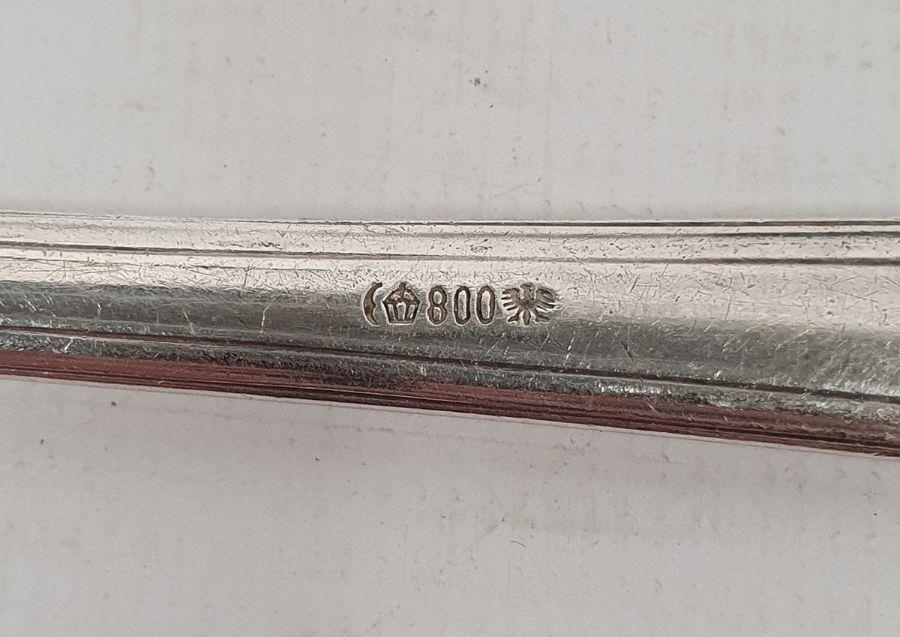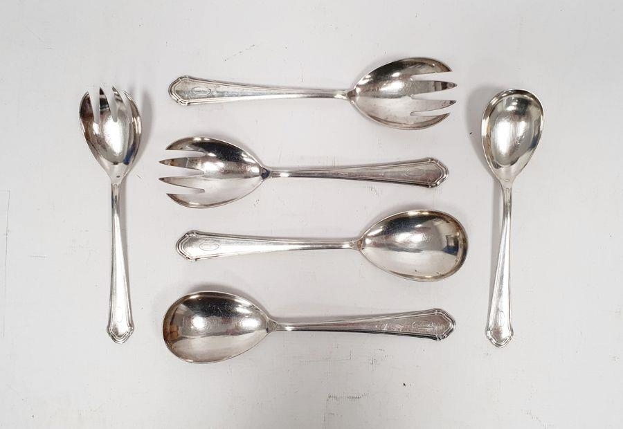 Two large and one small German silver salad server sets with engraved handles, all marked with crescent and crown mark and 800, larger servers 21cm, 5ozt approx. each, smaller servers 18.5cm, 3ozt approx. (6)