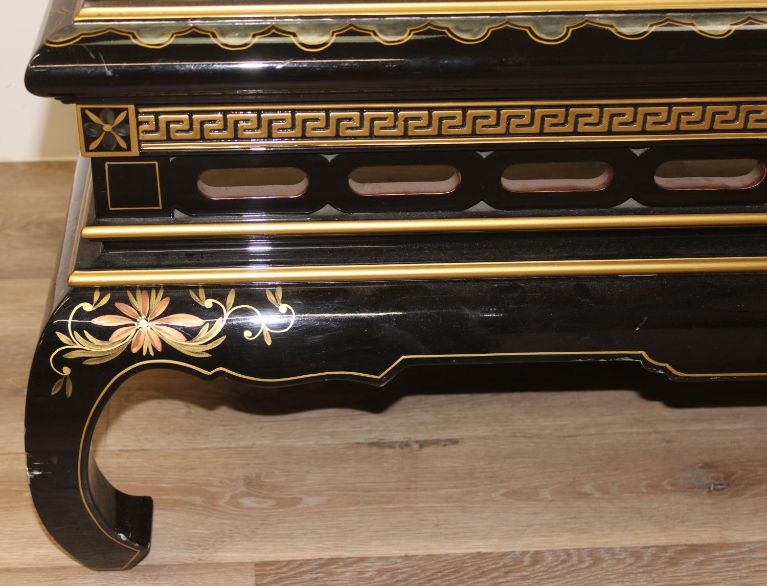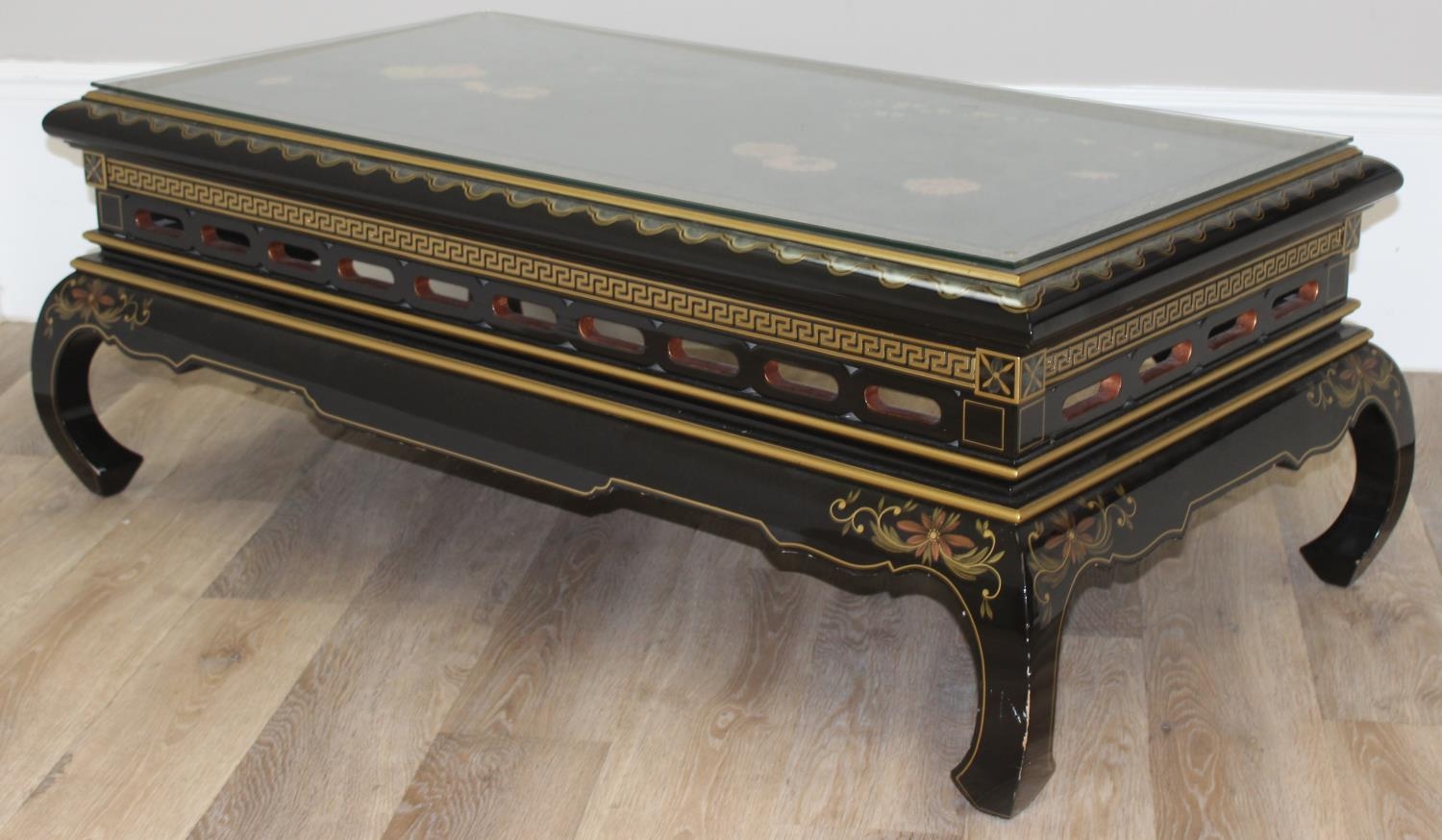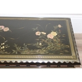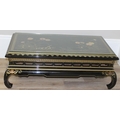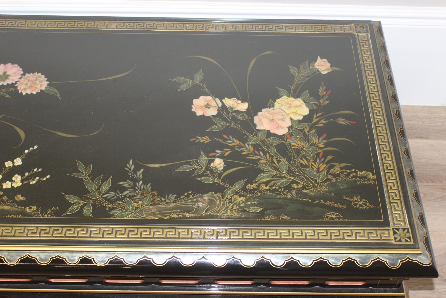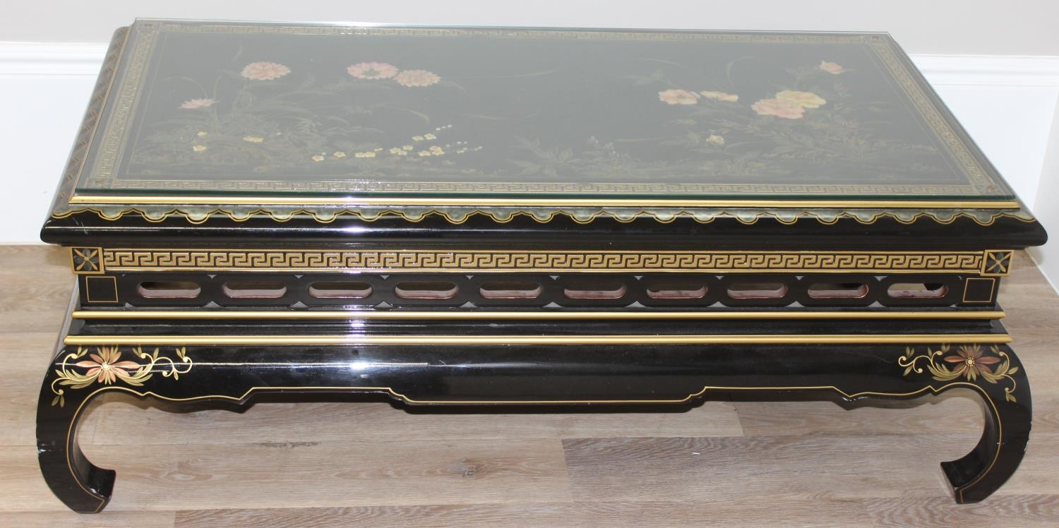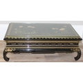 An Oriental black lacquer and floral decorated coffee table, approx 123cm wide x 66cm deep x 47cm tall