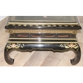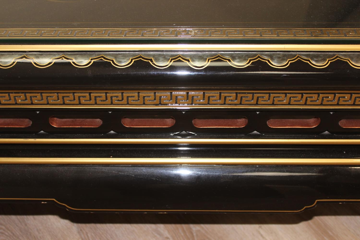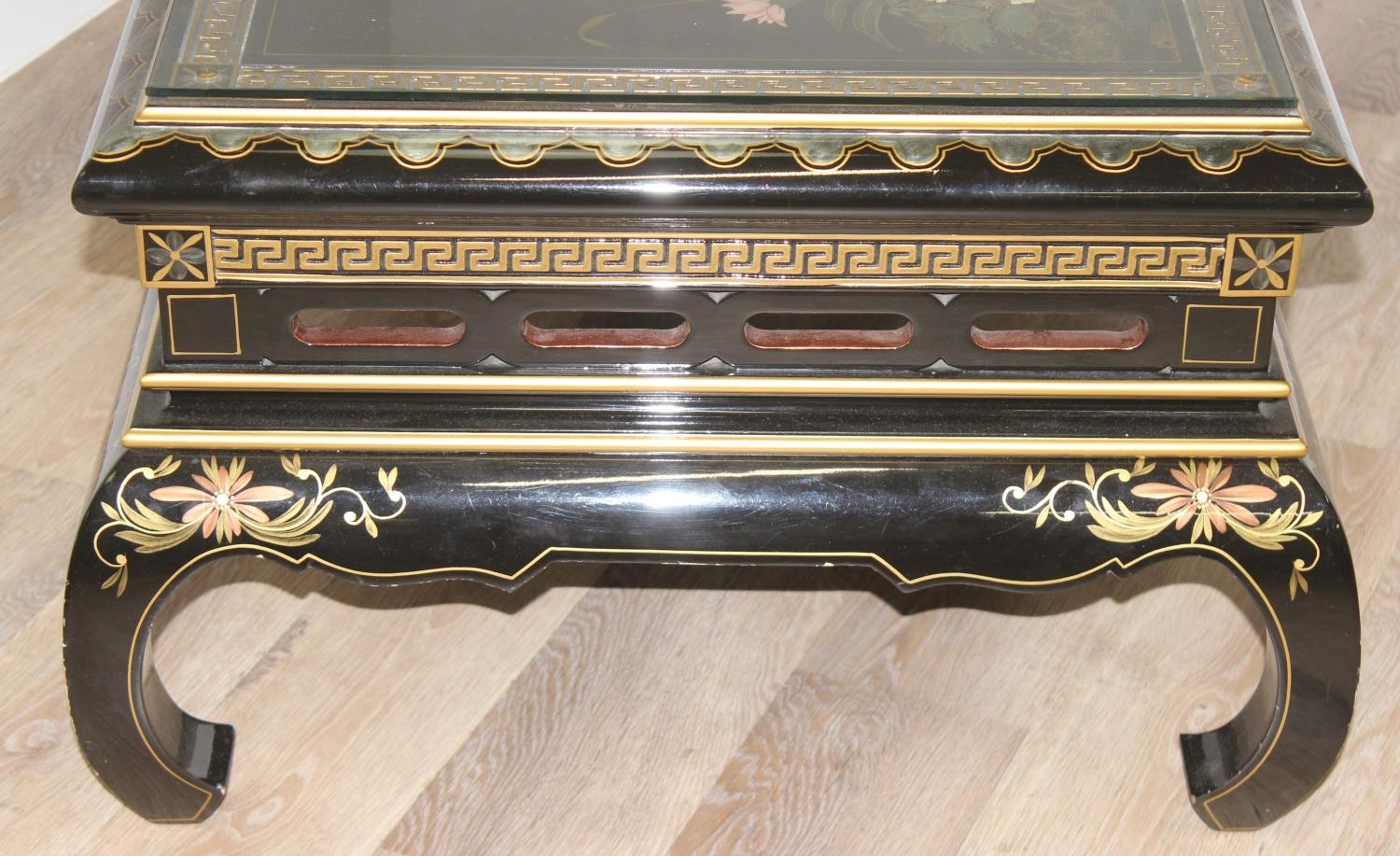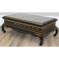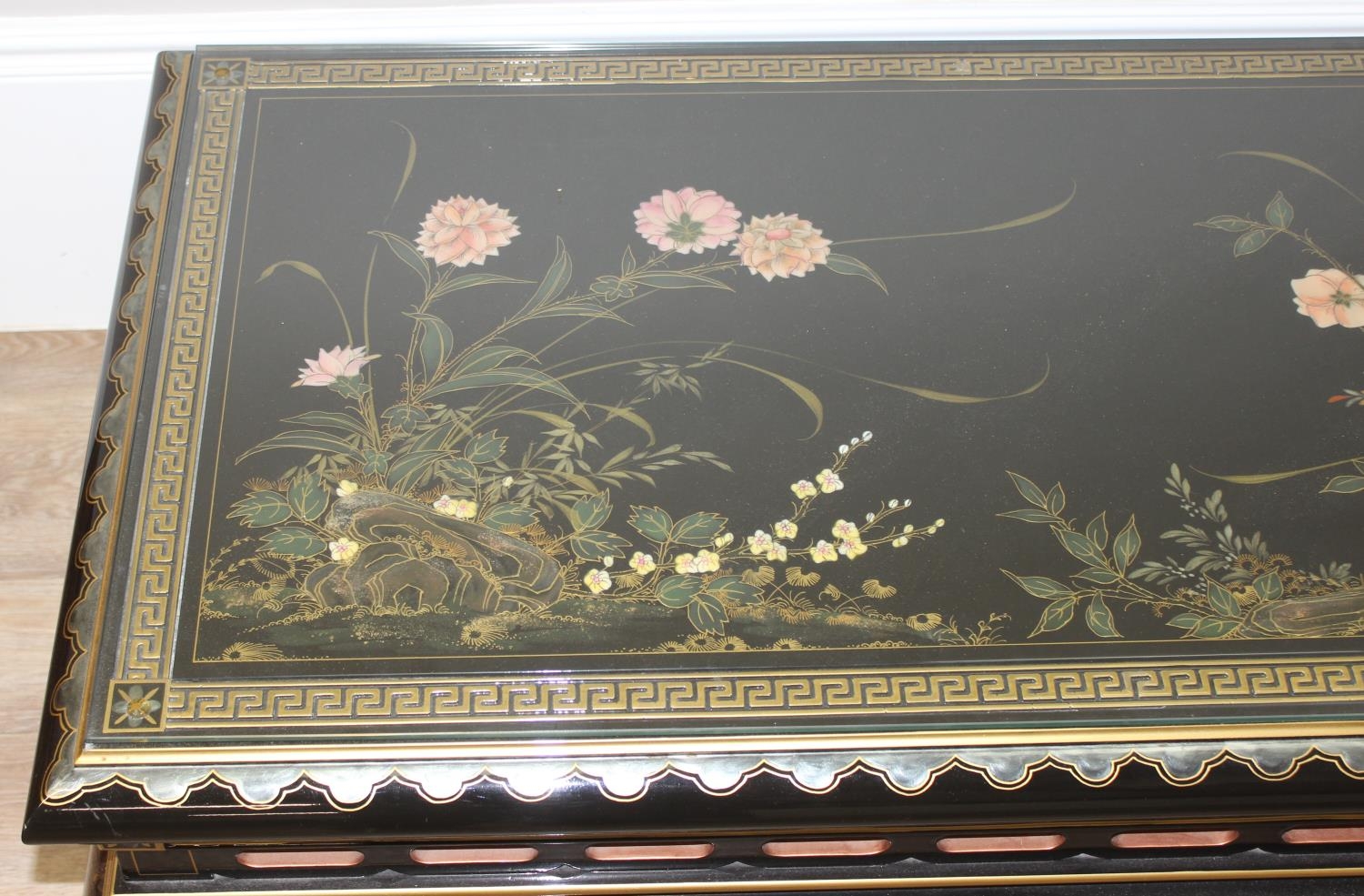 An Oriental black lacquer and floral decorated coffee table, approx 123cm wide x 66cm deep x 47cm tall