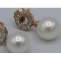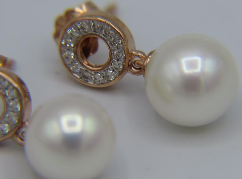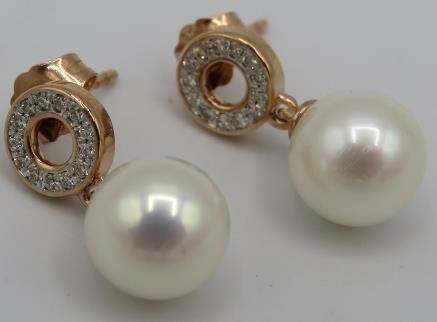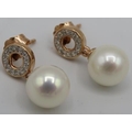 A pair of 9ct rose gold pearl and diamond halo bale earrings. Round cut diamonds approx 0.15ct.