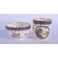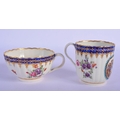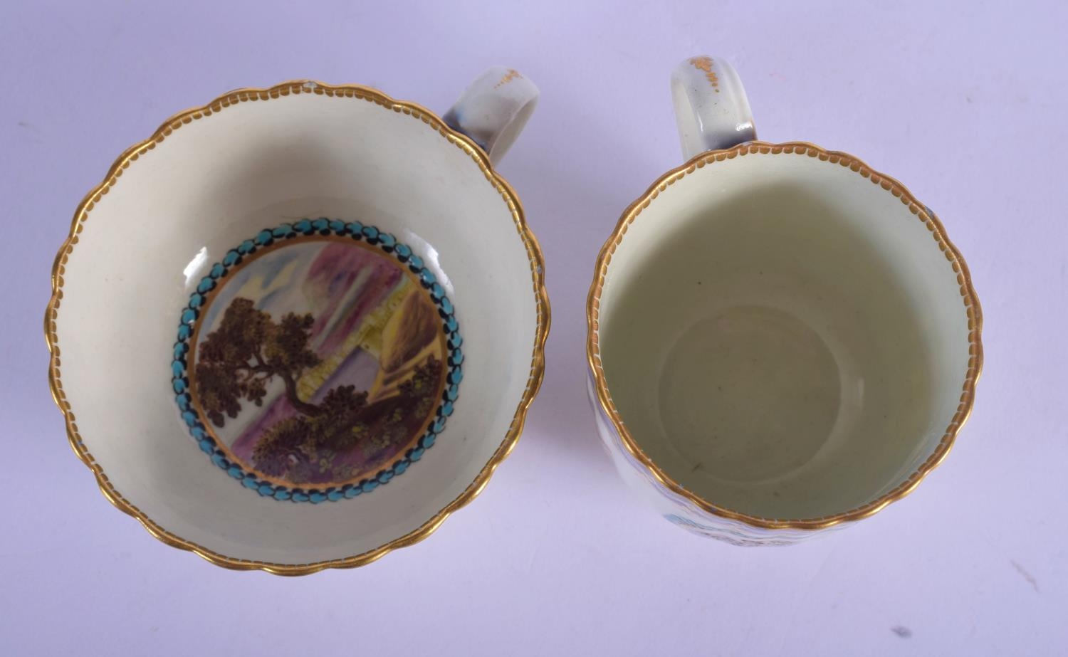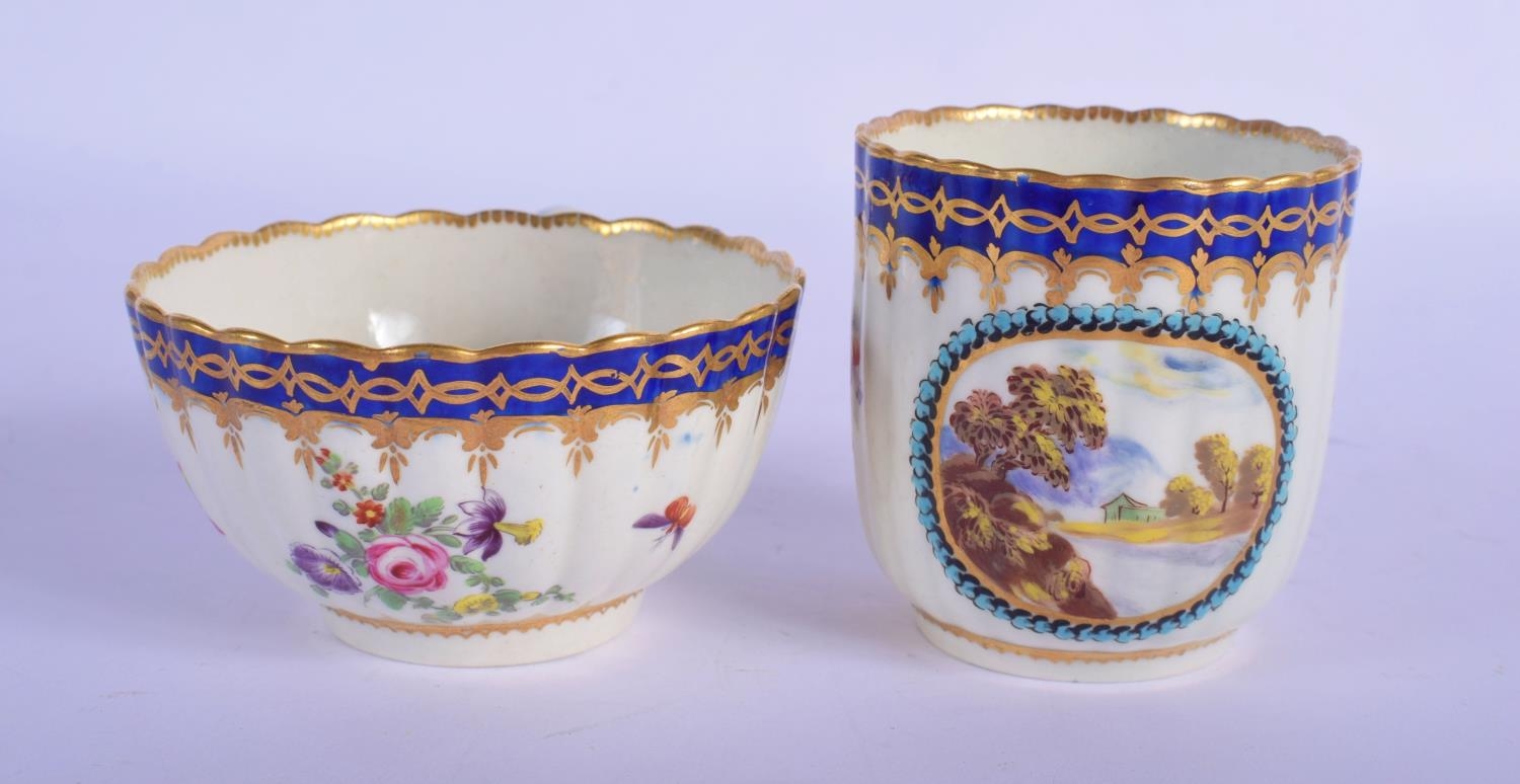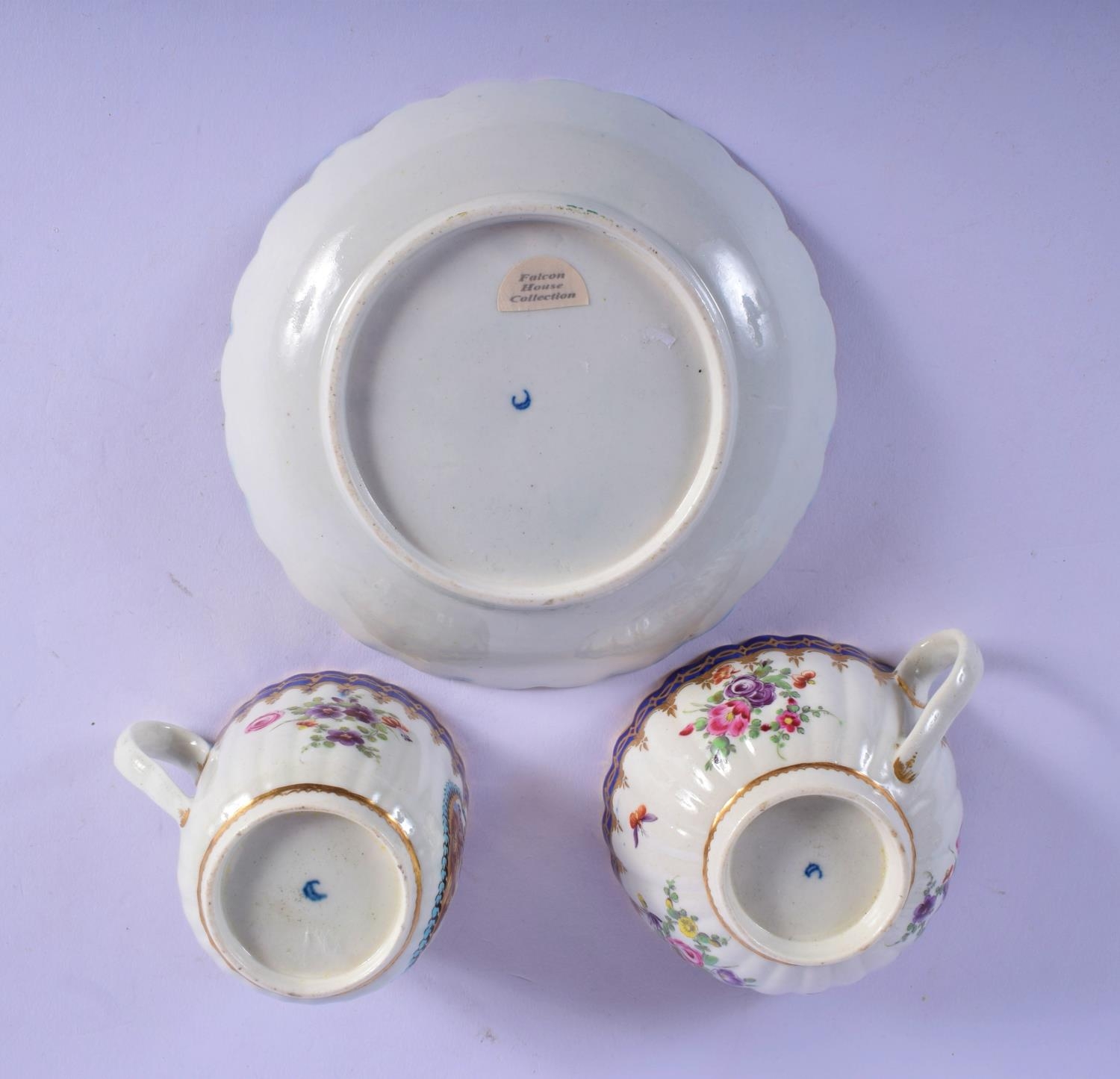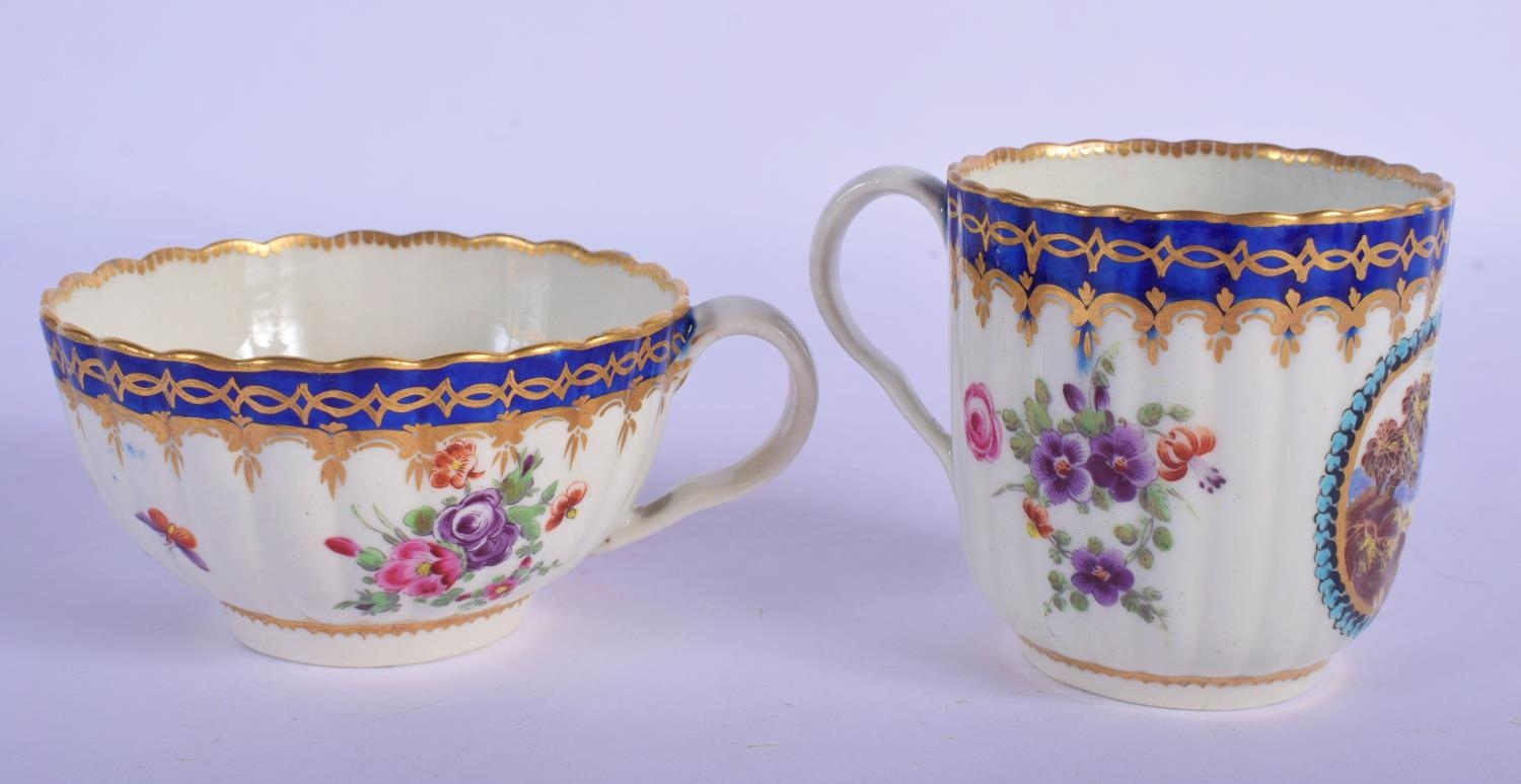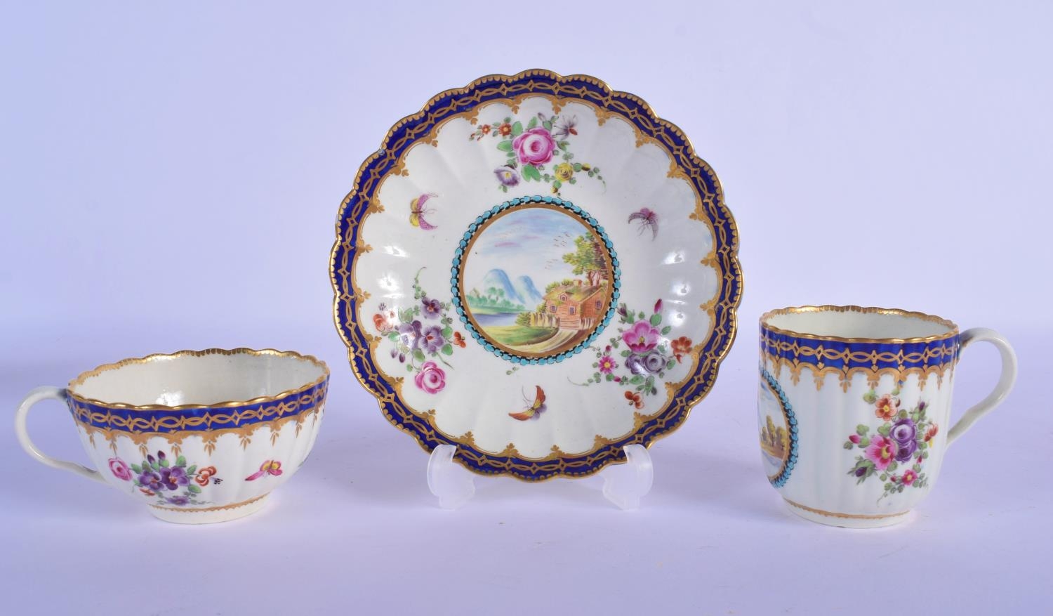 Worcester trio c.1780, comprising a teacup, coffee cup and saucer, the fluted forms decorated in the Dalhousie manner with landscape panels amidst flower arrangements and scattered flying moths, open crescent marks. Coffee Cup 7cm High, Saucer 14cm Diameter (3)
