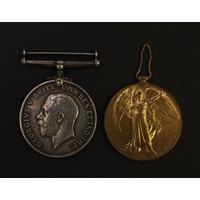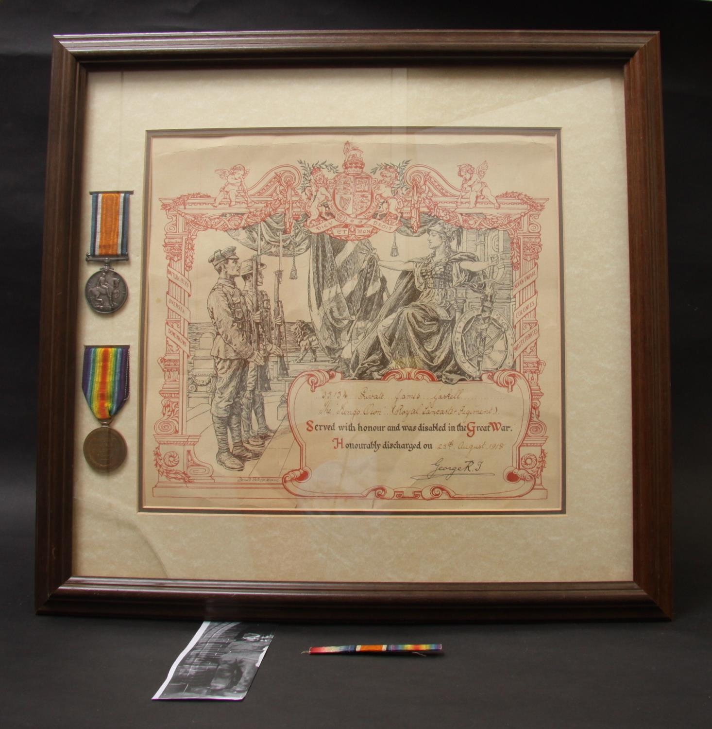 Medals, World War One, Pair, 35134 Private James Gaskell, 1st King's Own Royal Lancastrian Regiment, in large glazed frame with Honourably Discharge certificate dated 25th August 1918, card index confirms Silver Wound badge, and confirms entitlement to two medals only, sold with photocopy picture and 1914/15 trio ribbon bar