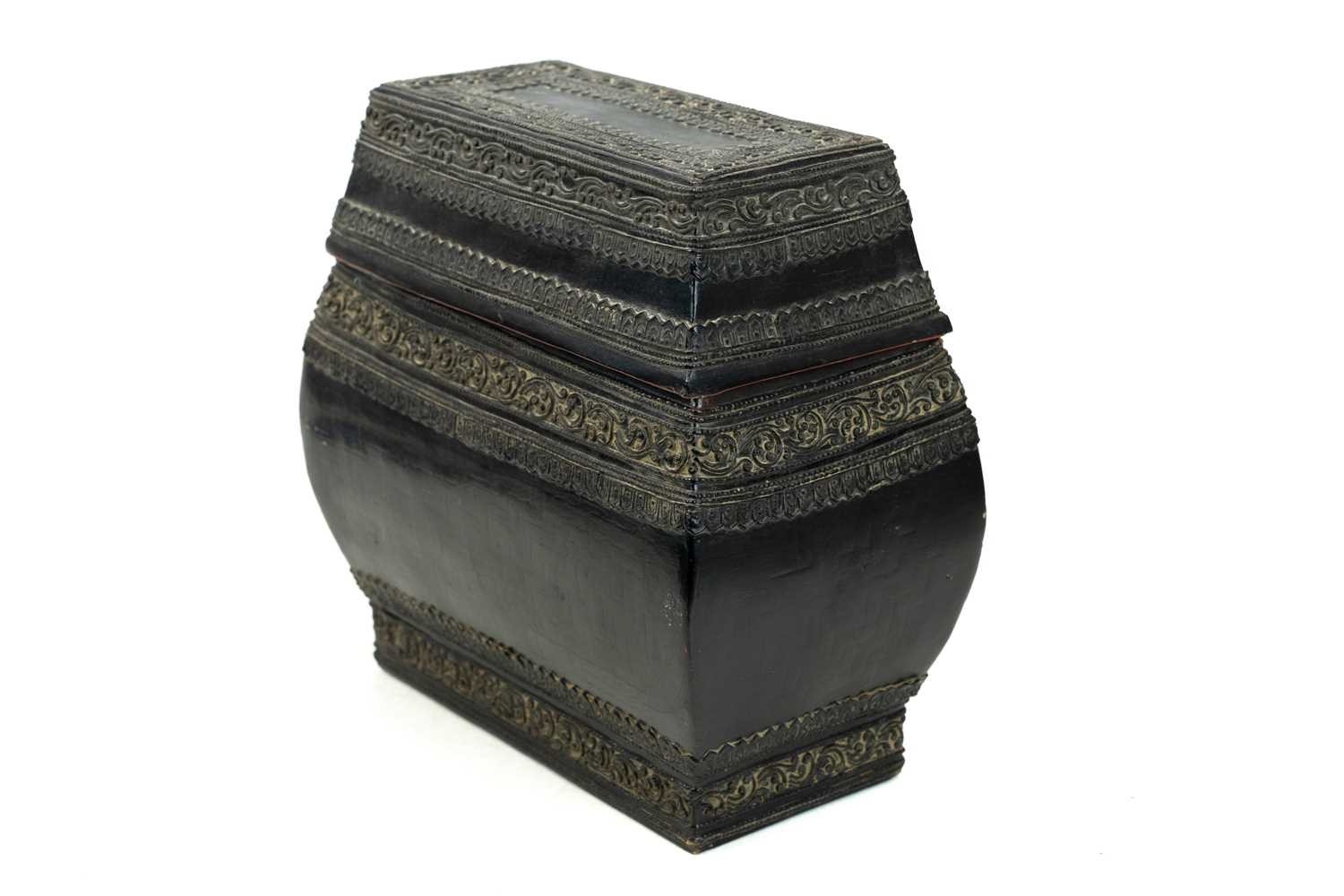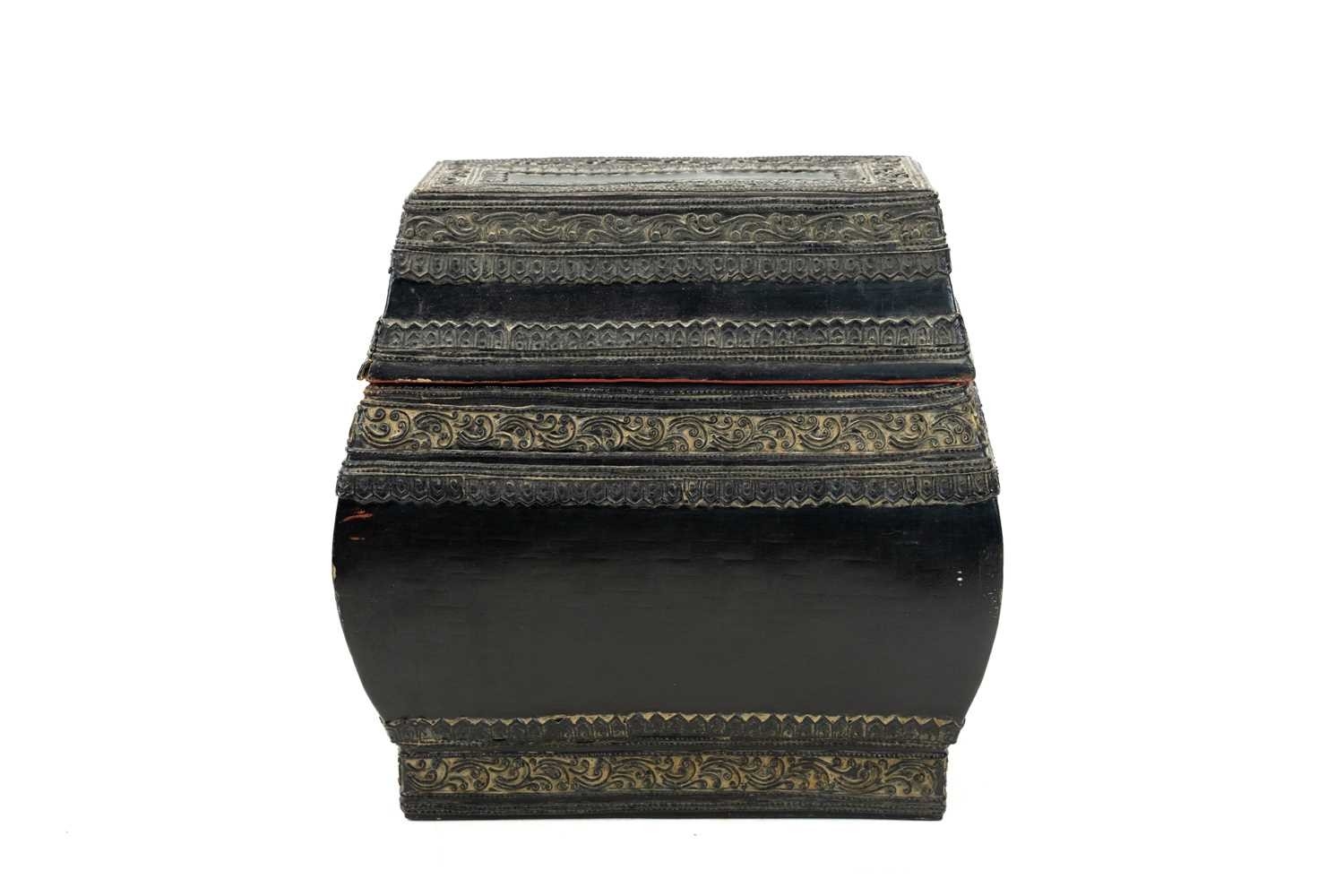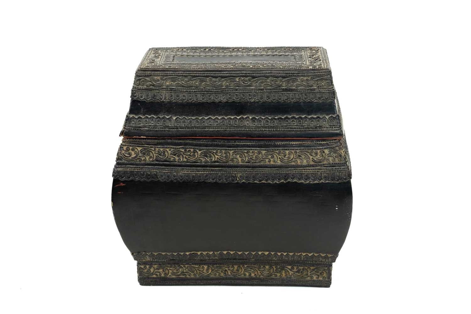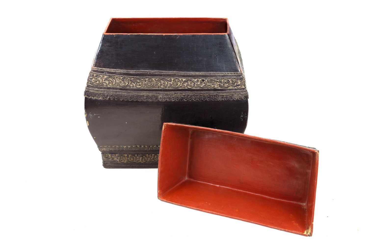 A Burmese black lacquer box with thayo work decoration. The base and cover both with red lacquer to interior. Height 29cm, width 29.5cm, depth 16.5cm. Provenance: Purchased by the vendor in Burma, 2000.