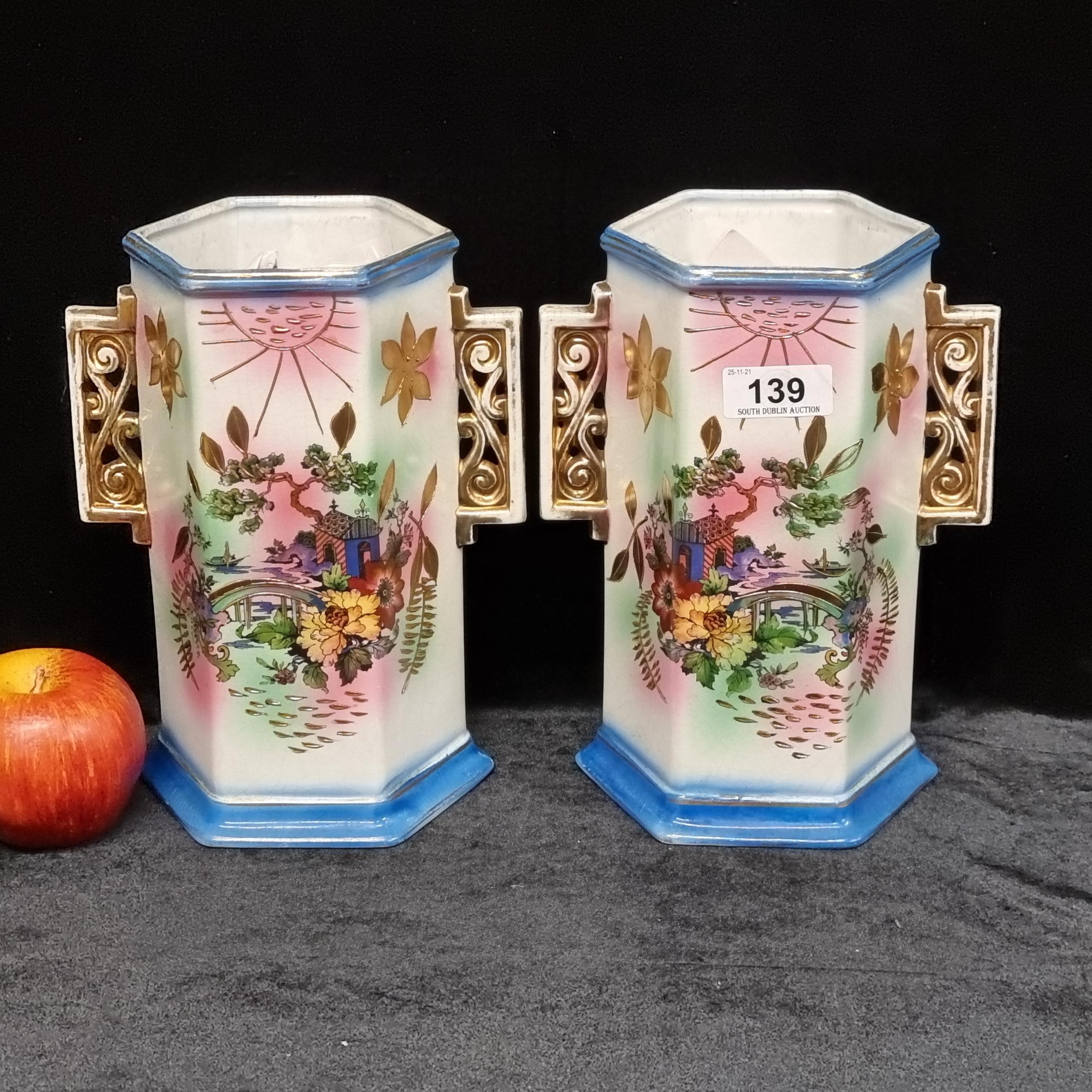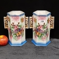 A pair of Japanese hexagonal vases with rectangular scroll handles. These unusual vases feature a Japanese scene, showing chrysanthemums, bridge, pagoda and cherry blossom tree in vibrant tones with raised gold detail.