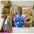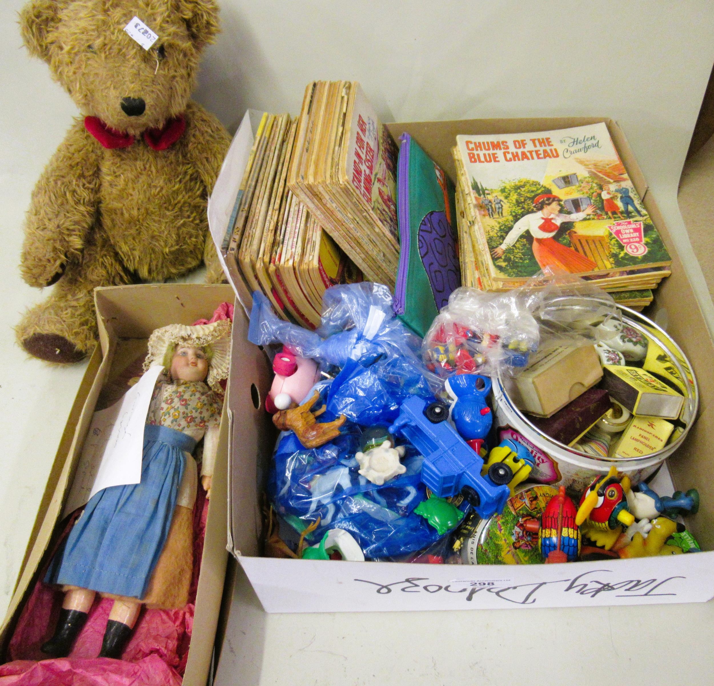 Small Continental small bisque headed doll with papier mache body, modern plush teddy bear, a small quantity of girl's magazines and various children's plastic toy figures etc.