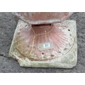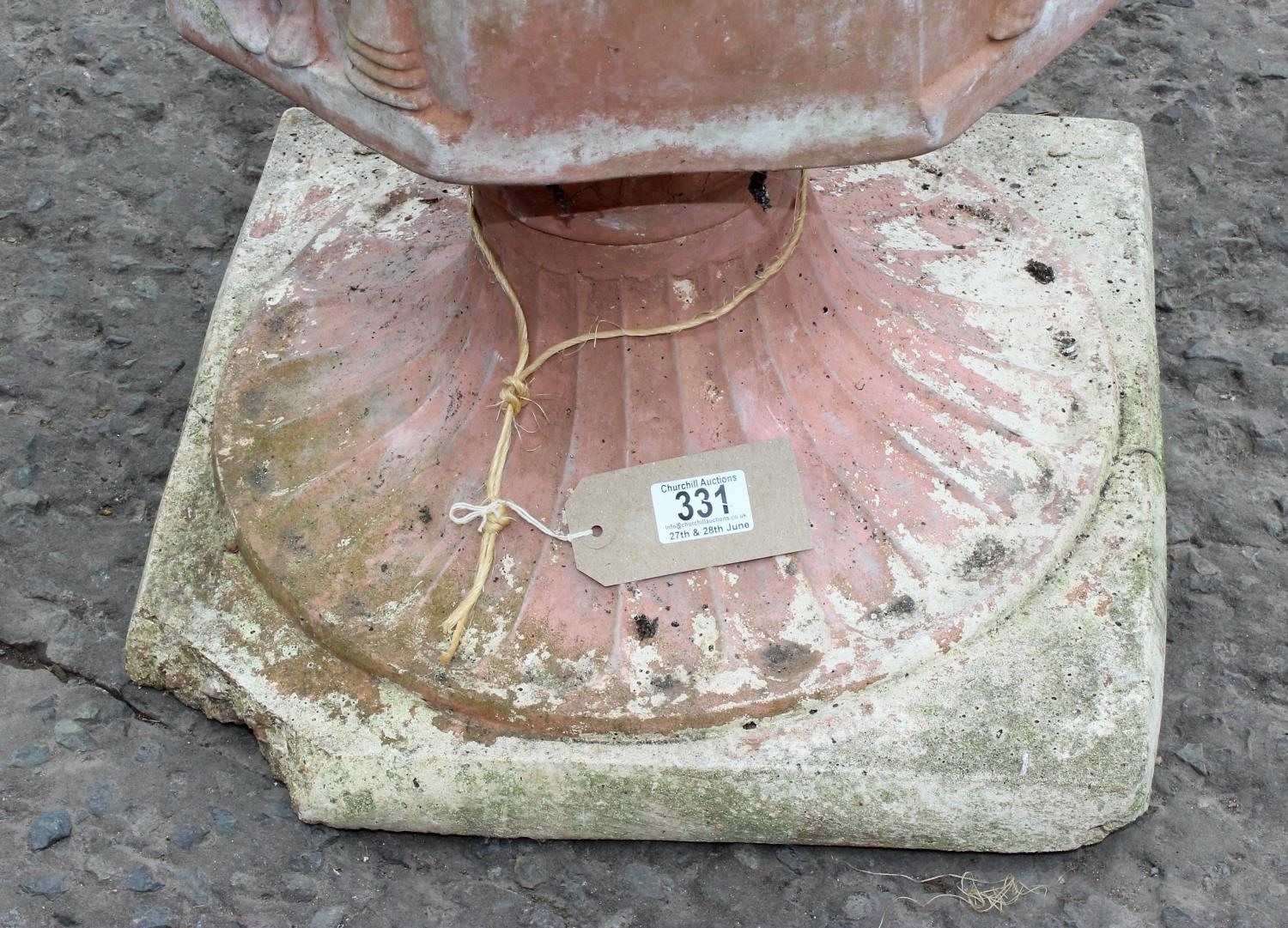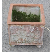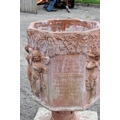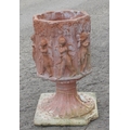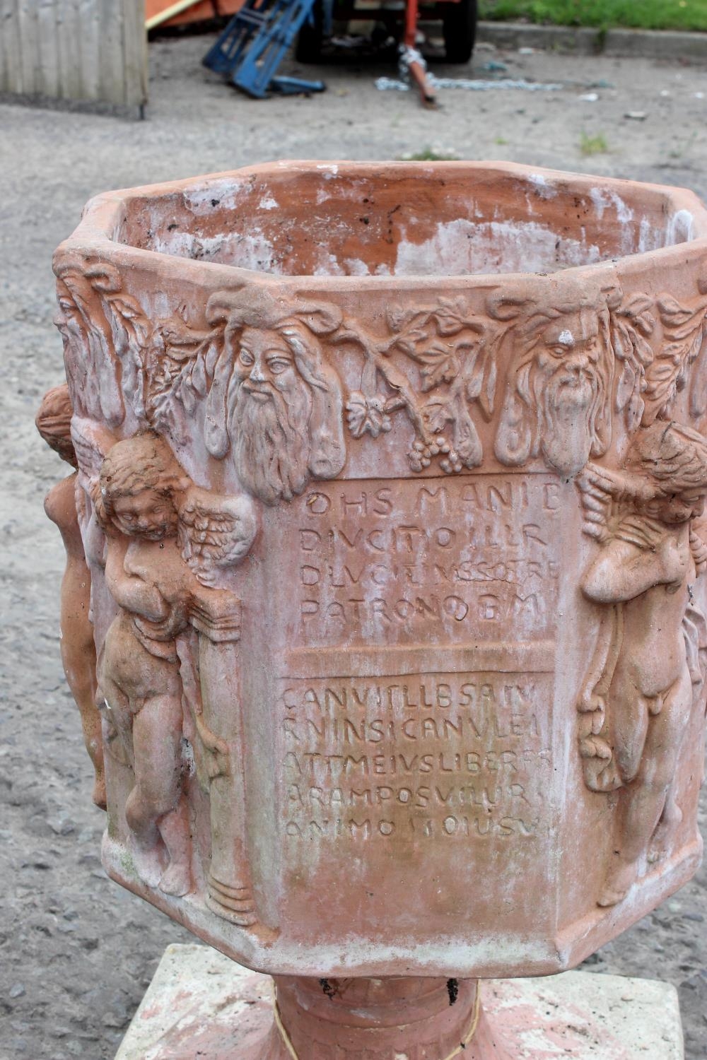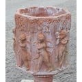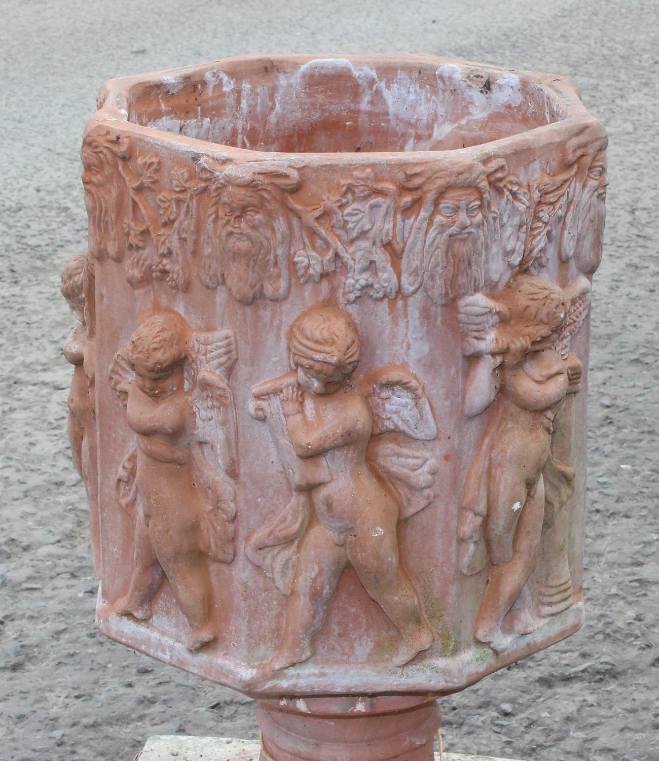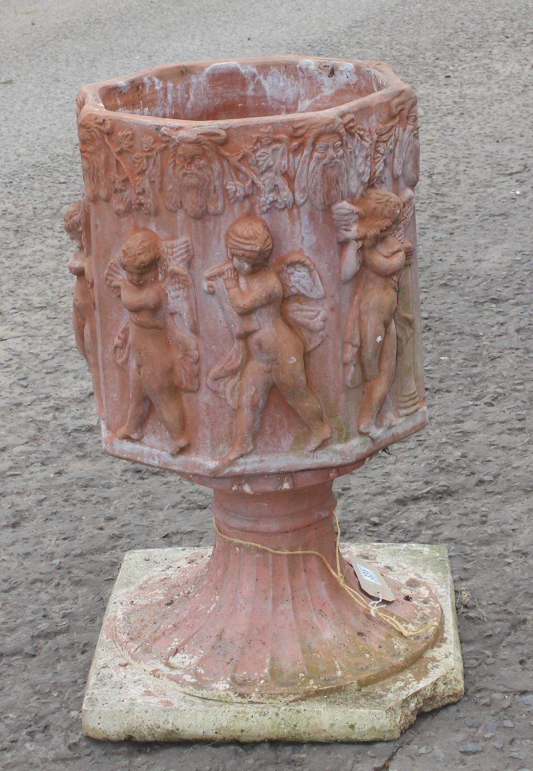 A large terracotta garden pot decorated with Bacchanalian cherubs in relief, on associated painted concrete base, approx 70cm tall