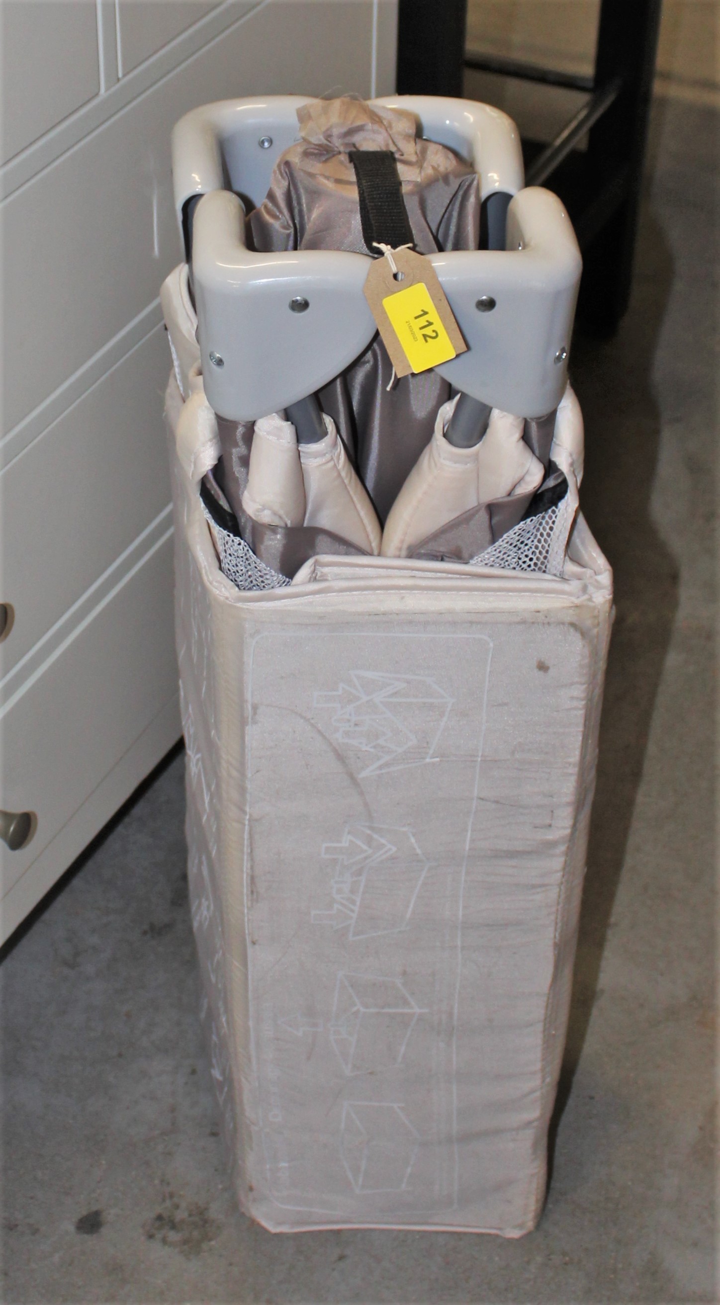 A Baby's Travel Cot Folded in Carry-Bag