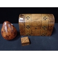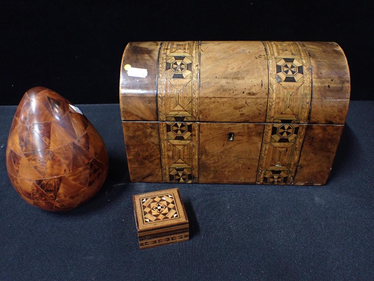 A VICTORIAN PARQUETRY DOMED TOP TEA CADDY (some damage) a Tunbridge Ware style box and a parquetry egg (3)
