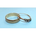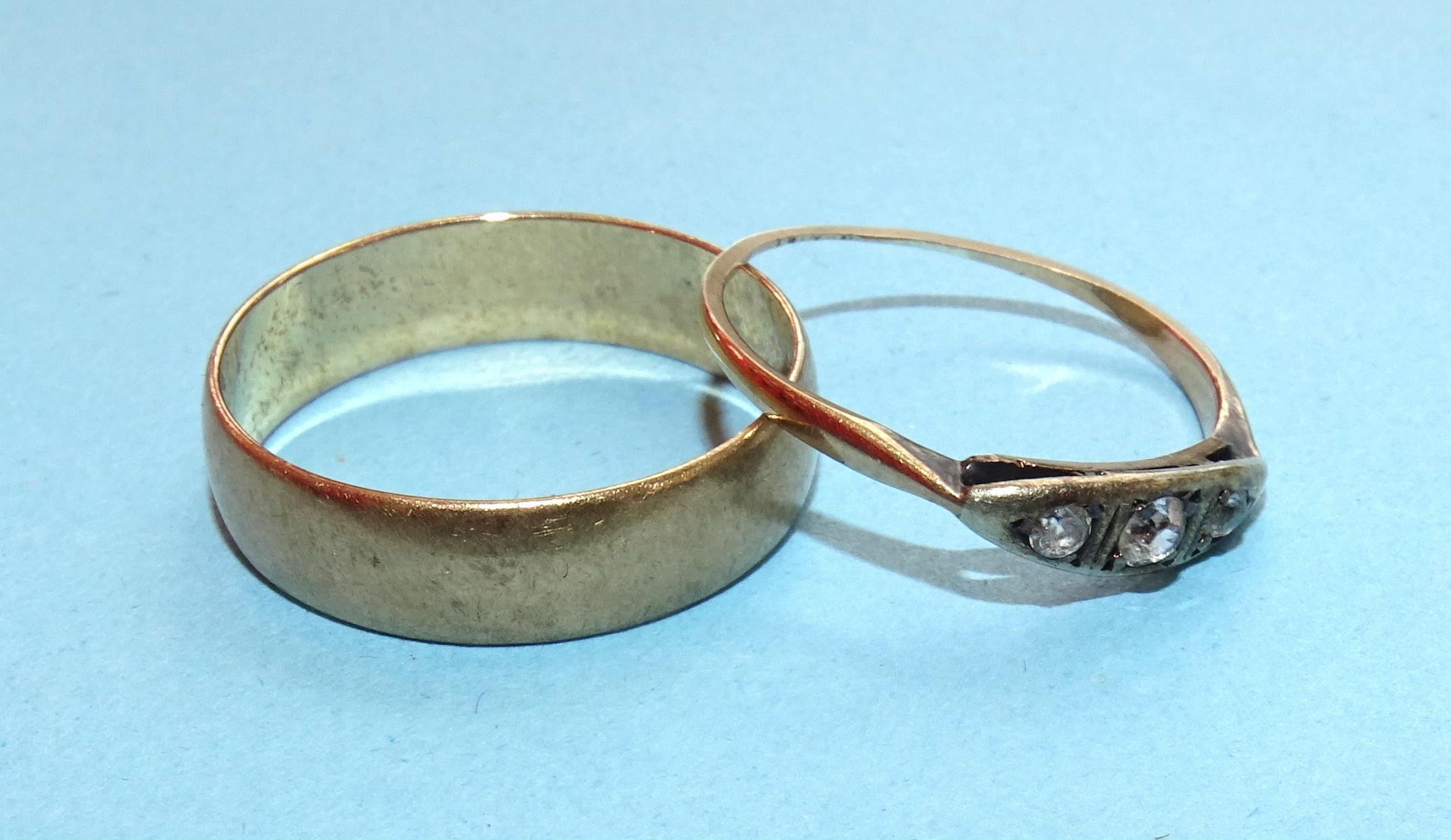 A 9ct gold wedding band, size R and a small ring set three paste stones, size L½, 3.5g.