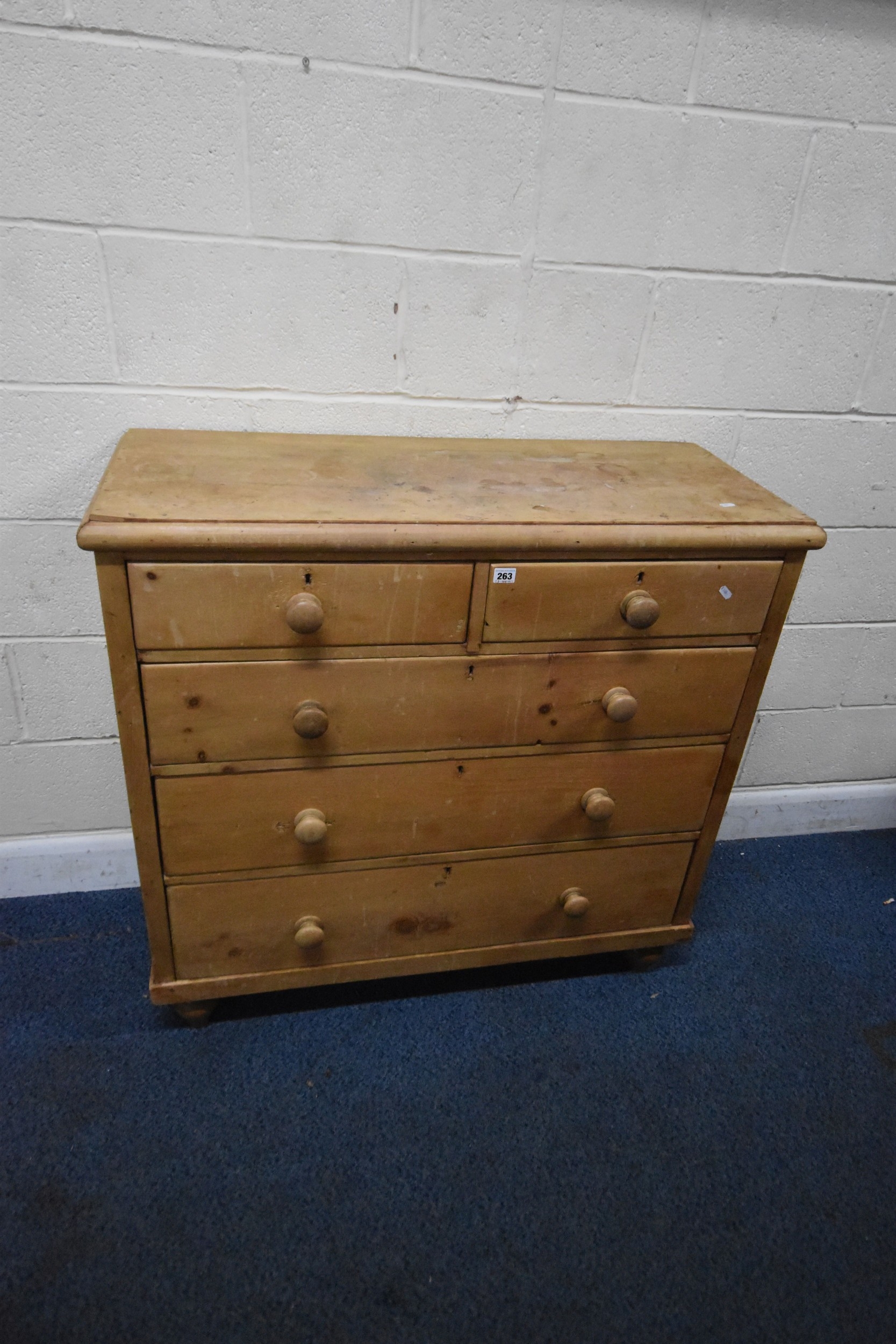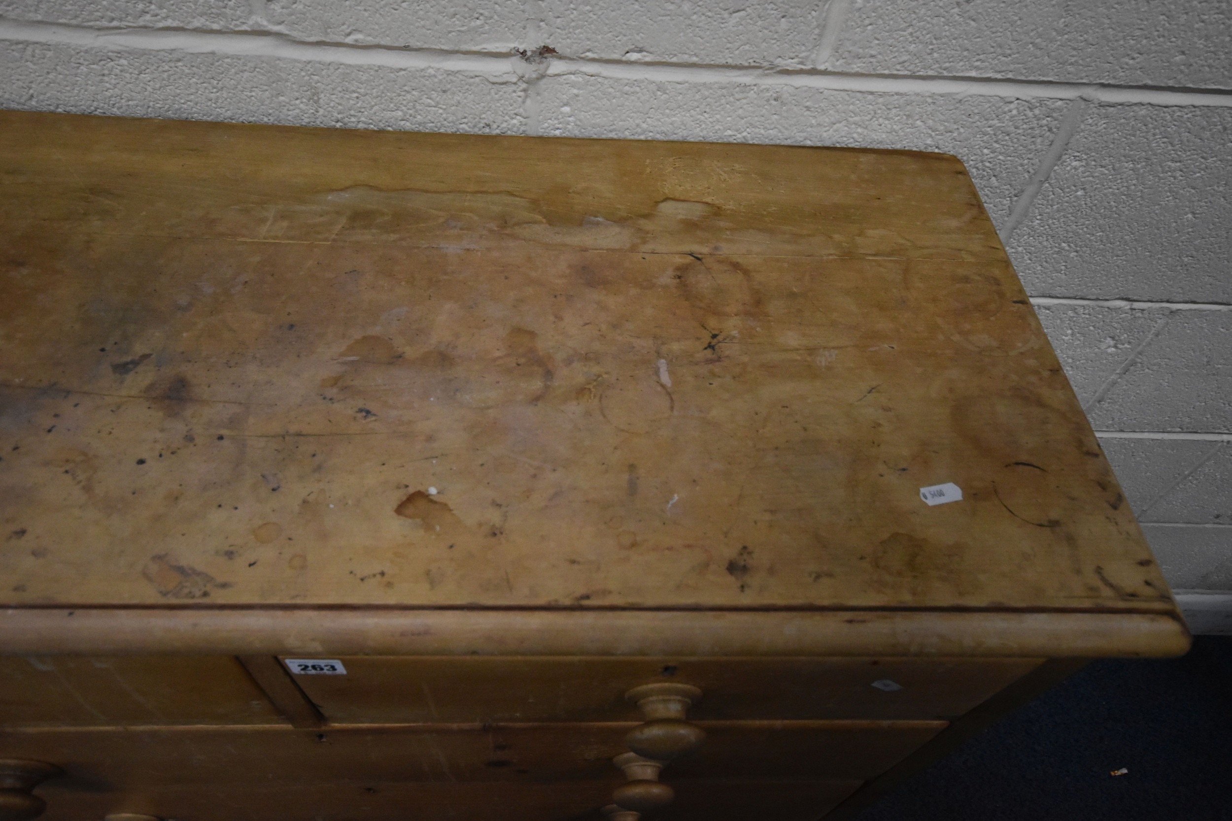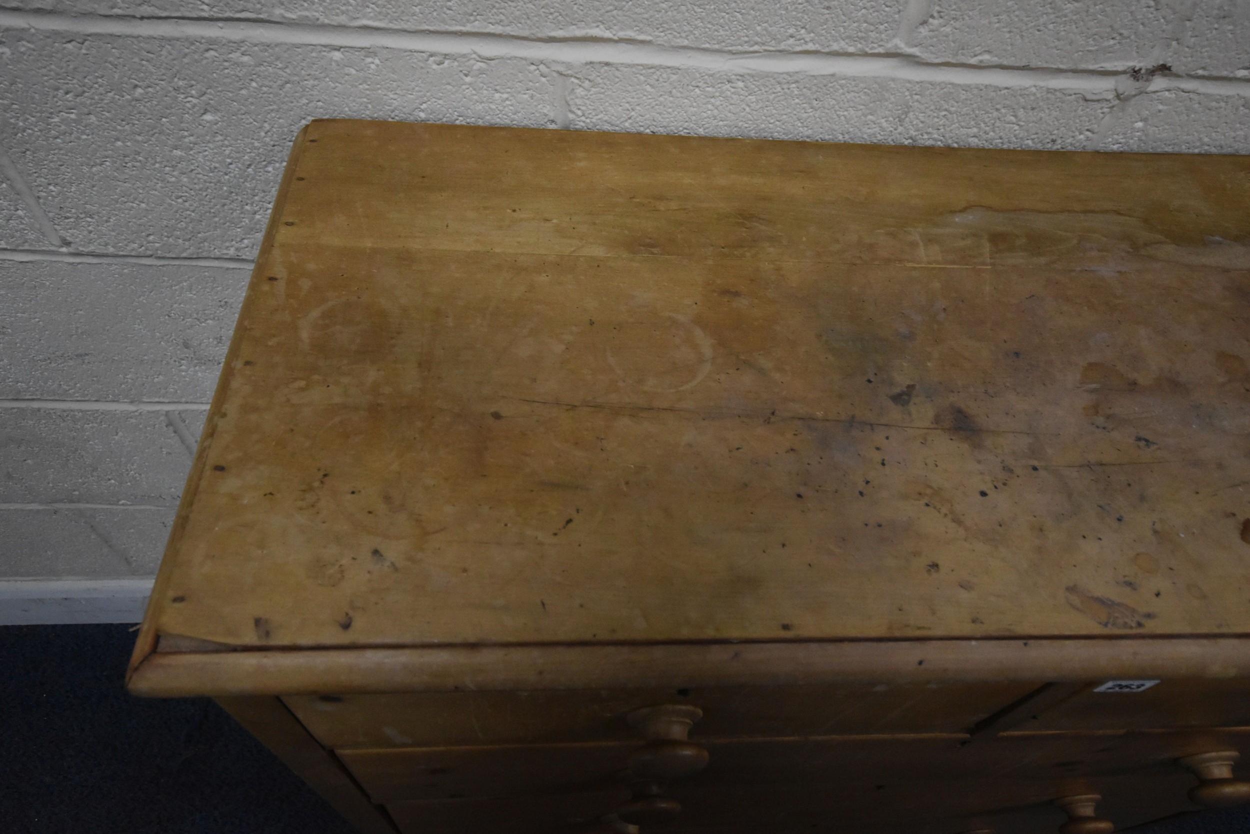 A 19TH CENTURY PINE CHEST OF TWO SHORT OVER THREE LONG DRAWERS, raised on turned feet, width 104cm x depth 47cm x height 102cm, condition report: historical marks, scuffs, stains, losses, discolouration, other wear and usage