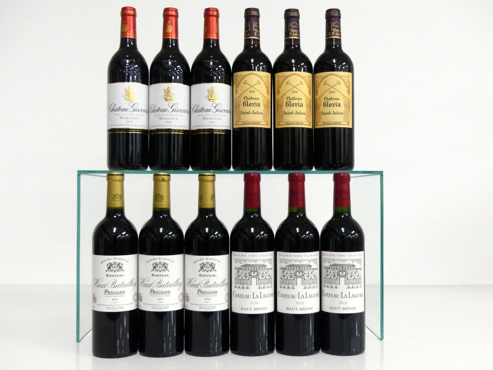 3 bts Ch. Giscours 2010 Margaux Grand Cru Classé hf/i.n 3 bts Ch. Gloria 2010 St-Julien i.n 3 bts Ch. Haut-Batailley 2010 Pauillac Grand Cru Classé hf/i.n 3 bts Ch. La Lagune 2010 Haut-Médoc Grand Cru Classé i.n Above 12 bottles