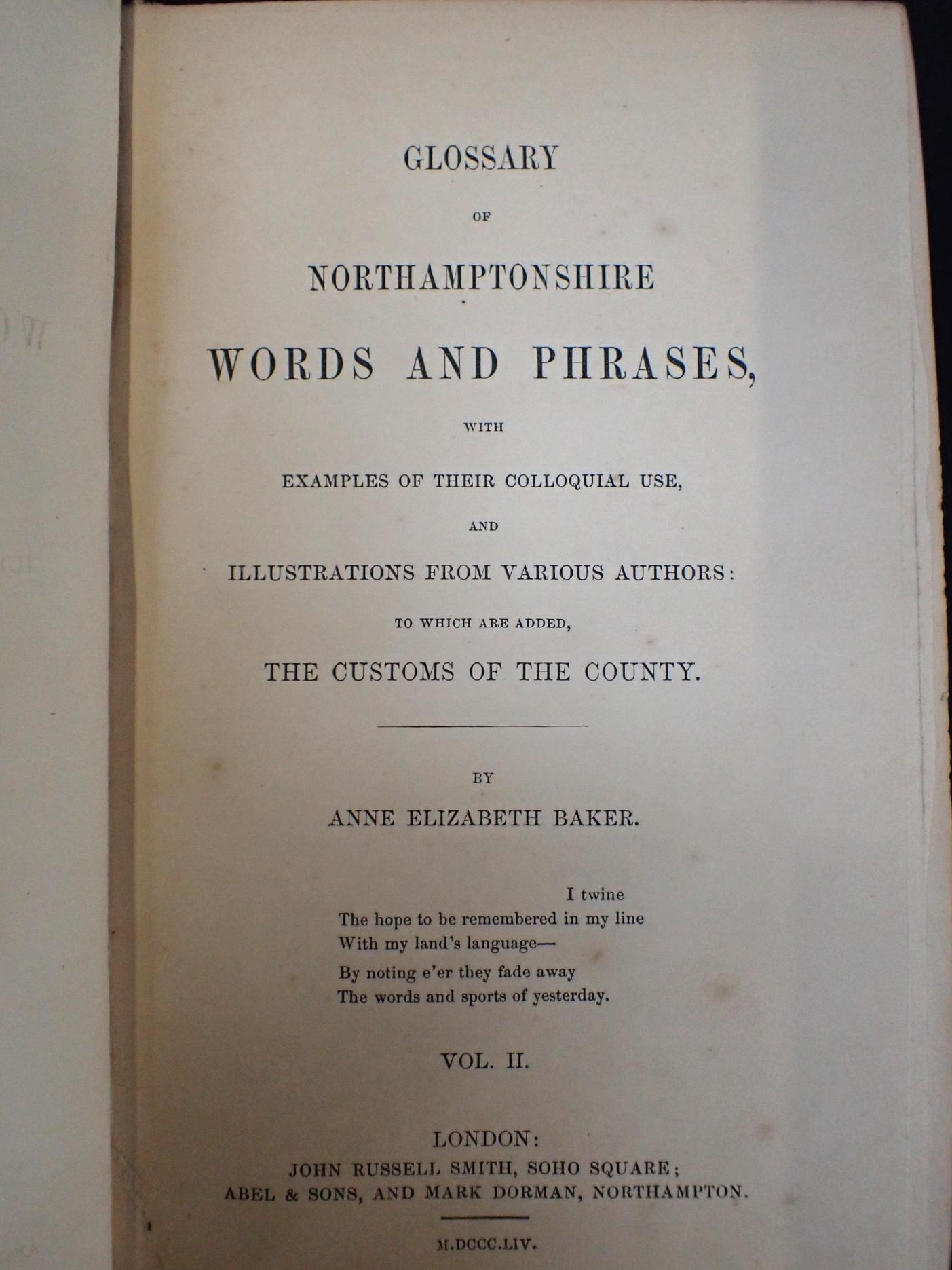 ANNE ELIZABETH BAKER: 'GLOSSARY OF NORTHAMPTONSHIRE WORDS AND PHRASES London, John Russell Smith 1854, 2 volumes