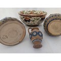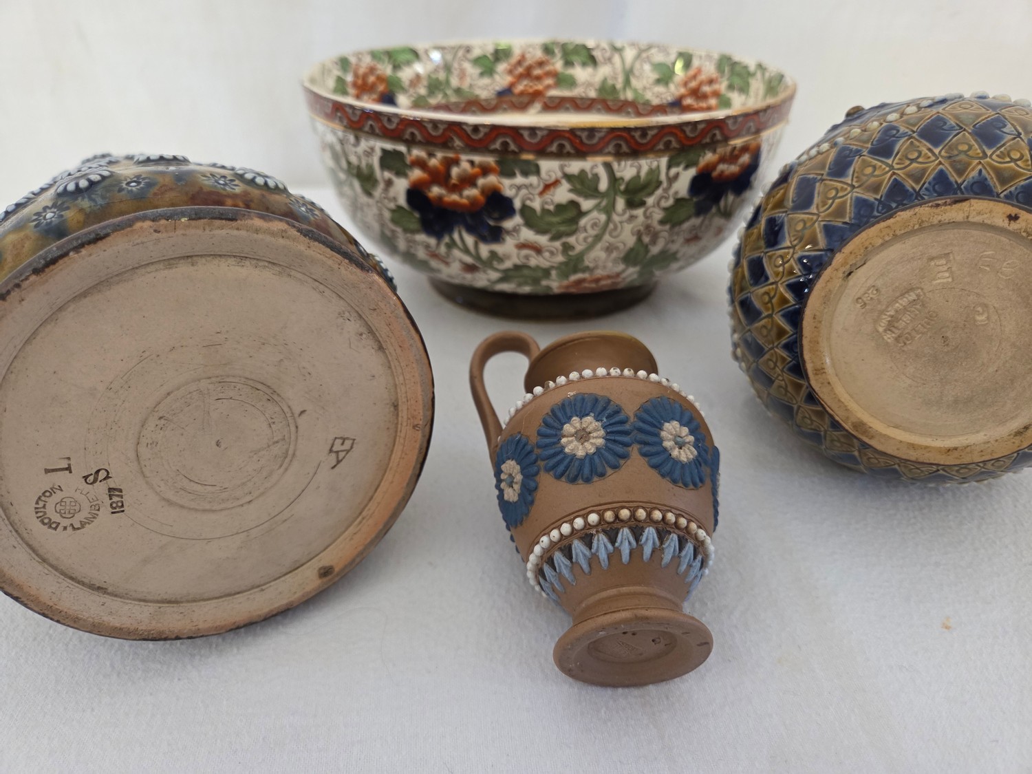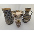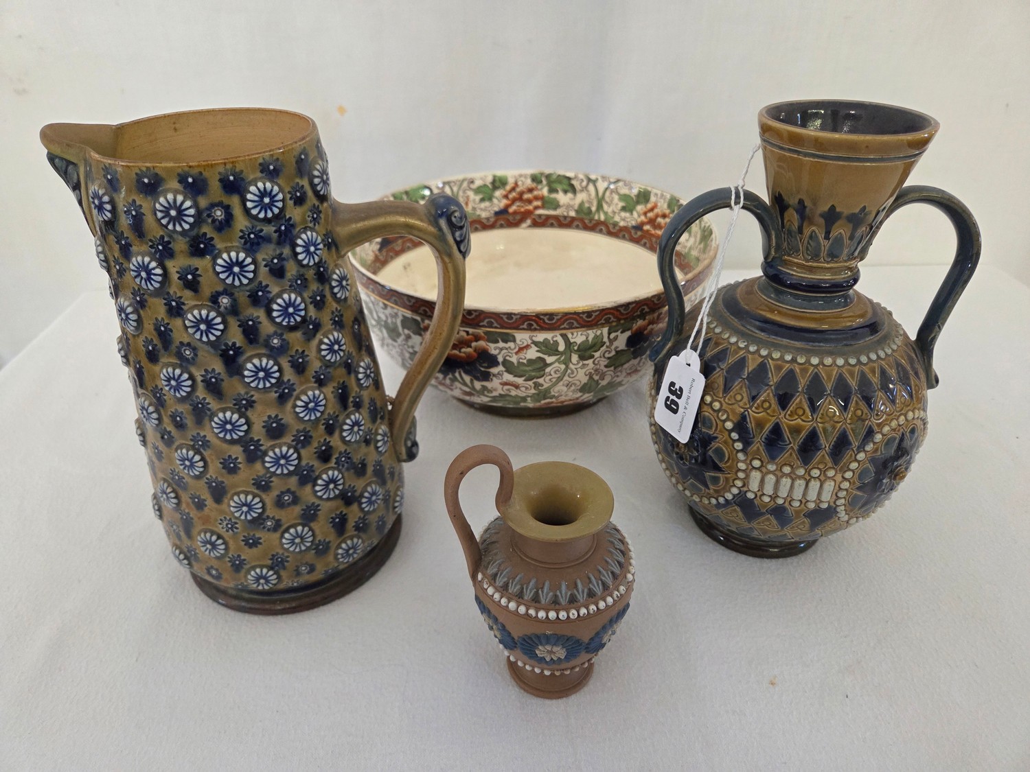 Two pieces of Doulton Lambeth stoneware incl. floral geometric jug and a 2-handled vase, small stone ewer and Royal Doulton floral bowl