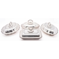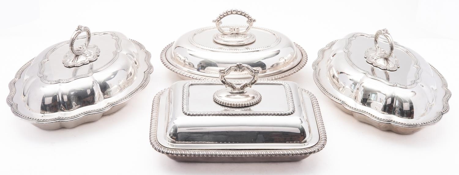 A pair of Victorian Sheffield plated entree dishes by Walker, Knowles & Co, Sheffield circa 1840, of shaped oval form, detachable handles, beaded rims and engraved initials, 32.5cm wide, with a later rectangular entree dish and cover with detachable handle, gadrooned rim, engraved crest and a silver plated oval dish, liner, cover and detachable handle with gadrooned rim, possibly re-plated, (4)
