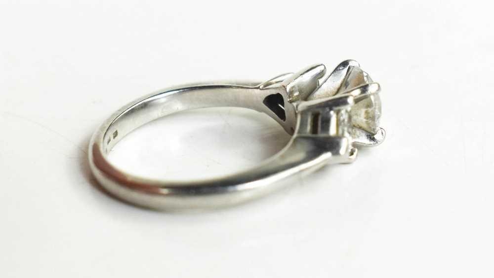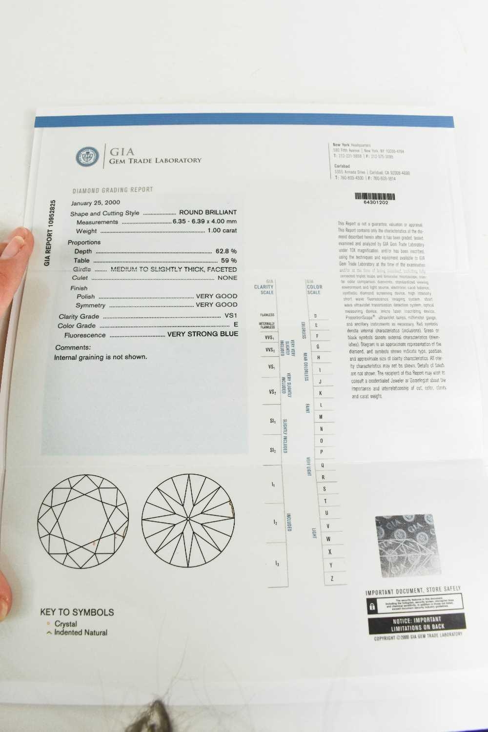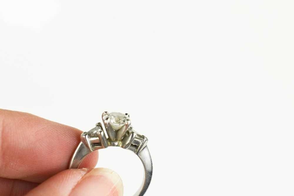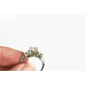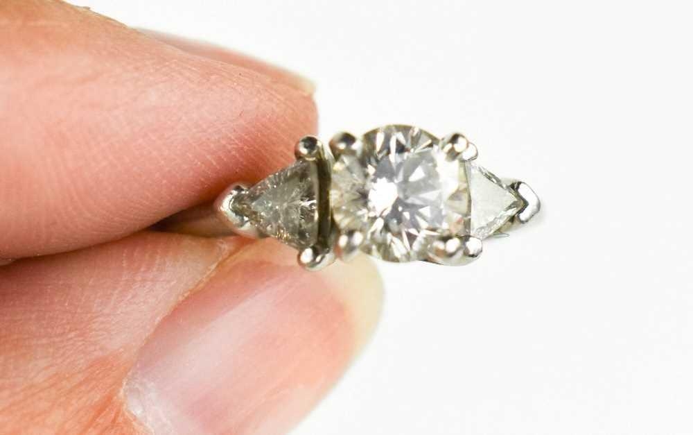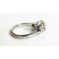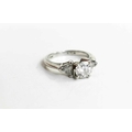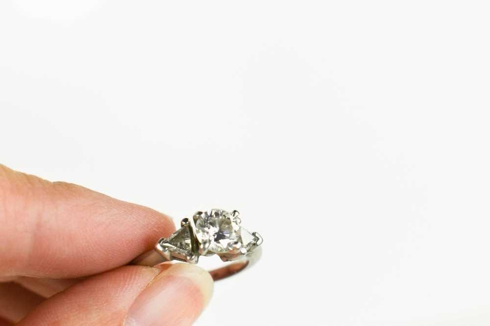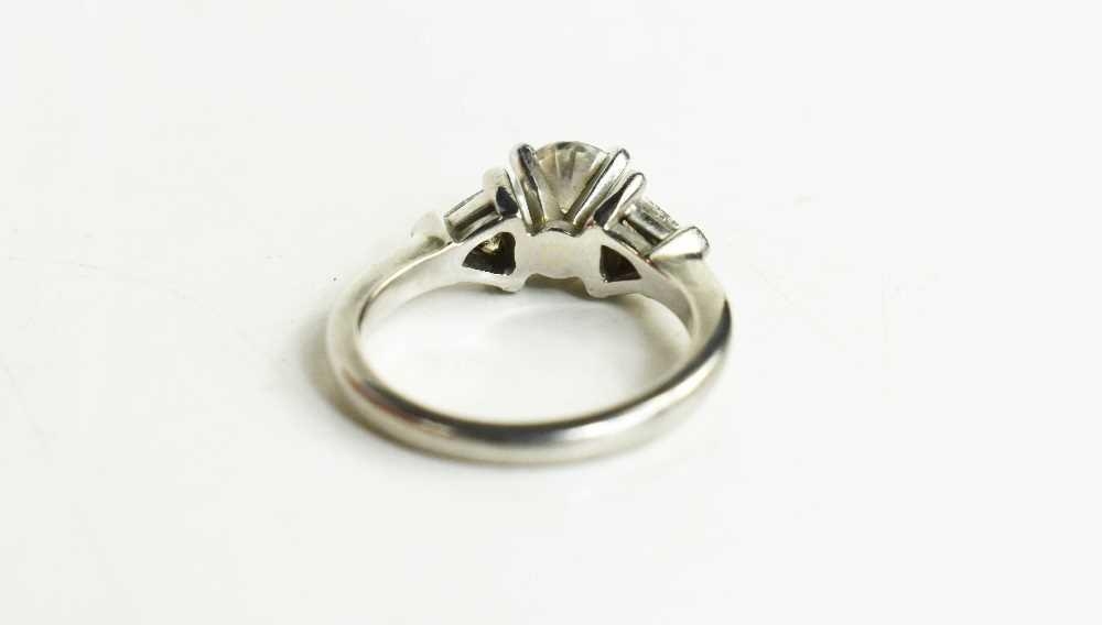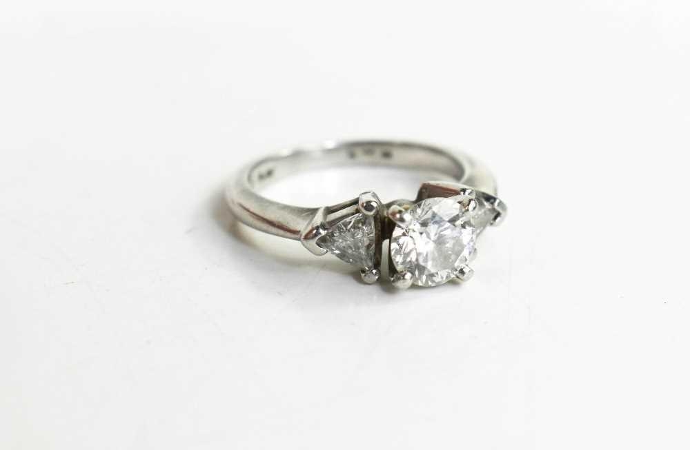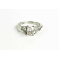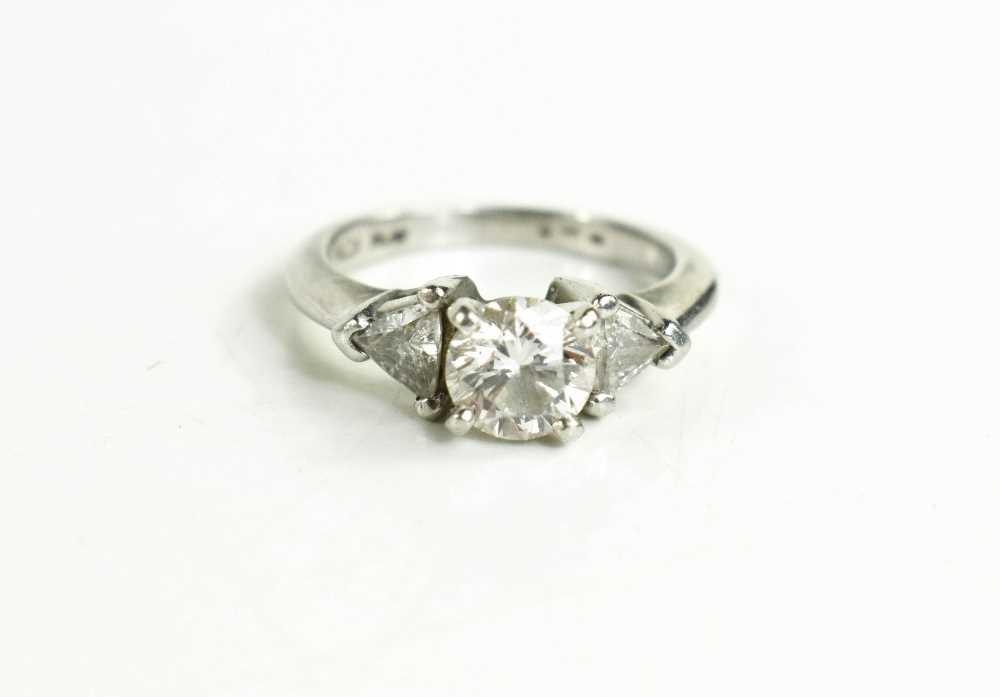 A platinum and diamond ring, composed of a central brilliant cut 1ct diamond, VS1, colour E, flanked by two trilliant cut diamonds, size K/L, with GIA certificate, 6.2g.